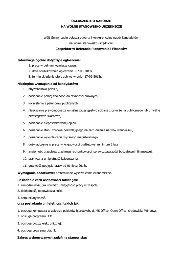OGŁOSZENIE O NABORZE NA WOLNE STANOWISKO URZĘDNICZE Wójt Gminy Lubin ogłasza otwarty i konkurencyjny nabór kandydatów na wolne stanowisko urzędnicze: Inspektor w Referacie Planowania i Finansów Informacje ogólne dotyczące ogłoszenia: 1. praca w pełnym wymiarze czasu, 2. data opublikowania ogłoszenia: 07-06-2013r. 3. termin składania ofert upływa w dniu: 17-06-2013r. Niezbędne wymagania od kandydatów: 1. obywatelstwo polskie, 2. posiadanie pełnej zdolności do czynności prawnych, 3. korzystanie z pełni praw publicznych, 4. nieskazanie prawomocne za umyślne przestępstwo ścigane z oskarżenia publicznego lub umyślne przestępstwo skarbowe, 5. posiadanie nieposzlakowanej opinii, 6. posiadanie stanu zdrowia pozwalającego na zatrudnienie na w/w stanowisku, 7. posiadanie wykształcenia wyższego magisterskiego, 8. doświadczenie w pracy w księgowości budżetowej minimum 3 lata 9. znajomość przepisów z zakresu rachunkowości, sprawozdawczości budżetowej i finansowej, 10. praktyczna umiejętność księgowania, 11. gotowość podjęcia pracy od 01 lipca 2013r. Wymagania dodatkowe: preferowane wykształcenie ekonomiczne. Posiadanie cech osobowości takich jak: 1. samodzielność, jak również umiejętność pracy w zespole, 2. dokładność, odpowiedzialność, 3. komunikatywność. oraz posiadanie umiejętności takich jak: 1. obsługa komputera w zakresie pakietów biurowych, tj. MS Office, Open Office, środowiska Windows, 2. obsługa programu LEX, 3. obsługa poczty elektronicznej, 4. obsługa programu płatnik. Zakres wykonywanych zadań na stanowisku: 1. prowadzenie całokształtu spraw związanych z ewidencją środków trwałych, 2. przygotowywanie dokumentów księgowych w zakresie naliczeń i przypisów i wpłat renty planistycznej, wpłat za zajęcie pasa drogowego oraz sprzedaży nieruchomości (monitorowanie terminowości wpłat, wystawianie wezwań do zapłaty, naliczanie odsetek, wystawianie tytułów wykonawczych), 3. egzekucja należności, egzekucja pozostałych należności (kontrahentów dla których prowadzone są imienne konta rozrachunkowe), w tym przygotowywanie dokumentów niezbędnych radcy prawnemu do egzekwowania należności na drodze postępowania sądowego, 4. przygotowywanie dokumentów księgowych w zakresie przypisów na kontach 221 (zajęcie pasa drogowego, renta planistyczna, sprzedaż nieruchomości) 226,840, 5. księgowanie raportów kasowych, 6. uzgadnianie sald kont zespołu 0 oraz kont: 101, 140, 221, 226, 400, 840 7. sporządzanie sprawozdania Rb-N, 8. obliczanie wynagrodzeń i innych świadczeń pracowniczych, 9. pobieranie zaliczek na podatek dochodowy od osób fizycznych i składek ZUS, 10. udział w wykonywaniu czynności inwentaryzacyjnych polegających w szczególności na uzgadnianiu sald z kontrahentami i weryfikacji stanów ewidencyjnych kont, 11. przygotowywanie i przekazywanie do archiwum dokumentów dotyczących zajmowanego stanowiska. Informacja o warunkach pracy na danym stanowisku: Praca w biurze na I piętrze, brak podjazdu oraz windy w budynku, praca związana z wykorzystaniem komputera i innych urządzeń biurowych. Wskaźnik zatrudnienia osób niepełnosprawnych w jednostce, w rozumieniu przepisów o rehabilitacji zawodowej i społecznej oraz zatrudnianiu osób niepełnosprawnych, w miesiącu poprzedzającym datę upublicznienia ogłoszenia jest niższy niż 6%. Wymagane dokumenty: 1. list motywacyjny, 2. CV, 3. oryginał kwestionariusza osobowego dla osoby ubiegającej się o zatrudnienie, 4. zaświadczenie lekarskie o braku przeciwwskazań zdrowotnych do pracy na danym stanowisku, 5. kserokopie dokumentów potwierdzających spełnienie wymagań niezbędnych oraz posiadanie dodatkowych kwalifikacji i umiejętności (poświadczone przez kandydata za zgodność z oryginałem), 6. oświadczenie o spełnieniu warunków określonych w pkt 2,3 i 4, niezbędnych wymagań od kandydatów 7. oświadczenie o wyrażeniu zgody na przetwarzanie na potrzeby postępowania konkursowego danych osobowych zawartych w ofercie pracy zgodnie z ustawą z dnia 29 sierpnia 1997 r. o ochronie danych osobowych ( Dz. U. z 2002 r. Nr 101, poz. 926 ze. zm.) oraz z ustawą z dnia 21 listopada 2008r. o pracownikach samorządowych ( Dz. U. z 2008r. Nr 223, poz. 1458 ze zm.). Miejsce składania ofert: Dokumenty aplikacyjne (w tym list motywacyjny i CV opatrzone klauzulą: "Wyrażam zgodę na przetwarzanie moich danych osobowych zawartych w ofercie pracy dla potrzeb niezbędnych do realizacji procesu naboru zgodnie z ustawą z dnia 29 sierpnia 1997 r. o ochronie danych osobowych") należy składać w siedzibie Urzędu Gminy lub przesłać pocztą w terminie do dnia 17 czerwca 2013r. (decyduje data wpływu aplikacji do Urzędu Gminy) na adres: Urząd Gminy w Lubinie ul. Władysława Łokietka 6 59-300 Lubin w zaklejonych kopertach z dopiskiem: "Nabór na wolne stanowisko urzędnicze: Inspektor w Referacie Planowania i Finansów” Uwaga: Aplikacje, które wpłyną do Urzędu po wyżej określonym terminie nie będą rozpatrywane. Informacja o wyniku naboru będzie umieszczona na stronie Internetowej Biuletynu Informacji Publicznej (www.bip.ug-lubin.dolnyslask.pl) oraz na tablicy informacyjnej w siedzibie Urzędu Gminy w Lubinie ul. Władysława Łokietka 6. Tożsamość osoby, która wytworzyła informację: Mariola Gaj- Łopaczyńska – Kierownik Referatu Organizacyjnego