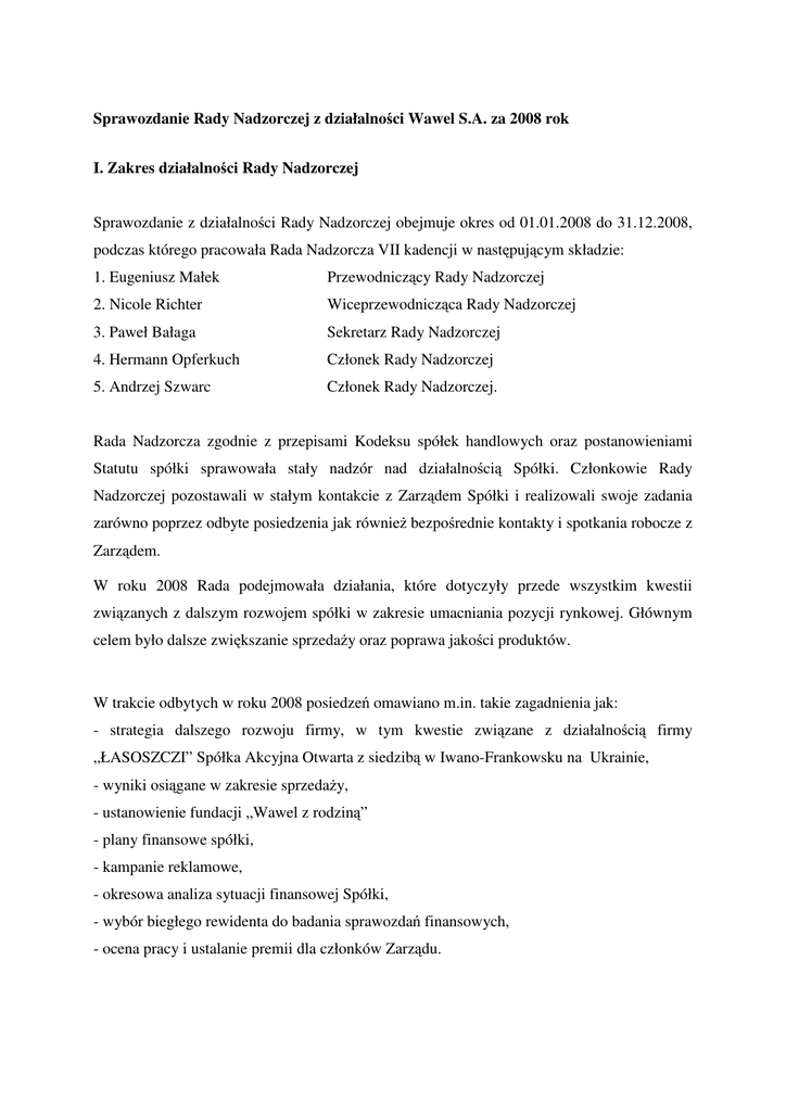 Sprawozdanie Rady Nadzorczej z działalności Wawel S.A. za 2008 rok I. Zakres działalności Rady Nadzorczej Sprawozdanie z działalności Rady Nadzorczej obejmuje okres od 01.01.2008 do 31.12.2008, podczas którego pracowała Rada Nadzorcza VII kadencji w następującym składzie: 1. Eugeniusz Małek Przewodniczący Rady Nadzorczej 2. Nicole Richter Wiceprzewodnicząca Rady Nadzorczej 3. Paweł Bałaga Sekretarz Rady Nadzorczej 4. Hermann Opferkuch Członek Rady Nadzorczej 5. Andrzej Szwarc Członek Rady Nadzorczej. Rada Nadzorcza zgodnie z przepisami Kodeksu spółek handlowych oraz postanowieniami Statutu spółki sprawowała stały nadzór nad działalnością Spółki. Członkowie Rady Nadzorczej pozostawali w stałym kontakcie z Zarządem Spółki i realizowali swoje zadania zarówno poprzez odbyte posiedzenia jak również bezpośrednie kontakty i spotkania robocze z Zarządem. W roku 2008 Rada podejmowała działania, które dotyczyły przede wszystkim kwestii związanych z dalszym rozwojem spółki w zakresie umacniania pozycji rynkowej. Głównym celem było dalsze zwiększanie sprzedaży oraz poprawa jakości produktów. W trakcie odbytych w roku 2008 posiedzeń omawiano m.in. takie zagadnienia jak: - strategia dalszego rozwoju firmy, w tym kwestie związane z działalnością firmy „ŁASOSZCZI” Spółka Akcyjna Otwarta z siedzibą w Iwano-Frankowsku na Ukrainie, - wyniki osiągane w zakresie sprzedaży, - ustanowienie fundacji „Wawel z rodziną” - plany finansowe spółki, - kampanie reklamowe, - okresowa analiza sytuacji finansowej Spółki, - wybór biegłego rewidenta do badania sprawozdań finansowych, - ocena pracy i ustalanie premii dla członków Zarządu. II. Ocena działalności Spółki. W roku 2008 za najistotniejsze zadania jakie postawiono przed Zarządem Spółki uznano: 1) poprawa jakości produktów, 2) utrzymanie właściwej płynności finansowej, 3) optymalizacja stanu zatrudnienia w Spółce. Na skutek podjętych działań realizacja wyznaczonych celów znalazła swoje odzwierciedlenie w następujących dokonaniach: 1) Osiągnięto dynamikę przychodów ze sprzedaży na poziomie 104,2 %. 2) W analizowanym okresie wypracowano dodatni wynik finansowy netto w kwocie 25.090 tys. zł. 3) W trakcie 2008 r. Spółka posiadała pełną zdolność do bieżącego regulowania zobowiązań. Należy uznać, iż wskaźniki płynności na 31.12.2008 r. osiągnęły zadowalający poziom (wskaźnik płynności bieżącej wynosił 1,98, a wskaźnik płynności szybki 1,56). 4) Na 31.12. 2008 r. Spółka posiadała jedną czynną umowę kredytową tj.: kredyt w rachunku bieżącym z maksymalnym limitem zadłużenia do 3 mln zł, przy czym saldo zadłużenia na koniec roku wynosiło 1,6 mln zł. Kredyt inwestycyjny, który był przeznaczony na sfinansowanie budowy nowego zakładu w Dobczycach został ostatecznie spłacony w dniu 22.02.2008 r. III. Sprawozdanie Rady Nadzorczej z badania sprawozdania finansowego za rok 2008 oraz sprawozdania Zarządu z działalności Spółki w 2008 r. Zarząd przedstawił Radzie Nadzorczej sprawozdanie finansowe za rok 2008, na które składa się w szczególności: - bilans sporządzony na dzień 31.12.2008 r., który po stronie aktywów i pasywów wykazuje sumę 226.280.203,87 zł, - rachunek zysków i strat za okres od 1.01.2008 r. do 31.12.2008 r. wykazujący zysk netto w kwocie 25.090.043,93 zł, - zestawienie zmian w kapitale własnym za rok obrotowy od 01.01.2008 do 31.12.2008, wykazujące wzrost kapitału własnego o kwotę 14.591.758,93zł, - rachunek przepływów pieniężnych za okres od 1.01.2008 r. do 31.12.2008 r., wykazujący zmniejszenie stanu środków pieniężnych o kwotę 443.254,77 zł, - dodatkowe informacje i objaśnienia, wraz z raportem biegłego rewidenta Roedl Audit Sp. z o.o. z badania powyższych dokumentów oraz opinię biegłego rewidenta. Rada Nadzorcza nie wniosła zastrzeżeń do powyższych dokumentów. Rada Nadzorcza stwierdza, że Sprawozdanie finansowe Wawel S.A. za rok 2008 sporządzone zostało zgodnie z przepisami prawa, a w szczególności ustawą o rachunkowości i zawiera pełną i wyczerpującą relację z działalności Spółki w roku 2008. Rada Nadzorcza zapoznała się z wnioskami Zarządu dotyczącymi przeznaczenia zysku osiągniętego przez Spółkę w 2008 r. i Rada Nadzorcza przychyla się do wniosku Zarządu odnośnie podziału kwoty wypracowanego zysku w następujący sposób: - na kapitał zapasowy w kwocie 13.092.003,93 zł, - na dywidendę 11.998.040,00 zł. IV. Podsumowanie Poprawne i zadowalające wyniki w zakresie sprzedaży, dodatni wynik finansowy i właściwa struktura bilansowa mająca swoje odzwierciedlenie w wielkościach wskaźników ekonomicznych pozwalają Radzie Nadzorczej pozytywnie ocenić działania Zarządu Spółki i wnioskować o udzielenie pokwitowania Zarządowi Wawel S.A. Przewodniczący Rady Nadzorczej Eugeniusz Małek Ocena Rady Nadzorczej Wawel S.A. sytuacji Spółki w 2008 roku z uwzględnieniem oceny systemu kontroli wewnętrznej i systemu zarządzania ryzykiem istotnym dla Spółki (Część III, pkt 1, ppkt 1 Dobrych Praktyk Spółek Notowanych na GPW) – projekt. Rada Nadzorcza pozytywnie ocenia sytuację Wawel S.A. w 2008 roku, a wyniki finansowe osiągnięte w roku 2008 uznaje za satysfakcjonujące. Dokonując analizy porównawczej w latach 2007 – 2008 należy stwierdzić, iż wyniki osiągnięte przez Spółkę w roku 2008 są lepsze od wyników za rok 2007. Rada Nadzorcza pozytywnie ocenia fakt, iż Spółka dokonała całkowitej, przedterminowej spłaty kredytu inwestycyjnego, dzięki czemu Spółka w zasadzie nie posiada zadłużenia kredytowego (poza kredytem w rachunku bieżącym). Rada Nadzorcza pozytywnie ocenia kontynuację procesu dalszych zmian w sferze produktowej. Chodzi tu przede wszystkim o działania zmierzające do ograniczenia listy asortymentowej w odniesieniu do produktów o niskim wolumenie sprzedaży, przy jednoczesnym ws