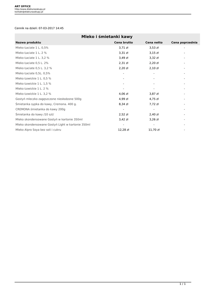 ART OFFICE http://www.dlabiurazakupy.pl [email protected] Cennik na dzień: 07-03-2017 14:45 Mleko i śmietanki kawy Nazwa produktu Cena brutto Cena netto Cena poprzednia Mleko Łaciate 1 L. 0,5% 3,71 zł 3,53 zł - Mleko Łaciate 1 L. 2 % 3,31 zł 3,15 zł - Mleko Łaciate 1 L. 3,2 % 3,49 zł 3,32 zł - Mleko Łaciate 0,5 L. 2% 2,31 zł 2,20 zł - Mleko Łaciate 0,5 L. 3,2 % 2,20 zł 2,10 zł - Mleko Łaciate 0,5L. 0,5% - - - Mleko Łowickie 1 L. 0,5 % - - - Mleko Łowickie 1 L. 1,5 % - - - Mleko Łowickie 1 L. 2 % - - - Mleko Łowickie 1 L. 3,2 % 4,06 zł 3,87 zł - Gostyń mleczko zagęszczone niesłodzone 500g 4,99 zł 4,75 zł - Śmietanka sypka do kawy, Cremona. 400 g. 8,34 zł 7,72 zł - - - - Śmietanka do kawy /10 szt/ 2,52 zł 2,40 zł - Mleko skondensowane Gostyń w kartonie 350ml 3,42 zł 3,26 zł - - - - 12,28 zł 11,70 zł - CREMONA śmietanka do kawy 200g Mleko skondensowane Gostyń Light w kartonie 350ml Mleko Alpro Soya bez soli i cukru 1/1 Powered by TCPDF (www.tcpdf.org)