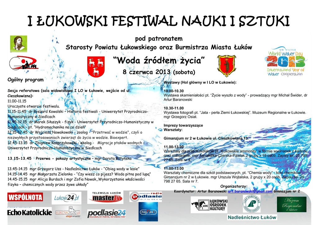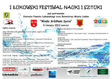 I ŁUKOWSKI FESTIWAL NAUKI I SZTUKI pod patronatem Starosty Powiatu Łukowskiego oraz Burmistrza Miasta Łuków “Woda źródłem życia” 8 czerwca 2013 (sobota) Ogólny program Sesja referatowa (sala widowiskowa I LO w Łukowie, wejście od ul. Cieszkowizna): 11.00-11.15 Uroczyste otwarcie festiwalu. 11.15-11.45 dr Ryszard Kowalski – Historia festiwali - Uniwersytet PrzyrodniczoHumanistyczny w Siedlcach 11.45-12.15 dr Marek Siłuszyk - fizyk - Uniwersytet Przyrodniczo-Humanistyczny w Siedlcach - pt. “Hydromechanika na co dzień” 12.15-12.45 dr Wojciesz Nowakowski - zoolog - "Przetrwać w wodzie", czyli o niezwykłych przystosowaniach zwierząt do życia w wodzie. Bioexpert. 12.45-13.15 dr Zbigniew Kasprzykowski - ekolog - Migracje ptaków wodnych Uniwersytet Przyrodniczo-Humanistyczny w Siedlcach 13.15-13.45 Przerwa - pokazy artystyczne – mgr Dorota Ratyńska 13.45-14.15 mgr Grzegorz Uss - Nadleśnictwo Łuków - “Obieg wody w lesie” 14.15-14.45 mgr Małgorzata Zielonka - “Czy wiesz co pijesz? Woda pitna pod lupą” 14.45-15.15 mgr Alicja Burdach i mgr Zofia Nowak,,Wykorzystanie właściwości fizyko – chemicznych wody przez żywe układy” Wystawy (Hol główny w I LO w Łukowie): 10.00-10.30 Wystawa skamieniałości pt. “Życie wyszło z wody” - prowadzący mgr Michał Świder, dr Artur Baranowski 10.30-11.00 Wystawa fotografi pt. “Jata - perła Ziemi Łukowskiej”. Muzeum Regionalne w Łukowie. mgr Grzegorz Osiał. Imprezy towarzyszące Warsztaty: Gimanzjum nr 2 w Łukowie ul. Cieszkowizna 13. 11.00-13.00 Warsztaty dla przedszkolaków pt. “Łukowskie ammonity” w formie wycinanek z kartonu oraz malowanie. mgr Agnieszka Czerska-Pawlak 2 grupy x 15 osób. Zapisy tel. 25 798 27 65. Sala nr 4. 11.00-13.00 Warsztaty chemiczne dla szkół podstawowych. pt. “Chemia wody” - koło chemików Gimanzjum nr 2 w Łukowie. mgr Urszula Wojtalska, 2 grupy x 20 osób. Zapisy tel. 25 798 27 65. Sala nr 7. Organizatorzy: Koordynator: Artur Baranowski [email protected] Gimnazjum nr 2