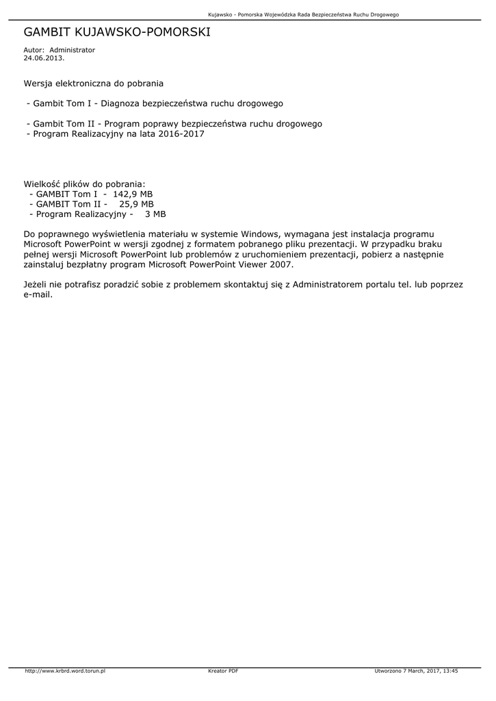 Kujawsko - Pomorska Wojewódzka Rada Bezpieczeństwa Ruchu Drogowego GAMBIT KUJAWSKO-POMORSKI Autor: Administrator 24.06.2013. Wersja elektroniczna do pobrania - Gambit Tom I - Diagnoza bezpieczeństwa ruchu drogowego - Gambit Tom II - Program poprawy bezpieczeństwa ruchu drogowego - Program Realizacyjny na lata 2016-2017 Wielkość plików do pobrania: - GAMBIT Tom I - 142,9 MB - GAMBIT Tom II - 25,9 MB - Program Realizacyjny - 3 MB Do poprawnego wyświetlenia materiału w systemie Windows, wymagana jest instalacja programu Microsoft PowerPoint w wersji zgodnej z formatem pobranego pliku prezentacji. W przypadku braku pełnej wersji Microsoft PowerPoint lub problemów z uruchomieniem prezentacji, pobierz a następnie zainstaluj bezpłatny program Microsoft PowerPoint Viewer 2007. Jeżeli nie potrafisz poradzić sobie z problemem skontaktuj się z Administratorem portalu tel. lub poprzez e-mail. http://www.krbrd.word.torun.pl Kreator PDF Utworzono 7 March, 2017, 13:45