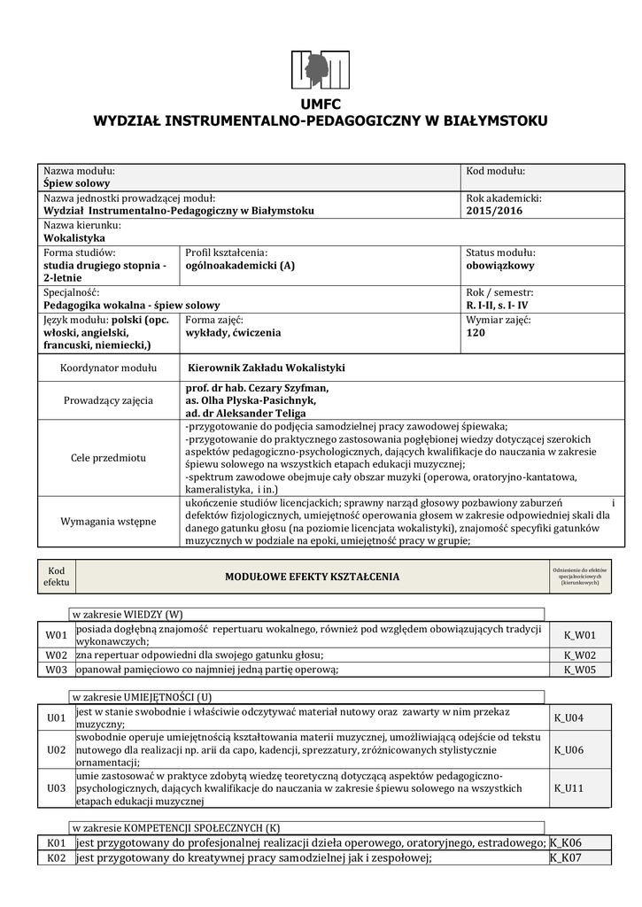 UMFC WYDZIAŁ INSTRUMENTALNO-PEDAGOGICZNY W BIAŁYMSTOKU Nazwa modułu: Śpiew solowy Nazwa jednostki prowadzącej moduł: Wydział Instrumentalno-Pedagogiczny w Białymstoku Nazwa kierunku: Wokalistyka Forma studiów: Profil kształcenia: studia drugiego stopnia ogólnoakademicki (A) 2-letnie Specjalność: Pedagogika wokalna - śpiew solowy Język modułu: polski (opc. Forma zajęć: włoski, angielski, wykłady, ćwiczenia francuski, niemiecki,) rosyjski, ffffrancuski) Koordynator modułu Kierownik Zakładu Wokalistyki Prowadzący zajęcia Cele przedmiotu Wymagania wstępne Kod efektu Kod modułu: Rok akademicki: 2015/2016 Status modułu: obowiązkowy Rok / semestr: R. I-II, s. I- IV Wymiar zajęć: 120 prof. dr hab. Cezary Szyfman, as. Olha Plyska-Pasichnyk, ad. dr Aleksander Teliga -przygotowanie do podjęcia samodzielnej pracy zawodowej śpiewaka; -przygotowanie do praktycznego zastosowania pogłębionej wiedzy dotyczącej szerokich aspektów pedagogiczno-psychologicznych, dających kwalifikacje do nauczania w zakresie śpiewu solowego na wszystkich etapach edukacji muzycznej; -spektrum zawodowe obejmuje cały obszar muzyki (operowa, oratoryjno-kantatowa, kameralistyka, i in.) ukończenie studiów licencjackich; sprawny narząd głosowy pozbawiony zaburzeń i defektów fizjologicznych, umiejętność operowania głosem w zakresie odpowiedniej skali dla danego gatunku głosu (na poziomie licencjata wokalistyki), znajomość specyfiki gatunków muzycznych w podziale na epoki, umiejętność pracy w grupie; MODUŁOWE EFEKTY KSZTAŁCENIA w zakresie WIEDZY (W) posiada dogłębną znajomość repertuaru wokalnego, również pod względem obowiązujących tradycji W01 wykonawczych; W02 zna repertuar odpowiedni dla swojego gatunku głosu; W03 opanował pamięciowo co najmniej jedną partię operową; w zakresie UMIEJĘTNOŚCI (U) jest w stanie swobodnie i właściwie odczytywać materiał nutowy oraz zawarty w nim przekaz U01 muzyczny; swobodnie operuje umiejętnością kształtowania materii muzycznej, umożliwiającą odejście od tekstu U02 nutowego dla realizacji np. arii da capo, kadencji, sprezzatury, zróżnicowanych stylistycznie ornamentacji; umie zastosować w praktyce zdobytą wiedzę teoretyczną dotyczącą aspektów pedagogicznoU03 psychologicznych, dających kwalifikacje do nauczania w zakresie śpiewu solowego na wszystkich etapach edukacji muzycznej Odniesienie do efektów specjalnościowych (kierunkowych) K_W01 K_W02 K_W05 K_U04 K_U06 K_U11 w zakresie KOMPETENCJI SPOŁECZNYCH (K) K01 jest przygotowany do profesjonalnej realizacji dzieła operowego, oratoryjnego, estradowego; K_K06 K02 jest przygotowany do kreatywnej pracy samodzielnej jak i zespołowej; K_K07 TREŚCI PROGRAMOWE MODUŁU Semestr I-IV Semestr I 1. praca nad rozwojem techniki wokalnej i poszerzeniem środków interpretacji artystycznej; 2. praca nad stylistyką i ekspresją muzyczną w wybranych utworach wokalnych; Semestr II -IV 3. kształtowanie osobowości artystycznej oraz kontroli stresu w prezentacji publicznej; 4. gruntowne opanowanie techniki wokalnej w praktyce wykonawczej dla danego gatunku głosu; 5. kształtowanie osobowości artystycznej w prezentacji całości recitalu lub prezentowanej większej formy wokalnej (cykl, kantata, opera); Treści programowe wzajemnie się przenikają, większość z nich obecna jest na każdym etapie kształcenia. Dobór treści programowych zależy od szeroko rozumianych możliwości studenta. Liczba godzin Liczba godzin 30 Liczba godzin 3 x 30 Metody kształcenia 1. wykład problemowy i praktyczny – w oparciu o ćwiczenia głosowe indywidualne (możliwa rejestracja audio-video w celu analizy porównawczej) 2. praca z tekstem i dyskusja 3. analiza muzyczna i treściowa utworów w oparciu o współpracę z akompaniatorem 4. rozwiązywanie zadań artystycznych 5. projekt, prezentacja 6. indywidualizacja interpretacji dzieła 7. współpraca z zespołem wykonawców Weryfikacja efektów kształcenia Metody weryfikacji Nr efektu1 1. zaliczenie 2. egzamin 3. koncerty i prezentacje solowe 4. udział w konkursach i kursach 5. udział w projektach Zakładu Wokalistyki - indywidualne i zbiorowe W01, W02, W03, U01, U02, U03, K01, K02 W01, W02, W03, U01, U02, U03, W01, W02, W03, U01, U02, U03, K01, K02 W01, W02, W03, U01, U02, U03, K01, K02 W01, W02, W03, U01, U02, U03, K01, K02 Korelacja efektów kształcenia z treściami i metodami kształcenia oraz metodami ich weryfikacji 2 Nr efektu kształcenia W01 W02 W03 U01 U02 U03 K01 K02 Treści kształcenia 2 1, 4; 1, 3, 5; 1, 2; 1, 2, 3, 4; 1, 2, 3, 4, 5; 1, 2, 3, 4, 5; 1, 3, 5; Metody kształcenia 1, 2, 3, 6; 1, 2, 3, 4; 1, 2, 3, 4, 5, 6, 7; 2, 3; 1, 2, 3, 4; 1, 2, 3, 4, 5, 6, 7; 1, 2, 3, 4, 5, 6, 7; 1, 2, 3, 4, 5; Metody weryfikacji 1, 2, 3, 4, 5; 1, 2, 3, 4, 5; 1, 2, 3, 4, 5; 1, 2, 3, 4, 5; 1, 2, 3, 4, 5; 1, 2; 3, 5; 1, 2, 3, 4, 5; Forma zaliczenia Zaliczenie przedmiotu uwarunkowane jest uczęszczaniem na zajęcia – kontrola obecności oraz osiągnięciem wszystkich założonych efektów kształcenia (w minimalnym akceptowalnym stopniu – w wysokości >50%). Po I semestrze - kolokwium, po II semestrze - egzamin, po III semestrze - kolokwium, egzamin, po IV semestrze -zaliczenie Literatura podstawowa G. Concon – 50 ćwiczeń op.9 (PWM; 1964) T. Hauptner – Ćwiczenia dla kształcenia biegłości głosu (PWM Kraków; 1949) B. Lutgen – Wokalizy (PWM Kraków; 1948) 1 2 W. Troschel – Szkoła śpiewu (Gebethner i Wolf) N. Vaccai – Praktyczna metoda śpiewu włoskiego ( PWM) oraz zbiory pieśni i arii polskich i zagranicznych Literatura uzupełniająca T. Zalewski – Cztery zasadnicze systemy w procesie nauczania śpiewu solowego wg. R.Husson`a (COPSA MP z. 84; 1965) M. Kubala – Technika wokalna i interpretacja – na podstawie Opinioni de`cantori... P.F. Tosiego (AMFC; Wydział Wokalny - 2003) Fr. Martienssen-Lohmann - Kształcenie głosu śpiewaka M. Marzecka-Kowalska - Wybrane zagadnienia z metodyki nauczania śpie