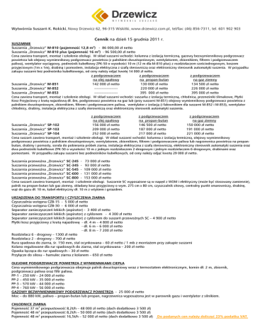 Wytwórnia Suszarń K. Rokicki, Nowy Drzewicz 62, 96-315 Wiskitki, www.drzewicz.com.pl, tel/fax: (46) 856-7311, tel. 601 902 903 Cennik na dzień 15 grudnia 2011 r. SUSZARNIE Suszarnia „Drzewicz” M-810 (pojemność 12,8 m3) - 86 000,00 zł netto Suszarnia „Drzewicz” M-810 plus (pojemność 16 m3) - 96 500,00 zł netto Cena zawiera transport, montaż i szkolenie obsługi. W skład suszarni wchodzi: kolumna z izolacją termiczną, gazowy bezwymiennikowy podgrzewacz powietrza lub olejowy wymiennikowy podgrzewacz powietrza (z palnikiem dwustopniowym, wentylatorem, zbiornikiem, filtrem i podgrzewaczem paliwa), wentylator wyciągowy, podnośnik kubełkowy ZPK-50 o wysokości 10 m (12 m dla M-810 plus) z rozdzielaczem sześciodrogowym, koszem przyjęciowym (1m x 1m), drabiną i pomostem, instalacja elektryczna z szafą sterowniczą oraz elektroniczny sterownik automatyki suszenia. W przypadku zakupu suszarni bez podnośnika kubełkowego, od ceny należy odjąć kwotę 14 000 zł netto. z podgrzewaczem na olej opałowy 142 000 zł netto ------------------------------------- Suszarnia „Drzewicz” M-851 Suszarnia „Drzewicz” M-852 Suszarnia „Drzewicz” M-853 z podgrzewaczem na propan-butan 130 000 zł netto 220 000 zł netto 395 000 zł netto z podgrzewaczem na gaz ziemny 134 500 zł netto 226 000 zł netto 395 000 zł netto Cena zawiera transport, montaż i szkolenie obsługi. W skład suszarni wchodzi: suszarka z izolacją termiczną, chłodnica, przenośniki ślimakowe, Płytki Kosz Przyjęciowy z kratą najazdową dł. 8m, podgrzewacz powietrza na gaz lub (przy suszarni M-851) olejowy wymiennikowy podgrzewacz powietrza z palnikiem dwustopniowym, zbiornikiem, filtrem i podgrzewaczem paliwa, wentylator z izolacją (i falownikiem dla suszarni M-852 i M-853), wentylator chłodnicy, drabiny, instalacja elektryczna z szafą sterowniczą oraz elektroniczny sterownik automatyki suszenia. z podgrzewaczem na olej opałowy 156 000 zł netto 209 000 zł netto 252 000 zł netto Suszarnia „Drzewicz” SP-102 Suszarnia „Drzewicz” SP-103 Suszarnia „Drzewicz” SP-104 z podgrzewaczem na propan-butan 146 500 zł netto 187 000 zł netto 217 000 zł netto z podgrzewaczem na gaz ziemny 150 000 zł netto 191 000 zł netto 221 000 zł netto Cena suszarń zawiera transport, montaż i szkolenie obsługi. W skład suszarni wchodzi: kolumna z izolacją termiczną, olejowy wymiennikowy podgrzewacz powietrza z palnikiem dwustopniowym, wentylatorem, zbiornikiem, filtrem i podgrzewaczem paliwa lub nagrzewnica powietrza na propanbutan, drabiny i pomosty, sonda do pobierania próbek ziarna, instalacja elektryczna z szafą sterowniczą, elektroniczny sterownik automatyki suszenia oraz dwa podnośniki kubełkowe ZPK-50 o wysokości 10 m z jednym rozdzielaczem 2-drogowym i jednym rozdzielaczem 6-drogowym, drabinami oraz pomostami. W przypadku zakupu suszarni bez podnośników kubełkowych, od ceny należy odjąć kwotę 29 000 zł netto. Suszarnia przewoźna „Drzewicz” SC-245 Suszarnia przewoźna „Drzewicz” SC-345 Suszarnia przewoźna „Drzewicz” SC-545 Suszarnia przewoźna „Drzewicz” SC-600 Suszarnia przewoźna „Drzewicz” SC-800 - 73 000 zł netto 93 000 zł netto 109 000 zł netto 131 000 zł netto 153 000 zł netto Cena suszarń zawiera transport, montaż i szkolenie obsługi. Suszarnie SC wyposażone są w napęd z WOM i elektryczny (może być stosowany zamiennie), palnik na propan-butan lub gaz ziemny, składany kosz przyjęciowy o wym. 275 cm x 80 cm, czyszczalnik sitowy, centralny punkt smarowniczy, drabinę, wąż do gazu dł. 10 m, kabel elektryczny dł. 10 m z wtykiem i gniazdem. URZĄDZENIA DO TRANSPORTU I CZYSZCZENIA ZIARNA Czyszczalnia wstępna CZB-15 - 5 000 zł netto Czyszczalnia wstępna CZB-30 - 6 000 zł netto Separator zanieczyszczeń lekkich (aspirator) - 3 400 zł netto Separator zanieczyszczeń lekkich (aspirator) z cyklonem - 4 300 zł netto Separator zanieczyszczeń lekkich (aspirator) z cyklonem do suszarń przewoźnych SC – 4 900 zł netto Płytki kosz przyjęciowy z kratą najazdową - dł. 4 m – 4 800 zł netto - dł. 6 m – 6 000 zł netto - dł. 8 m – 7 200 zł netto Rozdzielacz 6 - drogowy – 1300 zł netto Rozdzielacz 2 - drogowy – 700 zł netto Rura spadowa do ziarna, śr. 150 mm, stal ocynkowana – 60 zł netto / 1 mb z montażem przy zakupie suszarni Kolano regulowane dla rur spadowych do ziarna, stal ocynkowana – 200 zł netto Opaska łącząca do rur spadowych – 30 zł netto Przyłącze do silosu – hamulec ziarna z kolanem – 650 zł netto OLEJOWE PODGRZEWACZE POWIETRZA Z WYMIENNIKAMI CIEPŁA Cena wymiennikowego podgrzewacza obejmuje palnik dwustopniowy wraz z termostatem elektronicznym, komin dł. 2 m, zbiornik, podgrzewacz paliwa oraz filtr paliwa. PP-1 – 250 kW – 24 000 zł netto PP-2 – 450 kW – 35 000 zł netto PP-3 – 570 kW – 44 000 zł netto PP-4 – 760 kW – 56 000 zł netto GAZOWY BEZWYMIENNIKOWY PODGRZEWACZ POWIETRZA - 25 000 zł netto Moc – do 880 kW, paliwo – propan-butan lub propan, nagrzewnica wyposażona jest w parownik gazu i wentylator z silnikiem. CHŁODNICE ZIARNA Pojemność 37 m3 przepustowość 8,2t/h – 48 000 zł netto (dach dodatkowo 3 500 zł) Pojemność 48 m3 przepustowość 8,2t/h – 50 000 zł netto (dach dodatkowo 3 500 zł) Pojemność 48 m3 przepustowość 16,5t/h – 52 000 zł netto (dach dodatkowo 3 500 zł) Do podanych cen należy doliczyć 23% podatku VAT.