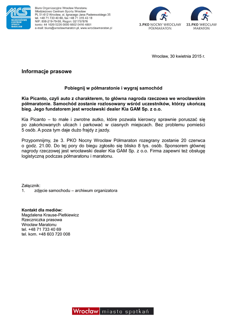 Wrocław, 30 kwietnia 2015 r. Informacje prasowe Pobiegnij w półmaratonie i wygraj samochód Kia Picanto, czyli auto z charakterem, to główna nagroda rzeczowa we wrocławskim półmaratonie. Samochód zostanie rozlosowany wśród uczestników, którzy ukończą bieg. Jego fundatorem jest wrocławski dealer Kia GAM Sp. z o.o. Kia Picanto – to małe i zwrotne autko, które pozwala kierowcy sprawnie poruszać się po zakorkowanych ulicach i parkować w ciasnych miejscach. Bez problemu pomieści 5 osób. A poza tym daje dużo frajdy z jazdy. Przypomnijmy, że 3. PKO Nocny Wrocław Półmaraton rozegrany zostanie 20 czerwca o godz. 21.00. Do tej pory do biegu zgłosiło się blisko 8 tys. osób. Sponsorem głównej nagrody rzeczowej jest wrocławski dealer Kia GAM Sp. z o.o. Firma zapewni też obsługę logistyczną podczas półmaratonu i maratonu. Załącznik: 1. zdjęcie samochodu – archiwum organizatora Kontakt dla mediów: Magdalena Krause-Pietkiewicz Rzeczniczka prasowa Wrocław Maratonu tel. +48 71 733 40 69 tel. kom. +48 603 720 008