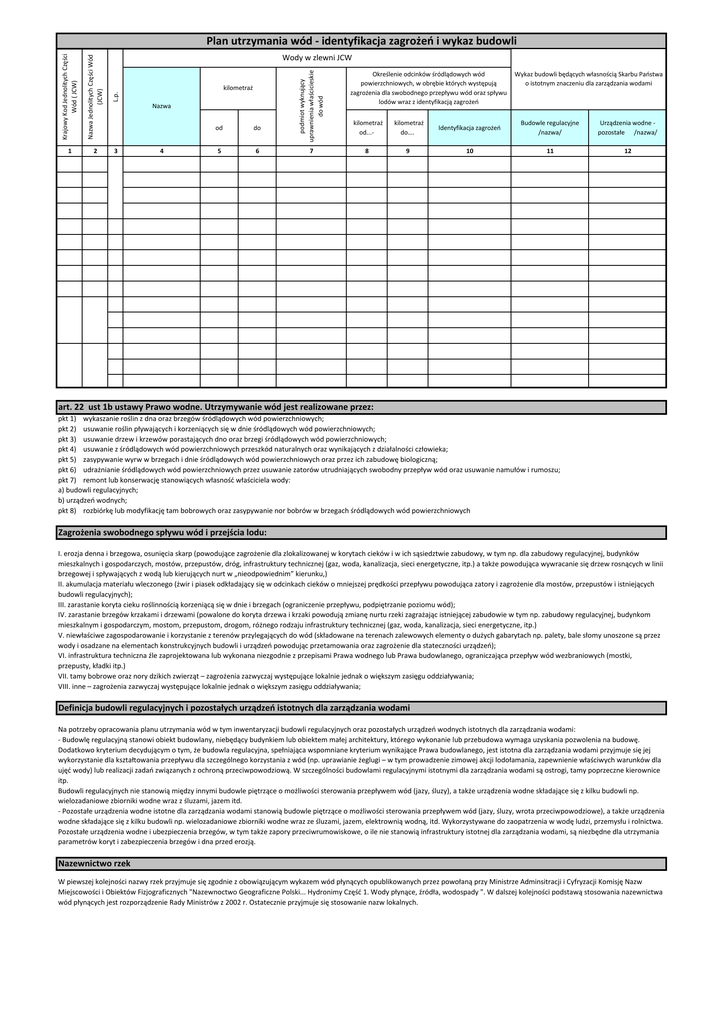 Krajowy Kod Jednolitych Części Wód ( JCW) Nazwa Jednolitych Części Wód (JCW) L.p. Plan utrzymania wód - identyfikacja zagrożeń i wykaz budowli 1 2 3 kilometraż Nazwa 4 od do 5 6 podmiot wyknujący uprawnienia właścicieskie do wód Wody w zlewni JCW 7 Określenie odcinków śródlądowych wód powierzchniowych, w obrębie których występują zagrożenia dla swobodnego przepływu wód oraz spływu lodów wraz z identyfikacją zagrożeń Wykaz budowli będących własnością Skarbu Państwa o istotnym znaczeniu dla zarządzania wodami kilometraż od...- kilometraż do…. Identyfikacja zagrożeń Budowle regulacyjne /nazwa/ Urządzenia wodne pozostałe /nazwa/ 8 9 10 11 12 art. 22 ust 1b ustawy Prawo wodne. Utrzymywanie wód jest realizowane przez: pkt 1) wykaszanie roślin z dna oraz brzegów śródlądowych wód powierzchniowych; pkt 2) usuwanie roślin pływających i korzeniących się w dnie śródlądowych wód powierzchniowych; pkt 3) usuwanie drzew i krzewów porastających dno oraz brzegi śródlądowych wód powierzchniowych; pkt 4) usuwanie z śródlądowych wód powierzchniowych przeszkód naturalnych oraz wynikających z działalności człowieka; pkt 5) zasypywanie wyrw w brzegach i dnie śródlądowych wód powierzchniowych oraz przez ich zabudowę biologiczną; pkt 6) udrażnianie śródlądowych wód powierzchniowych przez usuwanie zatorów utrudniających swobodny przepływ wód oraz usuwanie namułów i rumoszu; pkt 7) remont lub konserwację stanowiących własność właściciela wody: a) budowli regulacyjnych; b) urządzeń wodnych; pkt 8) rozbiórkę lub modyfikację tam bobrowych oraz zasypywanie nor bobrów w brzegach śródlądowych wód powierzchniowych Zagrożenia swobodnego spływu wód i przejścia lodu: I. erozja denna i brzegowa, osunięcia skarp (powodujące zagrożenie dla zlokalizowanej w korytach cieków i w ich sąsiedztwie zabudowy, w tym np. dla zabudowy regulacyjnej, budynków mieszkalnych i gospodarczych, mostów, przepustów, dróg, infrastruktury technicznej (gaz, woda, kanalizacja, sieci energetyczne, itp.) a także powodująca wywracanie się drzew rosnących w linii brzegowej i spływających z wodą lub kierujących nurt w „nieodpowiednim” kierunku,) II. akumulacja materiału wleczonego (żwir i piasek odkładający się w odcinkach cieków o mniejszej prędkości przepływu powodująca zatory i zagrożenie dla mostów, przepustów i istniejących budowli regulacyjnych); III. zarastanie koryta cieku roślinnością korzeniącą się w dnie i brzegach (ograniczenie przepływu, podpiętrzanie poziomu wód); IV. zarastanie brzegów krzakami i drzewami (powalone do koryta drzewa i krzaki powodują zmianę nurtu rzeki zagrażając istniejącej zabudowie w tym np. zabudowy regulacyjnej, budynkom mieszkalnym i gospodarczym, mostom, przepustom, drogom, różnego rodzaju infrastruktury technicznej (gaz, woda, kanalizacja, sieci energetyczne, itp.) V. niewłaściwe zagospodarowanie i korzystanie z terenów przylegających do wód (składowane na terenach zalewowych elementy o dużych gabarytach np. palety, bale słomy unoszone są przez wody i osadzane na elementach konstrukcyjnych budowli i urządzeń powodując przetamowania oraz zagrożenie dla stateczności urządzeń); VI. infrastruktura techniczna źle zaprojektowana lub wykonana niezgodnie z przepisami Prawa wodnego lub Prawa budowlanego, ograniczająca przepływ wód wezbraniowych (mostki, przepusty, kładki itp.) VII. tamy bobrowe oraz nory dzikich zwierząt – zagrożenia zazwyczaj występujące lokalnie jednak o większym zasięgu oddziaływania; VIII. inne – zagrożenia zazwyczaj występujące lokalnie jednak o większym zasięgu oddziaływania; Definicja budowli regulacyjnych i pozostałych urządzeń istotnych dla zarządzania wodami Na potrzeby opracowania planu utrzymania wód w tym inwentaryzacji budowli regulacyjnych oraz pozostałych urządzeń wodnych istotnych dla zarządzania wodami: - Budowlę regulacyjną stanowi obiekt budowlany, niebędący budynkiem lub obiektem małej architektury, którego wykonanie lub przebudowa wymaga uzyskania pozwolenia na budowę. Dodatkowo kryterium decydującym o tym, że budowla regulacyjna, spełniająca wspomniane kryterium wynikające Prawa budowlanego, jest istotna dla zarządzania wodami przyjmuje się jej wykorzystanie dla kształtowania przepływu dla szczególnego korzystania z wód (np. uprawianie żeglugi – w tym prowadzenie zimowej akcji lodołamania, zapewnienie właściwych warunków dla ujęć wody) lub realizacji zadań związanych z ochroną przeciwpowodziową. W szczególności budowlami regulacyjnymi istotnymi dla zarządzania wodami są ostrogi, tamy poprzeczne kierownice itp. Budowli regulacyjnych nie stanowią między innymi budowle piętrzące o możliwości sterowania przepływem wód (jazy, śluzy), a także urządzenia wodne składające się z kilku budowli np. wielozadaniowe zbiorniki wodne wraz z śluzami, jazem itd. - Pozostałe urządzenia wodne istotne dla zarządzania wodami stanowią budowle piętrzące o możliwości sterowania przepływem wód (jazy, śluzy, wrota przeciwpowodziowe), a także urządzenia wodne składające się z kilku budowli np. wielozadaniowe zbiorniki wodne wraz ze śluzami, jazem, elektrownią wodną, itd. Wykorzystywane do zaopatrzenia w wodę ludzi, przemysłu i rolnictwa. Pozostałe urządzenia wodne i ubezpieczenia brzegów, w tym także zapory przeciwrumowiskowe, o ile nie stanowią infrastruktury istotnej dla zarządzania wodami, są niezbędne dla utrzymania parametrów koryt i zabezpieczenia brzegów i dna przed erozją. Nazewnictwo rzek W piewszej kolejności nazwy rzek przyjmuje się zgodnie z obowiązującym wykazem wód płynących opublikowanych przez powołaną przy Ministrze Adminsitracji i Cyfryzacji Komisję Nazw Miejscowości i Obiektów Fizjograficznych "Nazewnoctwo Geograficzne Polski... Hydronimy Część 1. Wody płynące, źródła, wodospady ". W d