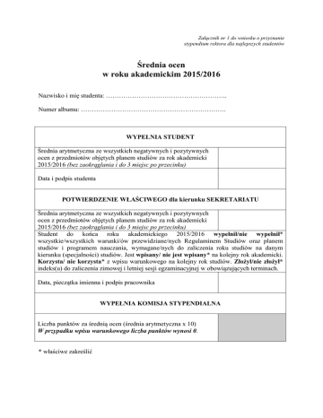 Załącznik nr 1 do wniosku o przyznanie stypendium rektora dla najlepszych studentów Średnia ocen w roku akademickim 2015/2016 Nazwisko i mię studenta: ……………………………………………….. Numer albumu: …………………………………………………………. WYPEŁNIA STUDENT Średnia arytmetyczna ze wszystkich negatywnych i pozytywnych ocen z przedmiotów objętych planem studiów za rok akademicki 2015/2016 (bez zaokrąglania i do 3 miejsc po przecinku) Data i podpis studenta POTWIERDZENIE WŁAŚCIWEGO dla kierunku SEKRETARIATU Średnia arytmetyczna ze wszystkich negatywnych i pozytywnych ocen z przedmiotów objętych planem studiów za rok akademicki 2015/2016 (bez zaokrąglania i do 3 miejsc po przecinku) Student do końca roku akademickiego 2015/2016 wypełnił/nie wypełnił* wszystkie/wszystkich warunki/ów przewidziane/nych Regulaminem Studiów oraz planem studiów i programem nauczania, wymagane/nych do zaliczenia roku studiów na danym kierunku (specjalności) studiów. Jest wpisany/ nie jest wpisany* na kolejny rok akademicki. Korzysta/ nie korzysta* z wpisu warunkowego na kolejny rok studiów. Złożył/nie złożył* indeks(u) do zaliczenia zimowej i letniej sesji egzaminacyjnej w obowiązujących terminach. Data, pieczątka imienna i podpis pracownika WYPEŁNIA KOMISJA STYPENDIALNA Liczba punktów za średnią ocen (średnia arytmetyczna x 10) W przypadku wpisu warunkowego liczba punktów wynosi 0. * właściwe zakreślić