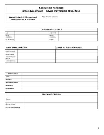 Konkurs na najlepsze prace dyplomowe – edycja inżynierska 2016/2017 Wydział Inżynierii Mechanicznej i Robotyki AGH w Krakowie Data złożenia wniosku: DANE WNIOSKODAWCY IMIĘ NAZWISKO DATA URODZENIA MIEJSCE URODZENIA NR TELEFONU E-MAIL ADRES ZAMELDOWANIA ADRES DO KORESPONDENCJI ULICA/NR DOMU MIEJSCOWOŚĆ KOD POCZTOWY / POCZTA WOJEWÓDZTWO NAZWA UCZELNI ADRES KIERUNEK SPECJALNOŚĆ -PROFIL PROMOTOR DATA OBRONY PRACA DYPLOMOWA Temat Ocena pracy Ocena z egzaminu 1 STRESZCZENIE PRACY DYPLOMOWEJ: LISTA ZAŁĄCZNIKÓW Nr załącznika Załącznik Lp. 1 Recenzje: promotora pracy oraz recenzenta 2 Praca w wersji drukowanej 3 Praca na nośniku elektronicznym (np. CD) 4 Zaświadczenie potwierdzające ocenę uzyskaną z pracy dyplomowej 5 6 7 8 _________________________ Miejscowość, data __________________________ czytelny podpis 2