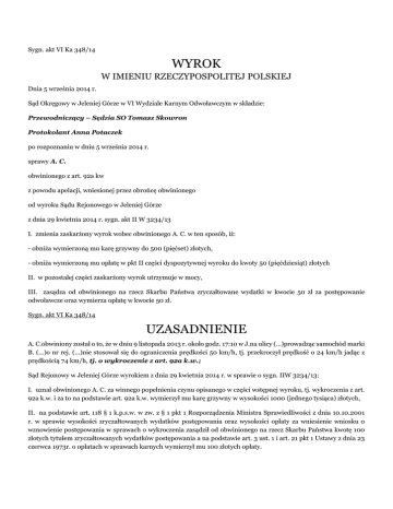 Sygn. akt VI Ka 348/14 WYROK W IMIENIU RZECZYPOSPOLITEJ POLSKIEJ Dnia 5 września 2014 r. Sąd Okręgowy w Jeleniej Górze w VI Wydziale Karnym Odwoławczym w składzie: Przewodniczący – Sędzia SO Tomasz Skowron Protokolant Anna Potaczek po rozpoznaniu w dniu 5 września 2014 r. sprawy A. C. obwinionego z art. 92a kw z powodu apelacji, wniesionej przez obrońcę obwinionego od wyroku Sądu Rejonowego w Jeleniej Górze z dnia 29 kwietnia 2014 r. sygn. akt II W 3234/13 I. zmienia zaskarżony wyrok wobec obwinionego A. C. w ten sposób, iż: - obniża wymierzoną mu karę grzywny do 500 (pięćset) złotych, - obniża wymierzoną mu opłatę w pkt II części dyspozytywnej wyroku do kwoty 50 (pięćdziesiąt) złotych II. w pozostałej części zaskarżony wyrok utrzymuje w mocy, III. zasądza od obwinionego na rzecz Skarbu Państwa zryczałtowane wydatki w kwocie 50 zł za postępowanie odwoławcze oraz wymierza opłatę w kwocie 50 zł. Sygn. akt VI Ka 348/14 UZASADNIENIE A. C.obwiniony został o to, że w dniu 9 listopada 2013 r. około godz. 17:10 w J.na ulicy (...)prowadząc samochód marki B. (...)o nr rej. (...)nie stosował się do ograniczenia prędkości 50 km/h, tj. przekroczył prędkość o 24 km/h jadąc z prędkością 74 km/h, tj. o wykroczenie z art. 92a k.w.; Sąd Rejonowy w Jeleniej Górze wyrokiem z dnia 29 kwietnia 2014 r. w sprawie o sygn. IIW 3234/13: I. uznał obwinionego A. C. za winnego popełnienia czynu opisanego w części wstępnej wyroku, tj. wykroczenia z art. 92a k.w. i za to na podstawie art. 92a k.w. wymierzył mu karę grzywny w wysokości 1000 (jednego tysiąca) złotych, II. na podstawie art. 118 § 1 k.p.s.w. w zw. z § 1 pkt 1 Rozporządzenia Ministra Sprawiedliwości z dnia 10.10.2001 r. w sprawie wysokości zryczałtowanych wydatków postępowania oraz wysokości opłaty za wniesienie wniosku o wznowienie postępowania w sprawach o wykroczenia zasądził od obwinionego na rzecz Skarbu Państwa kwotę 100 złotych tytułem zryczałtowanych wydatków postępowania a na podstawie art. 3 ust. 1 i art. 21 pkt 1 Ustawy z dnia 23 czerwca 1973r. o opłatach w sprawach karnych wymierzył mu 100 złotych opłaty. Apelację od powyższego wyroku złożyła obrońca obwinionego, która zarzuciła: I. błąd w ustaleniach faktycznych mających istotny wpływ na treść rozstrzygnięcia, a polegający na przyjęciu, że: • niemożliwym było zmierzenie prędkości innego pojazdu mechanicznego niż pojazd, którym poruszał się obwiniony w sytuacji, gdy z zeznań funkcjonariusza policji K. D. wynika, iż urządzenie do mierzenia prędkości nie jest wyposażone w wizjer przybliżający, który umożliwiałby zidentyfikowanie pojazdu w momencie pomiaru, wobec czego funkcjonariusz policji wykonujący pomiar nie ma jeszcze fizycznej możliwości rozpoznania namierzonego pojazdu, • niemożliwym jest wskazanie wyniku pomiaru prędkości innego pojazdu niż pojazd, którym kierował obwiniony z uwagi na brak wskazania przez urządzenie kontrolne komunikatu o błędzie w pomiarze w sytuacji, gdy z zeznań K. D. wynika, iż pomiar prędkości nie trwa dłużej niż 1 s., a w tej sytuacji nie możliwość rozpoznania przez funkcjonariusza policji jaki pojazd został przez niego zmierzony powoduje, że wyjaśnienia obwinionego, iż to nie prędkość pojazdu którym on się poruszał została uwidoczniona na urządzeniu kontrolnym jest wiarygodna, • nie uwzględnienie, iż zachowanie obwinionego mające polegać na przekroczeniu prędkości kierowanego przez niego pojazdu ponad dopuszczalną prędkość jest niezgodne z zasadami doświadczenia życiowego, z uwagi na fakt, iż obwiniony miał pełną świadomość jeszcze przed rozpoczęciem jazdy, że na tym odcinku drogi dokonywana jest kontrola prędkości. Mając powyższe na uwadze obrońca obwinionego wniosła o zmianę zaskarżonego orzeczenia poprzez uniewinnienie obwinionego od popełnienia zarzuconego mu czynu. Sąd Okręgowy zważył co następuje: Pomimo, iż doszło do zmiany wyroku na korzyść obwinionego apelacja wywiedziona przez jego obrońcę w zakresie stawianych zaskarżonemu orzeczeniu zarzutów, jak i postulat zmiany wyroku poprzez uniewinnienie A. C. od popełnienia zarzucanego mu czynu na uwzględnienie nie zasługuje. Należy podkreślić, że zarzut błędu w ustaleniach faktycznych przyjętych za podstawę wyroku jest słuszny tylko wówczas, gdy zasadność ocen i wniosków, wyprowadzonych przez sąd orzekający z okoliczności ujawnionych w toku przewodu sądowego, nie odpowiada prawidłowości logicznego rozumowania. Zarzut ten nie może sprowadzać się do samej polemiki z ustaleniami sądu, lecz musi prowadzić do wykazania jakich konkretnie uchybień w zakresie zasad logicznego rozumowania dopuścił się Sąd I instancji w ocenie zebranego materiału dowodowego. Sama możliwość przeciwstawienia ustaleniom Sądu I instancji odmiennego poglądu nie może zaś prowadzić do wniosku o popełnieniu przez ten Sąd błędu w ustaleniach faktycznych. (por. wyrok SN z dnia 20 lutego 1975r. w sprawie II KR 355/4, OSNPG 1975/9/84). Zarzut błędu w ustaleniach faktycznych nie może również sprowadzać się wyłącznie do odmiennej oceny materiału dowodowego. Jak wyżej zostało to podkreślone powinien polegać na wykazaniu, jakich uchybień w świetle wskazań wiedzy i doświadczenia życiowego dopuścił się sąd w dokonanej przez siebie ocenie materiału dowodowego. (por. wyrok SN z dnia 22 stycznia 1975 r., I KR 197/74, OSNKW 1975 r., z. 5, poz. 58). Zarzut błędu w ustaleniach faktycznych może zaś być wywodzony z błędnej oceny materiału dowodowego, a nie odwrotnie. (por. wyrok SA w Katowicach z dnia 21 maja 2009 r., sygn. akt II AKa 120/09, Prok. I Pr. – wkł. 2010/4/28; wyrok SA w Krakowie z dnia 19 maja 2009 r., sygn. akt II AKa 73/09, KZS 2009/9/52). Wywiedziona apelacja nie wykazuje jakim kryteriom ocen nie odpowiada ocena zebranego w sprawie materiału dowodowego, j