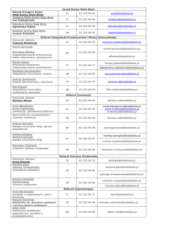 Urząd Gminy Białe Błota Maciej Grzegorz Kulpa Wójt Gminy Białe Błota Zastępca Wójta Gminy Białe Błota Jan Czekajewski 31 52 323 90 90 [email protected] 31 52 323 90 90 [email protected] Sekretarz Gminy Białe Błota Agnieszka Piętka 31 52 323 90 90 [email protected] Skarbnik Gminy Białe Błota Lucyna Krasulak 30 52 323 90 99 [email protected] Referat Gospodarki Przestrzennej i Mienia Komunalnego Kierownik referatu Andrzej Wiekierak 47 52 323 90 94 69 52 323 90 69 Hanna Karolczak Mirosława Affelska Zagospodarowanie przestrzenne, opłaty adiacenckie i planistyczne Maciej Pastwa Aleksandra Noskiewicz Zagospodarowanie przestrzenne [email protected] [email protected] [email protected] [email protected] 77 52 323 90 77 Wiesława Kaczanowska Gospodarka komunalna i mieszk. 48 52 323 90 95 [email protected] Andrzej Świstowski Podział nieruchomości, dzierżawa 74 52 323 90 74 [email protected] Filip Rybacki Gospodarka komunalna, użytkowanie wieczyste 48 52 323 90 95 [email protected] [email protected] Referat Inwestycji Kierownik referatu Bartosz Wiese Anita Błażejewicz Sonia Topolewska Inwestycje, zamówienia publiczne Stanowisko ds. przygotowania i realizacji inwestycji Andrzej Szmytka Bieżące utrzymanie dróg, sprawy gospodarcze Monika Konopka Michał Czyżewski Bieżące utrzymanie dróg Kazimierz Chojnacki Inspektor nadzoru drogowego 64 52 323 90 64 [email protected] 62 52 323 90 62 [email protected] [email protected] [email protected] 68 52 323 90 68 [email protected] 68 52 323 90 68 [email protected] 67 52 323 90 67 68 52 323 90 68 [email protected] [email protected] [email protected] Referat Ochrony Środowiska Kierownik referatu Anna Zdunek Karolina Gaca Jadwiga Tomaszewska Gospodarka odpadami 70 52 323 90 70 36 52 323 90 82 [email protected] [email protected] [email protected] Karolina Swoboda Monika Kobus Ochrona środowiska 50 52 323 90 96 [email protected] [email protected] Referat organizacyjny Anna Bączkowska Kontakty z organizacjami, sport i Promocja Mieszko Siemiński Stanowisko ds. dowodów osobistych i ochrony danych osobowych Adam Ryfa Rejestracja działalności gospodarczej, kontakty z przedsiębiorcami 71 52 323 90 71 35 52 323 90 98 66 52 323 90 66 [email protected] [email protected] [email protected] Aneta Malcer Dodatki mieszkaniowe, profilaktyka 63 52 323 90 63 [email protected] Anna Grygrowicz Biuro obsługi klienta 61 52 323 90 61 [email protected] Magdalena Maison Biuro obsługi Rady Gminy 41 52 323 90 87 [email protected] Renata Dworak Ewidencja ludności, PESEL 46 52 323 90 93 [email protected] Lucyna Dziamska Ewidencja ludności, kadry 53 52 323 90 93 [email protected] 39 [email protected] 66 52 323 90 85 52 323 90 66 71 52 323 90 71 Marek Jakubowski Andrzej Pasek Informatyk Magdalena Bombicka Pozyskiwanie funduszy UE [email protected] [email protected] [email protected] Referat podatków i opłat lokalnych Kierownik referatu Magdalena Obuchowicz 45 52 323 90 92 [email protected] 43 52 323 90 88 [email protected] 43 52 323 90 88 [email protected] 40 52 323 90 86 [email protected] Krystyna Kołodziejczak Opłaty od środków transportowych i inne opłaty 40 52 323 90 86 [email protected] Elżbieta Pasińska Wynagrodzenia 38 52 323 90 84 [email protected] Aleksandra Gajewska Księgowość budżetowa 44 52 323 90 89 ola.gajewskabialeblota.pl Gabriela Kamzelewska Księgowość budżetowa, KRUS 38 52 323 90 84 [email protected] Emilia Jadomska – Bąk Księgowość budżetowa 44 52 323 90 89 [email protected] Łukasz Chmielewski Egzekucja 72 52 323 90 72 [email protected] Beata Kruszka Egzekucja 73 52 323 90 73 [email protected] Tatiana Możdżeń Zobowiązanie od osób fizycznych ustalanie Magdalena Domagalska Zobowiązanie od osób fizycznych ustalanie Wiesława Konowalska Zobowiązanie od osób fizycznych egzekucja Urząd stanu cywilnego Skwarska Anna Kierownik USC, dowody osobiste Edyta Ksobiak Radca prawny Ryszard Gołąb Sprawy obronne, oświetlenie Joanna Rutkowska Audytor wewnętrzny 35 52 323 90 98 [email protected] 57 52 323 90 97 [email protected] 37 52 323 90 83 [email protected] 72 52 323 90 72 [email protected] Inne jednostki organizacyjne Patrycjusz Migawa - kierownik Centrum Obsługi Edukacji i Sportu Księgowość Centrum Obsługi Edukacji i Sportu Bogusława Bajgot Kierownik Gminny Ośrodek Pomocy Społecznej Sekcja świadczeń rodzinnych Gminny Ośrodek Pomocy Społecznej Wydział komunikacji Marcin Fischer Dorota Skiba 42 52 349 45 04 [email protected] 52 381 40 04 [email protected] 52 349 44/ 04 [email protected] 52 381 42 73 [email protected] 52 323 90 81 [email protected]