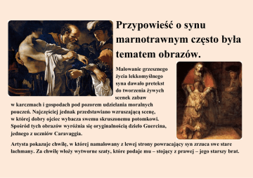 Przypowieść o synu marnotrawnym często była tematem obrazów. Malowanie grzesznego życia lekkomyślnego syna dawało pretekst do tworzenia żywych scenek zabaw w karczmach i gospodach pod pozorem udzielania moralnych pouczeń. Najczęściej jednak przedstawiano wzruszającą scenę, w której dobry ojciec wybacza swemu skruszonemu potomkowi. Spośród tych obrazów wyróżnia się oryginalnością dzieło Guercina, jednego z uczniów Caravaggia. Artysta pokazuje chwilę, w której namalowany z lewej strony powracający syn zrzuca swe stare łachmany. Za chwilę włoży wytworne szaty, które podaje mu – stojący z prawej – jego starszy brat. Właściwym tematem obrazu nie jest jednak „przebieranka”, lecz trudna misja pojednania obu braci, której podjął się ojciec. Z Ewangelii według św. Łukasza wiemy, że brat z rezerwą podszedł do wspaniałomyślnego przebaczenia, jakiego marnotrawnemu synowi udzielił ojciec. W Ewangelii zresztą czytamy, że nie jest on obecny podczas powrotu brata. Pracuje w tym czasie w polu, nadchodzi później i dopiero wtedy dowiaduje się, co zaszło. W tekście biblijnym szatę podaje służący. Guercino chciał jednak pokazać napięcie pomiędzy obu braćmi. Starszy spuszcza wzrok i nie okazuje radości. Ojciec sam więc sięga po ubranie, pośrednicząc w kontakcie między synami. Prawą ręką popycha nawet młodszego syna w kierunku starszego. Przypowieść ewangeliczna o synu marnotrawnym mówi o bezgranicznej miłości Boga do ludzi. To On jest ojcem, a my, grzesznicy, jesteśmy Jego marnotrawnymi dziećmi, które na zakończenie swej życiowej wędrówki mogą liczyć na Bożą miłość i wyrozumiałość. Artysta kładzie tu nacisk na to, jak bardzo Bogu zależy na zgodzie między ludźmi i na tym, by sobie wzajemnie wybaczali. ŹRÓDŁO: WIARA.PL