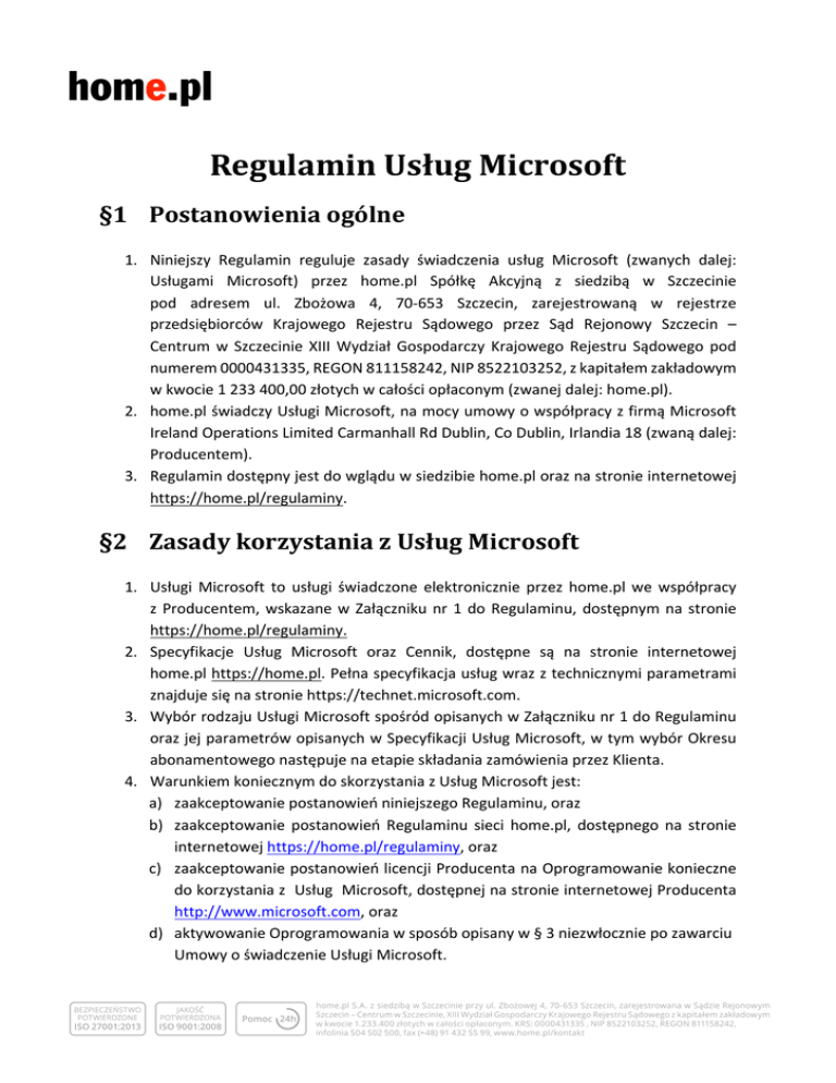RegulaminUsługMicrosoft §1 Postanowieniaogólne 1. Niniejszy Regulamin reguluje zasady świadczenia usług Microsoft (zwanych dalej: Usługami Microsoft) przez home.pl Spółkę Akcyjną z siedzibą w Szczecinie pod adresem ul. Zbożowa 4, 70-653 Szczecin, zarejestrowaną w rejestrze przedsiębiorców Krajowego Rejestru Sądowego przez Sąd Rejonowy Szczecin – Centrum w Szczecinie XIII Wydział Gospodarczy Krajowego Rejestru Sądowego pod numerem0000431335,REGON811158242,NIP8522103252,zkapitałemzakładowym wkwocie1233400,00złotychwcałościopłaconym(zwanejdalej:home.pl). 2. home.plświadczyUsługiMicrosoft,namocyumowyowspółpracyzfirmąMicrosoft IrelandOperationsLimitedCarmanhallRdDublin,CoDublin,Irlandia18(zwanądalej: Producentem). 3. Regulamindostępnyjestdowgląduwsiedzibiehome.ploraznastronieinternetowej https://home.pl/regulaminy. §2 ZasadykorzystaniazUsługMicrosoft 1. Usługi Microsoft to usługi świadczone elektronicznie przez home.pl we współpracy z Producentem, wskazane w Załączniku nr 1 do Regulaminu, dostępnym na stronie https://home.pl/regulaminy. 2. Specyfikacje Usług Microsoft oraz Cennik, dostępne są na stronie internetowej home.plhttps://home.pl.Pełnaspecyfikacjausługwrazztechnicznymiparametrami znajdujesięnastroniehttps://technet.microsoft.com. 3. WybórrodzajuUsługiMicrosoftspośródopisanychwZałącznikunr1doRegulaminu orazjejparametrówopisanychwSpecyfikacjiUsługMicrosoft,wtymwybórOkresu abonamentowegonastępujenaetapieskładaniazamówieniaprzezKlienta. 4. WarunkiemkoniecznymdoskorzystaniazUsługMicrosoftjest: a) zaakceptowaniepostanowieńniniejszegoRegulaminu,oraz b) zaakceptowanie postanowień Regulaminu sieci home.pl, dostępnego na stronie internetowejhttps://home.pl/regulaminy,oraz c) zaakceptowaniepostanowieńlicencjiProducentanaOprogramowaniekonieczne dokorzystaniazUsługMicrosoft,dostępnejnastronieinternetowejProducenta http://www.microsoft.com,oraz d) aktywowanieOprogramowaniawsposóbopisanyw§3niezwłoczniepozawarciu UmowyoświadczenieUsługiMicrosoft. §3 DostępdoOprogramowania 1. Po otrzymaniu przez home.pl zapłaty za Usługi Microsoft, Klient otrzyma za pośrednictwem wiadomości email informacje niezbędne do zalogowania się na stronie internetowej Producenta portal.office.com (dla usługi Microsoft Intune: https://account.manage.microsoft.com/admin/default.aspx)wceluuzyskanialicencji naOprogramowaniekoniecznedokorzystaniazUsługiMicrosoft. 2. Po zalogowaniu się na stronie Producenta Klient samodzielnie dokonuje pobrania OprogramowaniakoniecznegodokorzystaniazUsługiMicrosoft. 3. Pobranie Oprogramowania następuje w trybie licencjonowanym na Okres Abonamentowy właściwy dla zamówionego rodzaju Usługi Microsoft, licząc od dnia jego aktywacji, dokonanej niezwłocznie po zawarciu umowy o świadczenie Usługi Microsoft. 4. Oprogramowanie działa wyłącznie w ramach systemów operacyjnych zgodnych zdokumentacjąProducentawłaściwegodladanejwersjiOprogramowania. §4 Gwarancja OprogramowaniekoniecznedokorzystaniazUsługiMicrosoftaktywowanewramachumowy oświadczenieprzezhome.plUsługiMicrosoftobjętejestgwarancjąProducenta,nazasadach określonychwlicencjiProducenta,októrejmowaw§2pkt4lit.c. §5 Rozwiązanieumowyoświadczenieprzezhome.pl UsługiMicrosoft 1. UmowaoświadczenieUsługiMicrosoftzawieranajestpomiędzyhome.plaKlientem na czas oznaczony obejmujący Okres Abonamentowy wskazany w Specyfikacji zamówionejiopłaconejprzezKlientaUsługiMicrosoft. 2. UmowaoświadczenieUsługiMicrosoftmożebyćrozwiązanaprzedupływemOkresu Abonamentowego,wskazanegowpkt1,przezKlientalubjegonastępcówprawnych, którzy stali się stroną umowy o świadczenie Usługi Microsoft w ramach sukcesji uniwersalnej lub singularnej, jedynie w następstwie okoliczności za które odpowiedzialność ponosi wyłącznie home.pl, w tym w przypadku niedotrzymania przez home.pl dostępności Usługi Microsoft na poziomie zadeklarowanego SLA. Rozwiązanie umowy o świadczenie Usługi Microsoft, o którym mowa w zdaniu poprzednim, następuje na zasadach określonych w pierwszej kolejności w licencji Producenta,októrejmowaw§2pkt4litc,awzakresiewniejnieuregulowanymna zasadach określonych w Regulaminie sieci home.pl, dostępnym na stronie internetowejhttps://home.pl/regulaminy. 3. Do rozwiązania umowy o świadczenie Usługi Microsoft przez Klienta lub jego następców prawnych, którzy stali się stroną umowy o świadczenie Usługi Microsoft w ramach sukcesji uniwersalnej lub singularnej nie znajdują zastosowania zapisy Regulaminu sieci home.pl, dostępnego na stronie internetowej https://home.pl/regulaminy, przewidujące możliwość rozwiązania przez Klienta umowyzawartejzhome.plwtrybiewypowiedzeniazinnychprzyczynniżwskazane wpkt2powyżej,zwyjątkiemzapisuprzewidującegomożliwośćwypowiedzeniaprzez Klienta umowy zawartej z home.pl w przypadku zmiany niniejszego Regulaminu lub Regulaminu sieci home.pl, dostępnego na stronie internetowej https://home.pl/regulaminy. §6 Postanowieniakońcowe 1. 2. W sprawach nieuregulowanych w niniejszym Regulaminie zastosowanie znajduje Regulamin sieci home.pl, dostępny na stronie https://home.pl/regulaminy oraz licencjaProducenta,októrejmowaw§2pkt4lit.c. home.pl zastrzega sobie możliwość zmiany Załącznika nr 1 do Regulaminu poprzez zmianętypówirodzajówUsługMicrosoft(rozszerzanieiograniczanie,dopisywanie nowych).ZmianatakaniestanowizmianyRegulaminuwrozumieniuprzepisówprawa oraz Regulaminu sieci home.pl. Zmiana taka nie wpływa na korzystanie z Usług Microsoft na podstawie zawartych przed jej wprowadzeniem umów o świadczenie przezhome.plUsługiMicrosoft.