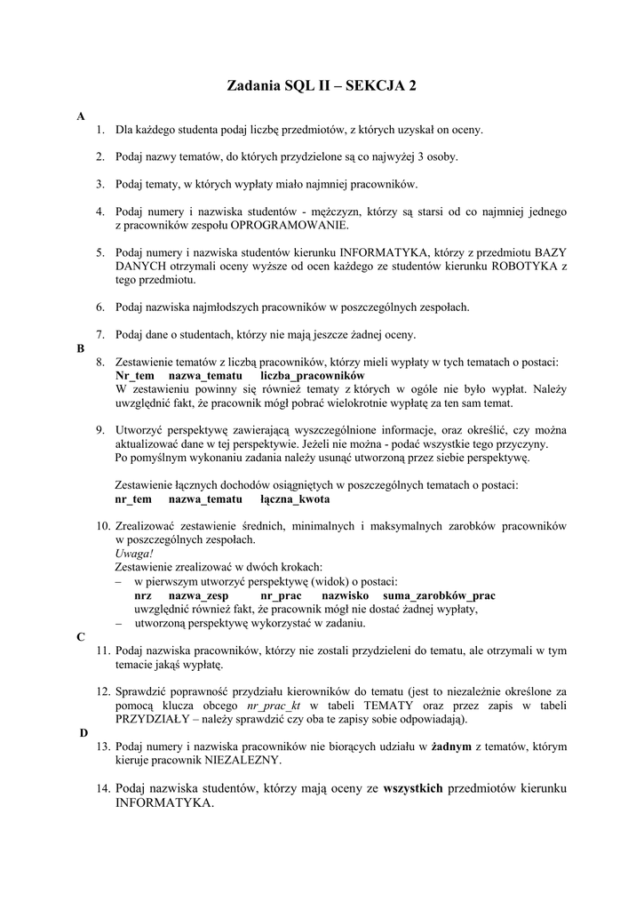Zadania SQL II – SEKCJA 2 A 1. Dla każdego studenta podaj liczbę przedmiotów, z których uzyskał on oceny. 2. Podaj nazwy tematów, do których przydzielone są co najwyżej 3 osoby. 3. Podaj tematy, w których wypłaty miało najmniej pracowników. 4. Podaj numery i nazwiska studentów - mężczyzn, którzy są starsi od co najmniej jednego z pracowników zespołu OPROGRAMOWANIE. 5. Podaj numery i nazwiska studentów kierunku INFORMATYKA, którzy z przedmiotu BAZY DANYCH otrzymali oceny wyższe od ocen każdego ze studentów kierunku ROBOTYKA z tego przedmiotu. 6. Podaj nazwiska najmłodszych pracowników w poszczególnych zespołach. 7. Podaj dane o studentach, którzy nie mają jeszcze żadnej oceny. B 8. Zestawienie tematów z liczbą pracowników, którzy mieli wypłaty w tych tematach o postaci: Nr_tem nazwa_tematu liczba_pracowników W zestawieniu powinny się również tematy z których w ogóle nie było wypłat. Należy uwzględnić fakt, że pracownik mógł pobrać wielokrotnie wypłatę za ten sam temat. 9. Utworzyć perspektywę zawierającą wyszczególnione informacje, oraz określić, czy można aktualizować dane w tej perspektywie. Jeżeli nie można - podać wszystkie tego przyczyny. Po pomyślnym wykonaniu zadania należy usunąć utworzoną przez siebie perspektywę. Zestawienie łącznych dochodów osiągniętych w poszczególnych tematach o postaci: nr_tem nazwa_tematu łączna_kwota 10. Zrealizować zestawienie średnich, minimalnych i maksymalnych zarobków pracowników w poszczególnych zespołach. Uwaga! Zestawienie zrealizować w dwóch krokach: w pierwszym utworzyć perspektywę (widok) o postaci: nrz nazwa_zesp nr_prac nazwisko suma_zarobków_prac uwzględnić również fakt, że pracownik mógł nie dostać żadnej wypłaty, utworzoną perspektywę wykorzystać w zadaniu. C 11. Podaj nazwiska pracowników, którzy nie zostali przydzieleni do tematu, ale otrzymali w tym temacie jakąś wypłatę. 12. Sprawdzić poprawność przydziału kierowników do tematu (jest to niezależnie określone za pomocą klucza obcego nr_prac_kt w tabeli TEMATY oraz przez zapis w tabeli PRZYDZIAŁY – należy sprawdzić czy oba te zapisy sobie odpowiadają). D 13. Podaj numery i nazwiska pracowników nie biorących udziału w żadnym z tematów, którym kieruje pracownik NIEZALEZNY. 14. Podaj nazwiska studentów, którzy mają oceny ze wszystkich przedmiotów kierunku INFORMATYKA.