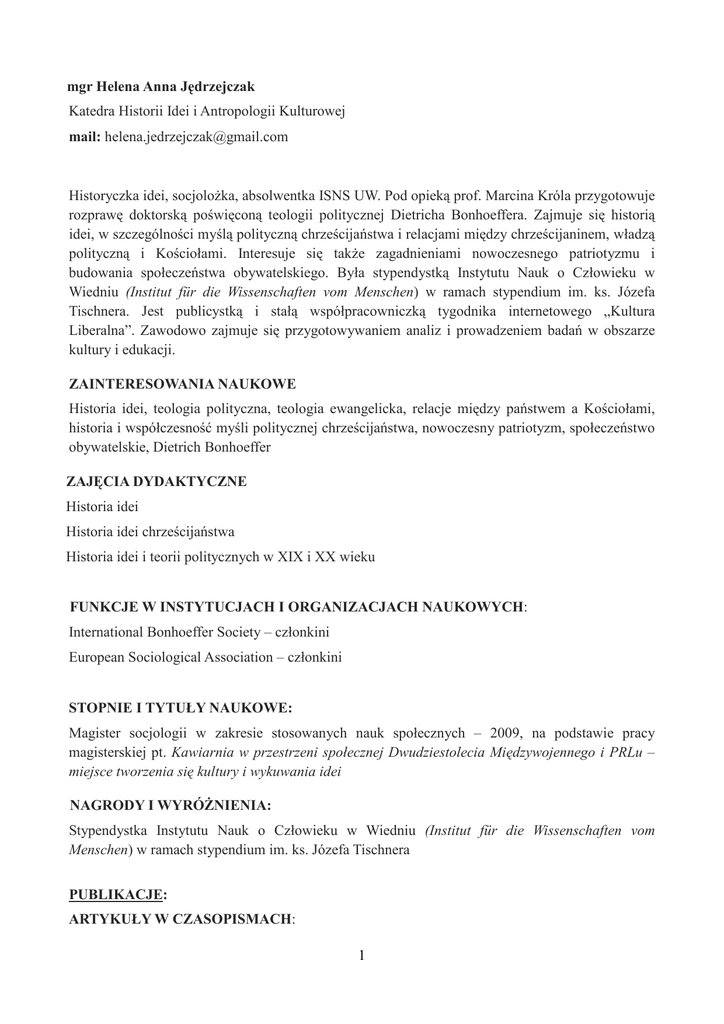 mgr Helena Anna Jędrzejczak Katedra Historii Idei i Antropologii Kulturowej mail: [email protected] Historyczka idei, socjolożka, absolwentka ISNS UW. Pod opieką prof. Marcina Króla przygotowuje rozprawę doktorską poświęconą teologii politycznej Dietricha Bonhoeffera. Zajmuje się historią idei, w szczególności myślą polityczną chrześcijaństwa i relacjami między chrześcijaninem, władzą polityczną i Kościołami. Interesuje się także zagadnieniami nowoczesnego patriotyzmu i budowania społeczeństwa obywatelskiego. Była stypendystką Instytutu Nauk o Człowieku w Wiedniu (Institut für die Wissenschaften vom Menschen) w ramach stypendium im. ks. Józefa Tischnera. Jest publicystką i stałą współpracowniczką tygodnika internetowego „Kultura Liberalna”. Zawodowo zajmuje się przygotowywaniem analiz i prowadzeniem badań w obszarze kultury i edukacji. ZAINTERESOWANIA NAUKOWE Historia idei, teologia polityczna, teologia ewangelicka, relacje między państwem a Kościołami, historia i współczesność myśli politycznej chrześcijaństwa, nowoczesny patriotyzm, społeczeństwo obywatelskie, Dietrich Bonhoeffer ZAJĘCIA DYDAKTYCZNE Historia idei Historia idei chrześcijaństwa Historia idei i teorii politycznych w XIX i XX wieku FUNKCJE W INSTYTUCJACH I ORGANIZACJACH NAUKOWYCH: International Bonhoeffer Society – członkini European Sociological Association – członkini STOPNIE I TYTUŁY NAUKOWE: Magister socjologii w zakresie stosowanych nauk społecznych – 2009, na podstawie pracy magisterskiej pt. Kawiarnia w przestrzeni społecznej Dwudziestolecia Międzywojennego i PRLu – miejsce tworzenia się kultury i wykuwania idei NAGRODY I WYRÓŻNIENIA: Stypendystka Instytutu Nauk o Człowieku w Wiedniu (Institut für die Wissenschaften vom Menschen) w ramach stypendium im. ks. Józefa Tischnera PUBLIKACJE: ARTYKUŁY W CZASOPISMACH: 1 Helena A. Jędrzejczak, Teologia polityczna i etyka. Próba ujęcia tematu na przykładzie »Etyki« Dietricha Bonhoeffera, »Teologii politycznej« Carla Schmitta i »Teologii politycznej« Johanna Baptisty Metza, „Nauka i Szkolnictwo Wyższe” nr 1(41)/2013, s. 12-28 link: http://studiumewaluacji.uw.edu.pl/wp-content/uploads/J%C4%99drzejczak.pdf Helena A. Jędrzejczak, Niemcy Chrystusem Narodów. Przykład realizacji idei Translatio imperii w historii prawie najnowszej, „Teologia Polityczna” nr 7/2013-2014, s. 55-66 Helena A. Jędrzejczak, Wielki łańcuch idei Europy. Recenzja książki Marka A. Cichockiego »Problem politycznej jedności w Europie«, „Teologia Polityczna” nr 7/2013-2014, s. 259-262 Helena A. Jędrzejczak, Tomasz Merta, »Nieodzowność konserwatyzmu«, „Stan Rzeczy” nr 2(3)2012, s. 197-208 Helena A. Jędrzejczak, „Nowe sylabusy” a kształcenie młodego pokolenia polskich humanistów, „Nauka i szkolnictwo wyższe”, nr 1-2/35-36/2010 TEKSTY W PRACACH ZBIOROWYCH: Helena A. Jędrzejczak, Dyskurs dominujący na przykładzie »Deutsche Sonderweg« w pismach Dietricha Bonhoeffera [w:] Jan Szymczyk, Mariusz Zemło, Arkadiusz Jabłoński (red.) Tworzenie iluzji społecznych. Wiedza w sferze publicznej, wyd. KUL, Lublin 2012, s. 293-306 REDAKCJE: Redaktorka numeru 1/41/2013 Półrocznika „Nauka i Szkolnictwo Wyższe” http://studiumewaluacji.uw.edu.pl/wp-content/uploads/Nauka_I_Szkolnictwo_Wyzsze_nr1-412013.pdf VARIA Eseje: Helena A. Jędrzejczak, O mordzie politycznym w »Kronice polskiej« Mistrza Wincentego i »Ryszardzie III« Williama Szekspira, „Teologia Polityczna Co Miesiąc” nr 3/2013, s. 46-52 Helena A. Jędrzejczak, Bóg, wspólnota i posłuszeństwo – o schmittowskiej polityczności w »Białej wstążce« Michaela Hanekego – „Kwartalnik Literacki WYSPA”, nr 4 (16)/2010 Helena A. Jędrzejczak, Dietrich Bonhoeffer – szukając pojednania – portal internetowy rocznika filozoficznego „Teologia Polityczna” http://www.teologiapolityczna.pl/helena-anna-j-drzejczakdietrich-bonhoeffer-szukaj-c-pojednania Helena A. Jędrzejczak, Metafizyka państwa – deutsche Sonderweg i Dietrich Bonhoeffer – portal internetowy rocznika filozoficznego „Teologia Polityczna”: http://www.teologiapolityczna.pl/helena-jedrzejczak-metafizyka-panstwa-deutsche-sonderweg-idietrich-bonhoeffer Helena A. Jędrzejczak, Otwarte drzwi do Breughela – Tygodnik Internetowy „Kultura Liberalna”, link: http://kulturaliberalna.pl/2011/07/18/jedrzejczak-otwarte-drzwi-do-breughla/ Helena A. Jędrzejczak, Cykl artykułów o warszawskich kawiarniach Dwudziestolecia i PRLu: 2 • http://kulturaliberalna.pl/2010/11/16/jedrzejczak-warszawskie-kawiarnie-czesc-i/ • http://kulturaliberalna.pl/2010/11/23/jedrzejczak-migracja-i-stolik-warszawskiekawiarnie-czesc-ii/ • http://kulturaliberalna.pl/2010/11/30/jedrzejczak-kawiarniane-cytaty-kawiarnianeopowiesci/ • http://kulturaliberalna.pl/2010/12/13/jedrzejczak-miedzy-peerelowskimikawiarniami-czesc-iv-cyklu/ • http://kulturaliberalna.pl/2011/01/11/jedrzejczak-kawiarniani-bywalcy-kawiarnianebywanie/ Publicystyka – przykłady Helena A. Jędrzejczak, Mitologie wojny i pokoju http://kulturaliberalna.pl/2014/04/15/mitologiewojny-pokoju/, Kultura Liberalna” nr 275 z 15.04.2015 (o polskiej obronności i bezpieczeństwie) Helena A. Jędrzejczak, Dziedzictwo kolonialne http://kulturaliberalna.pl/2014/02/04/dziedzictwokolonialne/ „Kultura Liberalna” nr 265 z 4.02.2014 (o więzieniu CIA w Starych Kiejkutach) Nie wybaczamy i nie prosimy o wybaczenie Helena A. Jędrzejczak, http://kulturaliberalna.pl/2012/08/21/wtorek-jedrzejczak-nie-wybaczamy-i-nie-prosimy-owybaczenie-komentarz-do-wizyty-patriarchy-cyryla/, „Kultura Liberalna” nr 189 z 21.08.2012 Helena A. Jędrzejczak, Wracamy do rozmowy o wartościach, „ResPublica Nova”, nr 199/Wiosna 2010 Helena A. Jędrzejczak, Polityka mnie interesuje – Instytut http://www.instytutobywatelski.pl/14195/komentarze/polityka-mnie-interesuje Obywatelski: Raporty z badań Marcin Sińczuch (red.), Ilona Iłowiecka