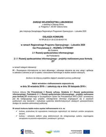 ZARZĄD WOJEWÓDZTWA LUBUSKIEGO z siedzibą w Zielonej Górze ul. Podgórna 7, 65-057 Zielona Góra jako Instytucja Zarządzająca Regionalnym Programem Operacyjnym – Lubuskie 2020 OGŁASZA KONKURS Nr RPLB.02.01.00-IZ.00-08-K01/16 w ramach Regionalnego Programu Operacyjnego – Lubuskie 2020 Osi Priorytetowej 2 – ROZWÓJ CYFROWY dla Działania 2.1 Rozwój społeczeństwa informacyjnego dla Poddziałania 2.1.1 Rozwój społeczeństwa informacyjnego - projekty realizowane poza formułą ZIT w ramach kategorii interwencji: 81 - Rozwiązania informatyczne na rzecz aktywnego i zdrowego starzenia się oraz usługi i aplikacje w zakresie e-zdrowia (w tym e-opieka i nowoczesne technologie w służbie osobom starszym). (konkurs nie dotyczy projektów objętych zasadami pomocy publicznej) Nabór wniosków o dofinansowanie rozpocznie się w dniu 30 września 2016 r. i zakończy się w dniu 30 listopada 2016 r. Konkurs dotyczy Osi Priorytetowej 2 Rozwój cyfrowy, Działania 2.1 Rozwój społeczeństwa informacyjnego, Podziałania 2.1.1 Rozwój społeczeństwa informacyjnego - projekty realizowane poza formułą ZIT określonego w Szczegółowym Opisie Osi Priorytetowych RPO-L2020 i prowadzony jest dla następującego typu projektu: Udostępnienie informacji znajdujących się w zasobach publicznych oraz tworzenie i rozbudowa systemów teleinformatycznych służących upowszechnianiu dostępu do zasobów administracji publicznej. W ramach konkursu będzie można uzyskać dofinansowanie m.in. na: budowę, przebudowę lub wyposażenie inwestycyjne regionalnych lub lokalnych centrów zarządzania sieciami, budowę i wdrażanie platform usług elektronicznych dla zintegrowanego systemu wspomagania zarządzania na poziomie wojewódzkim, powiatowym i gminnym, uruchomienie platform wymiany informacji pomiędzy podmiotami (administracja publiczna, przedsiębiorstwa, ośrodki zdrowia, służby porządkowe i ratownicze oraz obywatelami) zapewniających bezpieczeństwo przesyłanych danych, rozwój elektronicznych platform usług administracji publicznej, inwestycje w infrastrukturę służącą zwiększeniu stopnia cyfryzacji, komunikacji i bezpieczeństwa przechowywania danych (w tym projekty z zakresu: e-zdrowia) rozwój elektronicznych usług dla ludności – tworzenie i wdrożenie interaktywnych usług administracji elektronicznej w instytucjach publicznych, podnoszenie bezpieczeństwa świadczonych usług elektronicznych oraz wdrożenie podpisu elektronicznego, elektronicznej pieczątki i inne sposoby uwierzytelniania form elektronicznych w instytucjach publicznych, tworzenie, rozwój istniejących i wdrażanie interaktywnych usług umożliwiających sprawny i bezpieczny dostęp do zasobów danych i informacji publicznej , wdrożenie elektronicznego obiegu dokumentów w instytucjach publicznych, tworzenie nowych, udostępnianie i udoskonalanie istniejących cyfrowych baz danych oraz systemów elektronicznej archiwizacji w instytucjach publicznych, zastosowanie w ochronie zdrowia oraz w opiece nad osobami starszymi technologii informacyjnych i komunikacyjnych poprzez rozwój aplikacji telemedycznych (e-zdrowie60, e-opieka), w tym m.in. sprawozdawczości medycznej, sprawozdawczości w zakresie rozliczeń finansowych, elektronicznych kart zdrowia, elektronicznych recept, a także usług informacyjnych, np. telekonsultacje, rejestracja przez Internet, itp., Do składania wniosków w ramach konkursu w terminie od dnia 30 września 2016 r. do dnia 30 listopada 2016 r. uprawnieni są następujący Beneficjenci: Jednostki samorządu terytorialnego (JST), ich związki, stowarzyszenia i porozumienia, Jednostki organizacyjne JST posiadające osobowość prawną, Spółki prawa handlowego, będące własnością JST, Podmioty lecznicze świadczące usługi w publicznym systemie ochrony zdrowia na podstawie kontraktu z NFZ (z wyłączeniem MŚP). Projekty mogą być realizowane na zasadzie partnerstwa z udziałem Partnerów, będących podmiotami wymienionymi w powyższym katalogu Wnioskodawców Beneficjentów dla Działania. Do wsparcia kwalifikują się wyłącznie te projekty, które nie zostały fizycznie (rzeczowo) ukończone lub w pełni zrealizowane przed złożeniem wniosku o dofinansowanie w ramach ogłoszonego konkursu, niezależnie od tego czy wszystkie powiązane płatności zostały dokonane przez Wnioskodawcę. O wsparcie mogą ubiegać się wyłącznie projekty nieobjęte pomocą publiczną/pomocą de minimis (brak pomocy publicznej na pierwszym poziomie: Instytucja Zarządzająca RPO-L2020 – Beneficjent). Beneficjentami Poddziałania mogą być wnioskodawcy z MOF Gorzowa Wlkp. Możliwość uzyskania wsparcia przez Jednostki tworzące Związki ZIT Zielona Góra wyłącznie na przedsięwzięcia inne niż wskazane do realizacji w formule ZIT. Wartość środków Europejskiego Funduszu Rozwoju Regionalnego przeznaczonych na dofinansowanie projektów w ramach konkursu nr RPLB.02.01.00-IZ.00-08-K01/16 dla Działania 2.1 Rozwój społeczeństwa informacyjnego, Podziałania 2.1.1 Rozwój społeczeństwa informacyjnego projekty realizowane poza formułą ZIT w ramach Regionalnego Programu Operacyjnego – Lubuskie 2020 wynosi: 34 400 000,00 PLN1, w tym na procedurę odwoławczą 10% kwoty przeznaczonej na konkurs (3 440 000,00 PLN). Środki pochodzą z Europejskiego Funduszu Rozwoju Regionalnego. UWAGA! Powyższa kwota może ulec zmianie, zgodnie z alokacją na konkurs określoną na podstawie algorytmu wyliczającego środki możliwe do zakontraktowania na dany miesiąc. W związku z powyższym, IZ zastrzega sobie prawo niepodpisania umowy z Wnioskodawcą z powodu ewentualnego braku środków, pomimo skierowania projektu do realizacji. Maksymalny dopuszczalny poziom dofinansowania ze środków UE wynosi: 85% całkowitych kosztów kwalifikowalnych projektu i w całości pochodzi ze środków Europejskiego Funduszu Rozwoju Regionalnego (EFRR). Minimalny wkład własny Beneficjenta jako % wydatków kwalifi