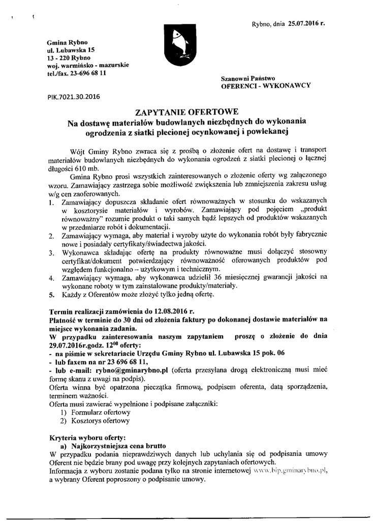 Rybno, dnia 25.01.2016 Gmina Rybno ul. Lubawska 15 13 - 220 Rybno woj, warmifsko - mazur3kie teufax. 23-696 68 11 r' Szanowni Paistwo OFERI]NCI - WYKONAWCY PtK.7021.30.2016 ZAPYTANIE OFERTOWE Na dostawg material6w budowlanych niezbgdnych do wykonania ogrodzenia z siatki plecionej ocynkowanej i powlekanej W6jt Gminy Rybno zwraca sig z proSb4 o zlozenie olbrt na dost TQ i transpoft material6w budowianych niezbgdnych do wykonania ogrodzeir z sia&i plecionej o l4cznej dlugo3ci 610 mb. Gmina Rybno prosi wszystkich zainteresowanych o zlozenie oferty wg zalqczonego wzoru. Zamawiaiqcy zastrzega sobie mozliwoS6 zwigkszenia lub zmniejszenia zakresu ustug dg cen zaoferowanych. Zamawiajqcy dopuszcza skladanie ofert r6\4nowaznych w stosunku do wskazanych l. 2. 3. 4. 5. w kosztorysie material6w i wyrob6w. Z^mawia:i}cy pod pojpciem ',produkt produkt6w wskazanych r6wnowa2ny" rozumie produkt o taki samych bqdZ lepszych od w przedmiarze robol i dokumentacji. Zamawiajqcy wymaga, aby mate al i wyroby uz1'te do wykonania rob6t byly fabrycznie nowe i posiadaly certyfikaty/Swiadectwa j akosci. Wykonawca skladajqc ofertq na produkty r6wnowarzne musi dol4czyd stosowny certyfikat/dokument potwierdzaj4cy r6wnowaznoSe oferowanych produkt6w pod wzglgdem funkcjonalno - uz)'tkowym i technicznym. Zamawiajqcy wymaga, aby wykonawca udzielil 36 miesigcznej gwarancji jako3ci na wykonane roboty w tym zainstalowane prcdukty/materialy. Kazdy z Oferent6w mo2e zlo2y6 tylko jednq ofertg. Termin realizacji zam6wienia do 12.08.2016 r. Platnosd w terminie do 30 dni od zloi€nia faktury po dokonanej dostawie material6w na rniejsce wykonania zadania. w przypadku zainteresowania naszym zapytaniem proszt o zloi€nie do dnia 29,07.20l6r.godz. 12oo oferty: - na pismie w sekretariacie UrzQdu Gminy Rybno ul. Lubawska 15 pok. 06 - lub faxem na nr23 696 68 f1, - lub e-mail: [email protected] (oferta przesylana drog4 elektronicznq musi miei formg skanu z uwagi na podpis). Ol'erta winna by6 opatrzona piecz4tka firmow4, podpisem oferenta, datq sporzqdzenia, terminem waznosciOferta musi zawiera6 wypelnione i podpisane zal4cznlki: Formularz ofertowy 2) Kosztorys ofertowy l) Kryteria wyboru oferty: a) Najkorzystniej sza cena brutto przypadku podania nieprawdziwych danych lub uchylania sig od podpisania umowy Oferent nie bgdzie brany pod uwagg przy kolejnych zap)'taniach ofedowych. Inlbrmacja z wyboru zostanie podana tylko na stronie intemetowej tttttt.l.ip.grrrirtrttibtrL' pl, a wybrany Oferent poproszon) o podpisanie umowy. W W zalqczeniu: l. Zestavvienie material6w ogrodzenia OSiR w Rybnie 2. Zestawienie material6w ogrodzenia boiska w Truszczynach 3. Zestawienie material6w ogrodzenia boiska w Rumianie 4. Zestawienie og6lne material6w 5. Formularz ofertowy wykonawcy 6. Kosztorys ol'efiowy Z gdry.lzigkujg za zlo2enie ofert. zalEcznik Nr 1 Zestawienie material6w ogrodzenia OSiR w Rybnie Jednostka Lp. 1 4 Wyszczeg6lniony element Nazwa llosc Siatka pleciona ocynkowana i powlekana, wysokosc 150 cm, grubose min 2,8 mm, kolor zielony, oczko 60 mm, rolka 20 m szt. 4 Slupek ogrodzeniowy 200 cm powlekany zielony, srednica 4,2 mm, ga. Scianki min 1,25 mm szt. 28 Dfut naciqgowy powlekany PCV fi 3,5m .olka 52 mb szt. 6 Napinacz drutu powlekany PcV szt. 6 Slupek naro2ny poczqtkowy 200 cm powlekany ztelony szt. 2 Slupek podporowy 200 cm powlekany zielony szt. 2 a4 Pzelotka do drutu naciqgowego z wkrQtem Opaska mocujqca do napinacza PCV I 't0 szt. 6 Sruba mocujqca z oczkiem na pret naciqgowy Pret naciqgowy 155 cm powlekany PCV 6 szt. 2 zalqcznik nr 2 Zestawienie material6w ogrodzenia boiska w Truszczynach Jednostka Lp. 1 4 5 7 I I Wyszczeg6lniony eloment Nazwa l1056 Siatka pleciona ocynkowana i powlekana, wysokosd '150 cm, grubo56 min 2,8 mm, kolor zielony, oczko 60 mm, rolka 20 m szt. 12 slupek ogrodzeniowy 200 cm powlekany zielony, Srednica 4,2 mm, gr. Scianki min 1,25 mm szr. Drut naciEgowy powlekany PCV fi 3,5m rolka 52 mb szt. 15 Napinacz dfutu powlekany PCV szt. 24 Stupek narozny poczEtkowy 200 cm powlekany zrelony szt. 4 9upek podporowy 200 cm powlekany zielony szt. 8 Przelotka do drutu naciEgowego z wkretem szt. 225 oczko dodatkowe PCV do monta2u dw6ch napinaczy na jednej opasce szt. 12 12 Opaska mocujEc€ do napinacza PCV Sruba mocujaca z oczkiem na pret naciqgowy szt. 24 ,t1 Pret naciqgowy 155 cm powlekany PCV szt. 8 .tt Brama dwuskrzydlowa standard 300x150 cm powlekana PCV szt. I Furtka standard 150x100 cm powlekana PCV szt. 3 14 Slup stalowy 80x80x3mm w kolorze zielonym dlugosc 7 m szt. 12 15 Siatka ochronna z poliplopylenu 6x20m, oczko 8x8 cm, gr. l\4in 5 mm, kolorzielony Szt. 2 't0 13 zatacznik nr 3 Zestawienie material6w ogrodzenia boiska w Rumianie Lp. 4 7 I I t0 1'l 't3 ,t4 vtlyszczeg6lniony elsmont Jednoslka ll056 Nazwa Siatka pleciona ocynkowana i powlekana, wysokosd 150 cm, gruboSC min 2,8 mm, kolorzielony, oczko 60 mm, rolka 20 m szt. 15 Slupek ogrodzeniowy 200 cm powlekany zielony, Srednica 4,2 mm, gr. Scianki min 1,25 mm szt. 95 Drut naciqgowy powlekany PCV fi 3,5m rolka 52 mb szt. 18 Napinacz drutu powlekany PCV szt. 36 Slupek narozny poczqtkowy 200 cm powlekany zrelony szt. 6 Stupek podporowy 200 cm powlekany zielony szt. 12 Przelotka do drutu naciqgowego z wkrqtem szt. 284 oczko dodatkowe Pcv do montazu dw6ch napinaczy na jednej opasce szt. 18 18 Opaska mocujqca do napinacza PCV Sruba mocujqca z oczkiem na pret nacaqgolvy szt. 36 Pret naciqgowy 155 cm powlekany PCV szt. 12 Brama dwuskzydlowa standard 300x150 cm powlekana PCV szt. 1 Furtka standard 150x100 cm powlekana PCV szt. 3 Slup stalowy 80x80x3mm w kolorze zielonym dtugose 7 m szt. 12 Siatka ochronna z polipropylenu 600x2000cm, oczko 8xB cm, gr. Min 5 mm, kolor zielony szt. 2 Zalqcznik nr 4 Zestawienie material6w ogolem Lp. 1 4 8 9 10 1'l 12 t3 14 ,t5 Wyszczeg6lniony element Jedno! Itka llo56 Nazwa Siatka pleciona ocynkowana i powlekana, wysokose 150 cm, grubosc min 2,8 mm, kolor zielony, oczko 60 mm, rolka 20 m szt. 31 S1upek ogrodzeniowy 200 cm powlekany zielony, Srednica 4,2 