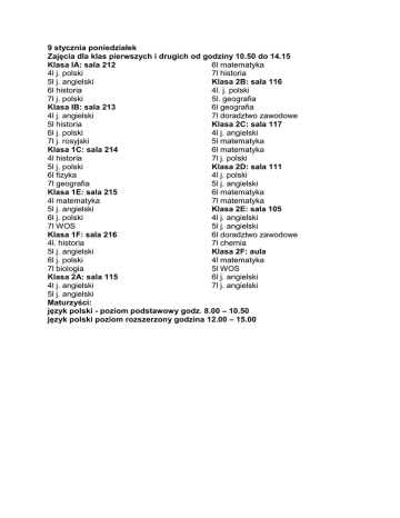9 stycznia poniedziałek Zajęcia dla klas pierwszych i drugich od godziny 10.50 do 14.15 Klasa IA: sala 212 6l matematyka 4l j. polski 7l historia 5l j. angielski Klasa 2B: sala 116 6l historia 4l. j. polski 7l j. polski 5l. geografia Klasa IB: sala 213 6l geografia 4l j. angielski 7l doradztwo zawodowe 5l historia Klasa 2C: sala 117 6l j. polski 4l j. angielski 7l j. rosyjski 5l matematyka Klasa 1C: sala 214 6l matematyka 4l historia 7l j. polski 5l j. polski Klasa 2D: sala 111 6l fizyka 4l j. polski 7l geografia 5l j. angielski Klasa 1E: sala 215 6l matematyka 4l matematyka 7l matematyka 5l j. angielski Klasa 2E: sala 105 6l j. polski 4l j. angielski 7l WOS 5l j. angielski Klasa 1F: sala 216 6l doradztwo zawodowe 4l. historia 7l chemia 5l j. angielski Klasa 2F: aula 6l j. polski 4l matematyka 7l biologia 5l WOS Klasa 2A: sala 115 6l j. angielski 4l j. angielski 7l j. angielski 5l j. angielski Maturzyści: język polski - poziom podstawowy godz. 8.00 – 10.50 język polski poziom rozszerzony godzina 12.00 – 15.00 10 stycznia wtorek Zajęcia dla klas pierwszych i drugich od godziny 10.50 – 14.15 Klasa IA: sala 212 6l j. polski 4l j. polski 7l j. polski 5l j. polski Klasa 2B: sala 116 6l j. angielski 4l. matematyka 7l historia 5l. j. polski Klasa IB: sala 213 6l j. angielski 4l j. polski 7l j. angielski 5l matematyka Klasa 2C: sala 117 6l j. angielski 4l matematyka 7l matematyka 5l matematyka Klasa 1C: sala 214 6l j. polski 4l j. polski 7l j. polski 5l j. polski Klasa 2D: sala 111 6l matematyka 4l j. polski 7l biologia 5l matematyka Klasa 1E: sala 215 6l j. angielski 4l matematyka 7l matematyka 5l chemia Klasa 2E: sala 105 6l j. polski 4l j. angielski 7l j. polski 5l j. angielski Klasa 1F: sala 216 6l biologia 4l. chemia 7l chemia 5l j. angielski Klasa 2F: aula 6l matematyka 4l WOS 7l matematyka 5l matematyka Klasa 2A: sala 115 6l j. polski 4l j. angielski 7l religia 5l j. angielski Maturzyści: matematyka poziom podstawowy godzina 8.00 – 10.50 matematyka poziom rozszerzony godzina 12.00 – 15.00 12 stycznia czwartek Zajęcia dla klas pierwszych i drugich od godziny 8.00 – 12.25 Klasa IA: sala 212 Klasa 2D: 111 1l j. angielski 1l matematyka 2l j. angielski 2l matematyka 3l biologia 3l j. polski 4l j. polski 4l j. angielski 5l fizyka 5l matematyka Klasa IB: 213 Klasa 2E: 105 1l j. polski 1l j. polski 2l matematyka 2l j. polski 3l geografia 3l matematyka 4l j. angielski 4l j. angielski 5l biologia 5l j. polski Klasa 1C: 214 Klasa 2F: aula 1l matematyka 1l matematyka 2l j. angielski 2l historia i społeczeństwo 3l j. polski 3l j. polski 4l j. polski 4l j. angielski 5l j. angielski 5l j. angielski Klasa 1E: 215 1l geografia Maturzyści: 2l biologia Biologia, historia poziom 3l WOS rozszerzony godzina 8.00 – 11.00 4l j. polski Geografia, WOS, chemia poziom 5l j. angielski rozszerzony godzina 12.45 – 15.45 Klasa 1F: 216 1l. WOS 2l j. angielski 3l j. polski 4l matematyka 5l matematyka Klasa 2A: 115 1l j. polski 2l matematyka 3l . angielski 4l j. angielski 5l j. niemiecki Klasa 2B: 116 1l. j. angielski 2l. j. polski 3l matematyka 4l matematyka 5l j. rosyjski Klasa 2C: 117 1l j. polski 2l j. polski 3l j. angielski 4l j. angielski 5l WOS )