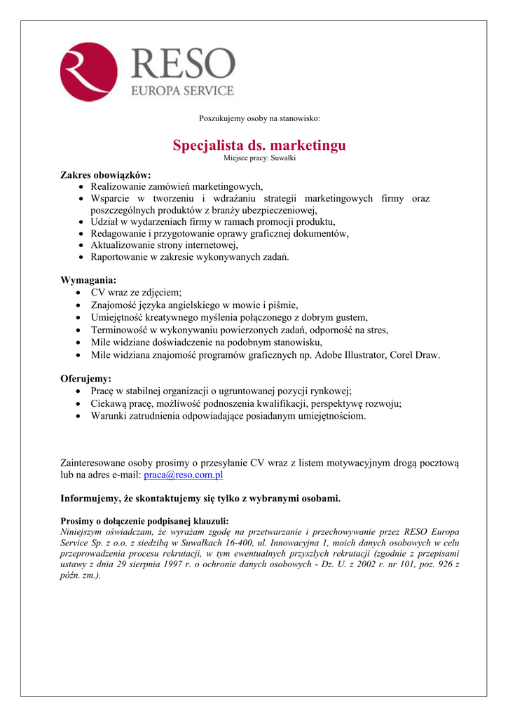 Poszukujemy osoby na stanowisko: Specjalista ds. marketingu Miejsce pracy: Suwałki Zakres obowiązków: Realizowanie zamówień marketingowych, Wsparcie w tworzeniu i wdrażaniu strategii marketingowych firmy oraz poszczególnych produktów z branży ubezpieczeniowej, Udział w wydarzeniach firmy w ramach promocji produktu, Redagowanie i przygotowanie oprawy graficznej dokumentów, Aktualizowanie strony internetowej, Raportowanie w zakresie wykonywanych zadań. Wymagania: CV wraz ze zdjęciem; Znajomość języka angielskiego w mowie i piśmie, Umiejętność kreatywnego myślenia połączonego z dobrym gustem, Terminowość w wykonywaniu powierzonych zadań, odporność na stres, Mile widziane doświadczenie na podobnym stanowisku, Mile widziana znajomość programów graficznych np. Adobe Illustrator, Corel Draw. Oferujemy: Pracę w stabilnej organizacji o ugruntowanej pozycji rynkowej; Ciekawą pracę, możliwość podnoszenia kwalifikacji, perspektywę rozwoju; Warunki zatrudnienia odpowiadające posiadanym umiejętnościom. Zainteresowane osoby prosimy o przesyłanie CV wraz z listem motywacyjnym drogą pocztową lub na adres e-mail: [email protected] Informujemy, że skontaktujemy się tylko z wybranymi osobami. Prosimy o dołączenie podpisanej klauzuli: Niniejszym oświadczam, że wyrażam zgodę na przetwarzanie i przechowywanie przez RESO Europa Service Sp. z o.o. z siedzibą w Suwałkach 16-400, ul. Innowacyjna 1, moich danych osobowych w celu przeprowadzenia procesu rekrutacji, w tym ewentualnych przyszłych rekrutacji (zgodnie z przepisami ustawy z dnia 29 sierpnia 1997 r. o ochronie danych osobowych - Dz. U. z 2002 r. nr 101, poz. 926 z późn. zm.).