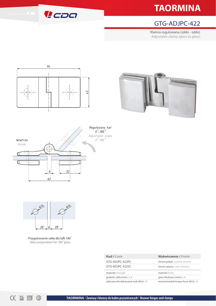 TAORMINA GTG-ADJPC-422 Klamra regulowana (szkło - szkło) Adjustable clamp (glass to glass) 45 94 Regulowany kąt 0˚-180˚ Adjustable angle 0˚-180˚ Wnętrze Inside 6 32 62 4 4 ⌀1 28 ⌀1 6 28 Przygotowanie szkła dla tafli 180˚ Glass preparation for 180˚glass Kod / Code Wykończenie / Finish GTG-ADJPC-422PC GTG-ADJPC-422SC chrom połysk / polish chrome materiał: mosiądz material: brass grubość szkła (mm): 6; 8 glass thickness (mm): 6; 8 zalecana siła dokręcania śrub (Nm): 10 recommended torque force (Nm): 10 chrom satyna / satin chrome TAORMINA І Zawiasy i klamry do kabin prysznicowych І Shower hinges and clamps