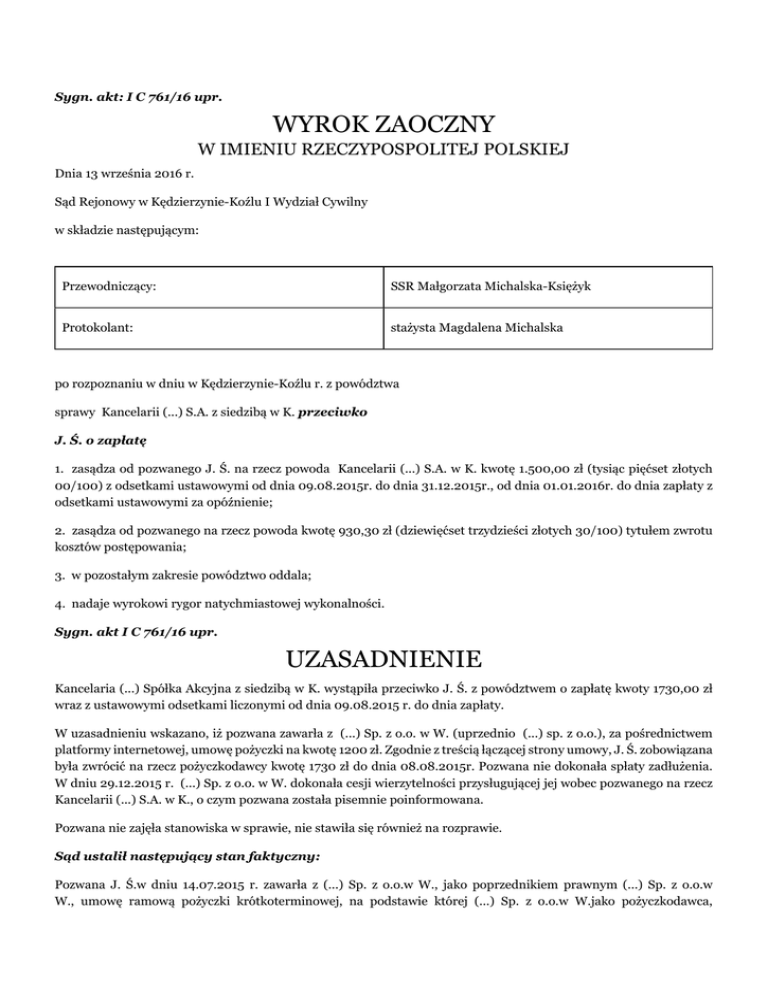 Sygn. akt: I C 761/16 upr. WYROK ZAOCZNY W IMIENIU RZECZYPOSPOLITEJ POLSKIEJ Dnia 13 września 2016 r. Sąd Rejonowy w Kędzierzynie-Koźlu I Wydział Cywilny w składzie następującym: Przewodniczący: SSR Małgorzata Michalska-Księżyk Protokolant: stażysta Magdalena Michalska po rozpoznaniu w dniu w Kędzierzynie-Koźlu r. z powództwa sprawy Kancelarii (...) S.A. z siedzibą w K. przeciwko J. Ś. o zapłatę 1. zasądza od pozwanego J. Ś. na rzecz powoda Kancelarii (...) S.A. w K. kwotę 1.500,00 zł (tysiąc pięćset złotych 00/100) z odsetkami ustawowymi od dnia 09.08.2015r. do dnia 31.12.2015r., od dnia 01.01.2016r. do dnia zapłaty z odsetkami ustawowymi za opóźnienie; 2. zasądza od pozwanego na rzecz powoda kwotę 930,30 zł (dziewięćset trzydzieści złotych 30/100) tytułem zwrotu kosztów postępowania; 3. w pozostałym zakresie powództwo oddala; 4. nadaje wyrokowi rygor natychmiastowej wykonalności. Sygn. akt I C 761/16 upr. UZASADNIENIE Kancelaria (...) Spółka Akcyjna z siedzibą w K. wystąpiła przeciwko J. Ś. z powództwem o zapłatę kwoty 1730,00 zł wraz z ustawowymi odsetkami liczonymi od dnia 09.08.2015 r. do dnia zapłaty. W uzasadnieniu wskazano, iż pozwana zawarła z (...) Sp. z o.o. w W. (uprzednio (...) sp. z o.o.), za pośrednictwem platformy internetowej, umowę pożyczki na kwotę 1200 zł. Zgodnie z treścią łączącej strony umowy, J. Ś. zobowiązana była zwrócić na rzecz pożyczkodawcy kwotę 1730 zł do dnia 08.08.2015r. Pozwana nie dokonała spłaty zadłużenia. W dniu 29.12.2015 r. (...) Sp. z o.o. w W. dokonała cesji wierzytelności przysługującej jej wobec pozwanego na rzecz Kancelarii (...) S.A. w K., o czym pozwana została pisemnie poinformowana. Pozwana nie zajęła stanowiska w sprawie, nie stawiła się również na rozprawie. Sąd ustalił następujący stan faktyczny: Pozwana J. Ś.w dniu 14.07.2015 r. zawarła z (...) Sp. z o.o.w W., jako poprzednikiem prawnym (...) Sp. z o.o.w W., umowę ramową pożyczki krótkoterminowej, na podstawie której (...) Sp. z o.o.w W.jako pożyczkodawca, zobowiązał się udzielić pożyczkobiorcy pożyczki w kwocie 1200 zł, na wniosek złożony drogą elektroniczną. Zawarcie umowy nastąpiło przy użyciu środków porozumiewania się na odległość, poprzez utworzenie przez pozwanego na stronie internetowej pożyczkodawcy www.(...) „konta użytkownika”. W tym celu pożyczkobiorca wypełnił formularz rejestracyjny oraz zaakceptował treść warunków umowy wskazując indywidualny kod (...)przesłany na numer telefonu komórkowego. Pożyczkodawca dokonał weryfikacji zgodności danych wykorzystywanych w toku tworzenia konta z danymi z przelewu dokonanego przez pożyczkobiorcę. Pożyczkodawca przesłał pozwanemu warunki umowy. Dowód: ramowa umowa pożyczki k. 20- 22, W wykonaniu umowy pozwana otrzymała pożyczkę w łącznej kwocie 1200 zł w dniu 14.07.2015 r. Dowód: operacja zlecenia przelewu k. 23. Dnia 29.12.2015 r. powód zawarł z (...) Sp. z o.o. w W., jako następcą prawnym (...) Sp. z o.o. w W., umowę przelewu wierzytelności, na podstawie której nabył m.in. wierzytelność w stosunku do J. Ś. z tytułu umowy pożyczki z dnia 14.07.2015 r. Dowód: umowa przelewu wierzytelności z dnia 29.12.2015 r. k. 15-16, załącznik do umowy k.17. Pismem z dnia 29.12.2015 r. pozwana została zawiadomiona przez powoda o cesji wierzytelności, który jednocześnie wezwał J. Ś. do zapłaty kwoty wynikającej z umowy pożyczki z dnia 14.07.2015 r. w łącznej wysokości 1789,15 zł w terminie 7 dni, z tytułu zaciągniętego zobowiązania. Dowód: zawiadomienie o dokonaniu cesji wierzytelności k. 18-19. Pozwana nie uiściła należności opisanej w piśmie powoda z dnia 29.12.2015 r. Dowód: bezsporne. Sąd zważył, co następuje: Powództwo zasługiwało na uwzględnienie w części. Ustalenia faktyczne zostały poczynione na podstawie dokumentów prywatnych (art. 245 k.p.c.). W myśl art. 6 k.c., ciężar udowodnienia faktów spoczywa na osobie, która wywodzi z nich skutki prawne oraz art. 3 k.p.c. zobowiązujący strony do dawania wyjaśnień, co do okoliczności sprawy zgodnie z prawdą i bez zatajania czegokolwiek oraz przedstawiania dowodów. Ciężar dowodu spoczywa na powodzie, aż do udowodnienia faktów będących podstawą żądania. Później następuje jego przesunięcie na stronę pozwaną. Jak stanowi art. 354 § 1 k.c., dłużnik powinien wykonać zobowiązanie zgodnie z jego treścią i w sposób odpowiadający jego celowi społeczno-gospodarczemu oraz zasadom współżycia społecznego. Zgodnie z przepisem art. 720 k.c. przez umowę pożyczki dający pożyczkę zobowiązuje się przenieść na własność biorącego określoną ilość pieniędzy albo rzeczy oznaczonych tylko co do gatunku, a biorący zobowiązuje się zwrócić tę samą ilość pieniędzy albo tę samą ilość rzeczy tego samego gatunku i tej samej jakości W świetle art. 509 § 1 k.c. wierzyciel może bez zgody dłużnika przenieść wierzytelność na osobę trzecią (przelew), chyba że sprzeciwiałoby się to ustawie, zastrzeżeniu umownemu albo właściwości zobowiązania. W ocenie sądu strona powodowa wykazała zasadność roszczenia, tak w zakresie zaciągniętej przez pozwanego pożyczki krótkoterminowej i niespłacenia pożyczki w umówionym terminie, jak i przeniesienia wierzytelności z tytułu tego zobowiązania na rzecz powoda. Cesja wierzytelności została przez stronę powodową właściwie udokumentowana, zaś w załączniku do dokumentu zindywidualizowano wierzytelność względem pozwanego. Z tej przyczyny sąd uwzględnił żądanie, co do należności głównej w kwocie 1500,00 zł, jak i odsetek ustawowych liczonych od dnia 09.08.2015 r. (art. 481 k.c. oraz art. 481 k.c. z uwzględnieniem jego nowelizacji z dnia 09.10.2015, Dz. U. 2015, poz. 1830). W ocenie sądu, brak jest podstaw do zasądzenia na rzecz strony powodowej kwoty 230 zł tytułem kosztów wez