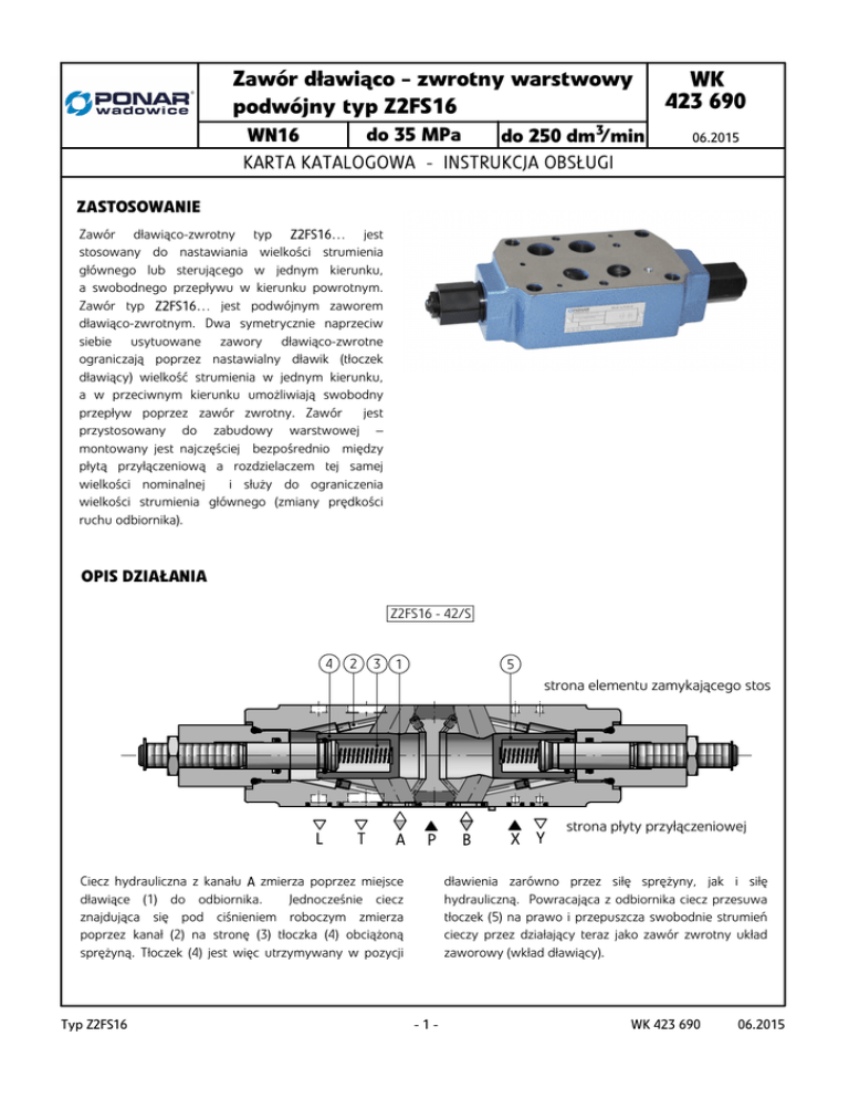 Zawór dławiąco - zwrotny warstwowy podwójny typ Z2FS16 do 35 MPa WN16 do 250 dm3/min KARTA KATALOGOWA - INSTRUKCJA OBSŁUGI WK 423 690 06.2015 ZASTOSOWANIE Zawór dławiąco-zwrotny typ Z2FS16… jest stosowany do nastawiania wielkości strumienia głównego lub sterującego w jednym kierunku, a swobodnego przepływu w kierunku powrotnym. Zawór typ Z2FS16… jest podwójnym zaworem dławiąco-zwrotnym. Dwa symetrycznie naprzeciw siebie usytuowane zawory dławiąco-zwrotne ograniczają poprzez nastawialny dławik (tłoczek dławiący) wielkość strumienia w jednym kierunku, a w przeciwnym kierunku umożliwiają swobodny przepływ poprzez zawór zwrotny. Zawór jest przystosowany do zabudowy warstwowej – montowany jest najczęściej bezpośrednio między płytą przyłączeniową a rozdzielaczem tej samej wielkości nominalnej i służy do ograniczenia wielkości strumienia głównego (zmiany prędkości ruchu odbiornika). OPIS DZIAŁANIA Z2FS16 - 42/S 4 2 3 1 5 strona elementu zamykającego stos L T A P Ciecz hydrauliczna z kanału A zmierza poprzez miejsce dławiące (1) do odbiornika. Jednocześnie ciecz znajdująca się pod ciśnieniem roboczym zmierza poprzez kanał (2) na stronę (3) tłoczka (4) obciążoną sprężyną. Tłoczek (4) jest więc utrzymywany w pozycji Typ Z2FS16 B X Y strona płyty przyłączeniowej dławienia zarówno przez siłę sprężyny, jak i siłę hydrauliczną. Powracająca z odbiornika ciecz przesuwa tłoczek (5) na prawo i przepuszcza swobodnie strumień cieczy przez działający teraz jako zawór zwrotny układ zaworowy (wkład dławiący). -1- WK 423 690 06.2015 DANE TECHNICZNE Ciecz hydrauliczna olej mineralny Wymagana klasa czystości oleju ISO 4406; klasa 20/18/15 Lepkość nominalna cieczy 37 mm2 /s w temperaturze 55 o C Zakres lepkości Zakres temperatury cieczy (w zbiorniku) 2,8 do 380 mm 2/s zalecany 40 oC do 55 oC max -20 oC do +70 oC - 20 oC do +70 oC Zakres temperatury otoczenia 35 MPa Max ciśnienie pracy Max przepływ 250 dm 3/ min Masa 4,7 kg WYMAGANIA MONTAŻU I EKSPLOATACJI 1. Zawór należy użytkować tylko w pełni sprawny. 2. Podczas eksploatacji należy utrzymać zalecaną w niniejszej Karcie Katalogowej - Instrukcji Obsługi lepkość cieczy hydraulicznej. 3. Aby zapewnić bezawaryjną i bezpieczną pracę zaworu należy systematycznie sprawdzać: • działanie zaworu • czystość cieczy hydraulicznej 4. Ze względu na nagrzewanie się korpusu zaworu do wysokiej temperatury zawór powinien być umiejscowiony tak, aby wyeliminować możliwość przypadkowego kontaktu z korpusem podczas eksploatacji lub należy przewidzieć odpowiednie osłony zgodnie z wymaganiami norm europejskich: PN - EN ISO 13732 -1 i PN - EN 982. 5. Dla zapewnienia szczelności przyłącza zaworu do układu hydraulicznego należy przestrzegać wymiarów pierścieni uszczelniających, momentów dokręcenia i parametrów pracy zaworu podanych w niniejszej Karcie Katalogowej - Instrukcji Obsługi. 6. Obsługujący zawór musi być zapoznany z treścią niniejszej Karty Katalogowej - Instrukcji Obsługi. CHARAKTERYSTYKI o dla lepkości cieczy hydraulicznej v = 41 mm 2 /s i temperatury t = 50 C Charakterystyka ∆p (Q) oporów przepływu zaworu zwrotnego Charakterystyki ∆p (Q) zaworu typ Z2FS16 przy różnych nastawach dławika nastawa dławika [ilość obrotów śruby] 25,0 18 15 14 0,8 ∆ p [MPa] ∆ p [MPa] 20,0 13 15,0 10,0 0,6 0,4 0,2 5,0 0 12 1,0 0,5 50 100 150 3 Q [dm /min] 200 250 8 4 0,1 50 WK 423 690 dławik zamknięty 100 150 3 Q [dm /min] 06.2015 200 250 -2- Typ Z2FS16 SCHEMATY Schematy hydrauliczne zaworu typ Z2FS16... wersja podwójna Z2FS16.../S... wersja podwójna Z2FS16.../S2... dławienie dopływu dławienie odpływu strona elementu zamykającego stos L PX A B strona elementu zamykającego stos L PX Y T strona płyty przyłączeniowej B Y T wersja pojedyncza Z2FS16.../S2A... dławienie odpływu wersja pojedyncza Z2FS16.../SA... dławienie dopływu strona elementu zamykającego stos strona elementu zamykającego stos L PX L PX A B Y T strona płyty przyłączeniowej B Y T strona elementu zamykającego stos strona elementu zamykającego stos A B wersja pojedyncza Z2FS16.../S2B... dławienie odpływu dławienie dopływu L PX A strona płyty przyłączeniowej wersja pojedyncza Z2FS16.../SB... L PX Y T A B Y T strona płyty przyłączeniowej strona płyty przyłączeniowej Typ Z2FS16 A strona płyty przyłączeniowej -3- WK 423 690 06.2015 WYMIARY GABARYTOWE I PRZYŁĄCZENIOWE wersja podwójna Z2FS16... 294 (max) 244 (min) 3 50 S5 91 S19 O 5 O 3 11 - 4 otw. L O 3 2 kołki 2 6,6 - 2 otw. 4 O X P T 4 - 2 otw. 69,9 6 1 25 Y B A 72,1 97,1 (max) 101,6 OO O 17,5 (max)- 4 otw. (P,A,B,T) 4 gł. 8- 2 otw. 4- 3 otw. (X,Y,L) 7 A P X B Y 18,3 34,1 65,9 76,6 88,1 101,6 138 (min) r 54 55,6 69,9 71,5 T 12,7 14,3 L 1,6 91 (min) M6 gł. 17- 2 otw. M10 gł.17- 4 otw. 0,01/100 mm 0,63 8 WK 423 690 06.2015 -4- 1 - Śruba nastawcza do zmiany natężenia przepływu • obrót w lewo - zwiększenie natężenia przepływu • obrót w prawo - zmniejszenie natężenia przepływu 2 - Kołek ustalający - szt. 2 3 - Otwory śrub mocujących zawór 4 - Otwory pod kołki ustalające 5 - Pierścień uszczelniający o przekroju kwadratowym 22,3 x 2,4 - szt. 4/komplet (P, T, A, B) 6 - Pierścień uszczelniający o przekroju kwadratowym 10 x 2 szt. 3/komplet (X, Y, L) 7 - Konfiguracja otworów powierzchni płyty przyłączeniowej zgodna z normą ISO 4401 oznaczenie ISO 4401-07-06-0-94 (wielkość nominalna CETOP 07) komplet śrub mocujących wg PN -EN ISO 4762 (PN/M-82302): M10 x L* - 10.9 - szt. 4; moment dokr. Md = 62 Nm M6 x L* - 10.9 - szt. 2; moment dokr. Md =12,5 Nm UWAGA: (*) - Wymagana długość śrub L jest zależna od typu i ilości elementów hydraulicznych montowanych warstwowo 8 - Wymagany stan powierzchni płyty przyłączeniowej Typ Z2FS16 WYMIARY GABARYTOWE I PRZYŁĄCZENIOWE wersje pojedyncze: Z2FS16.../...A; Z2FS16.../...B 243 (max) 25 skok 218 169 11,6 Z