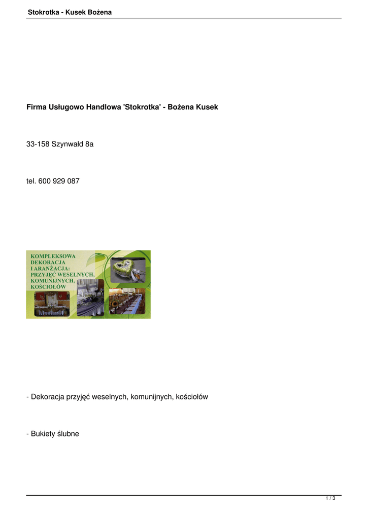 Stokrotka - Kusek Bożena Firma Usługowo Handlowa 'Stokrotka' - Bożena Kusek 33-158 Szynwałd 8a tel. 600 929 087 - Dekoracja przyjęć weselnych, komunijnych, kościołów - Bukiety ślubne 1/3 Stokrotka - Kusek Bożena - Wieńce pogrzebowe - Kompozycje okolicznościowe z kwiatów żywych i sztucznych 2/3 Stokrotka - Kusek Bożena 3/3