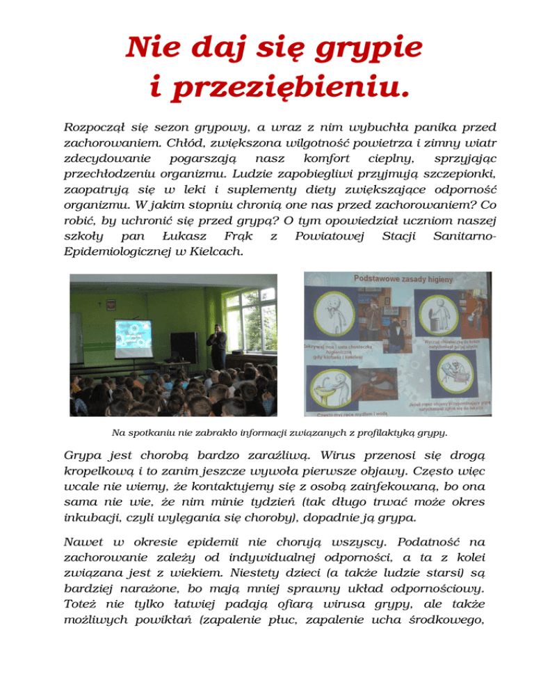 Nie daj się grypie i przeziębieniu. Rozpoczął się sezon grypowy, a wraz z nim wybuchła panika przed zachorowaniem. Chłód, zwiększona wilgotność powietrza i zimny wiatr zdecydowanie pogarszają nasz komfort cieplny, sprzyjając przechłodzeniu organizmu. Ludzie zapobiegliwi przyjmują szczepionki, zaopatrują się w leki i suplementy diety zwiększające odporność organizmu. W jakim stopniu chronią one nas przed zachorowaniem? Co robić, by uchronić się przed grypą? O tym opowiedział uczniom naszej szkoły pan Łukasz Frąk z Powiatowej Stacji SanitarnoEpidemiologicznej w Kielcach. Na spotkaniu nie zabrakło informacji związanych z profilaktyką grypy. Grypa jest chorobą bardzo zaraźliwą. Wirus przenosi się drogą kropelkową i to zanim jeszcze wywoła pierwsze objawy. Często więc wcale nie wiemy, że kontaktujemy się z osobą zainfekowaną, bo ona sama nie wie, że nim minie tydzień (tak długo trwać może okres inkubacji, czyli wylęgania się choroby), dopadnie ją grypa. Nawet w okresie epidemii nie chorują wszyscy. Podatność na zachorowanie zależy od indywidualnej odporności, a ta z kolei związana jest z wiekiem. Niestety dzieci (a także ludzie starsi) są bardziej narażone, bo mają mniej sprawny układ odpornościowy. Toteż nie tylko łatwiej padają ofiarą wirusa grypy, ale także możliwych powikłań (zapalenie płuc, zapalenie ucha środkowego, komplikacje sercowe i neurologiczne). Możemy jednak wiele zrobić, żeby się przed grypą uchronić. 1. Przede wszystkim należy unikać dużych skupisk ludzkich, w których na pewno są osoby przeziębione lub z infekcją grypową w początkowej fazie i podczas kaszlu lub kichania rozpraszają wirusy chorobotwórcze. 2. Zaleca się ubierać stosownie do pogody, najlepiej kilkuwarstwowo, co zwiększa izolację cieplną ciała, a w razie ocieplenia w ciągu dnia, zdjęcie jednej lub dwóch warstw odzieży zapobiegnie przegrzaniu. 3. Jeść dużo warzyw i owoców, zwłaszcza pomarańczowych i czerwonych, ponieważ zawierają dużo karotenoidów i antyoksydantów (np. czerwona papryka, marchew, pomidor, dynia, żółty melon). Dobre są też suszone śliwki, kapusta biała, kapusta kiszona, szpinak, ziemniaki, sałata. 4. Nie zapominać o regularnych ćwiczeniach fizycznych. Utrzymanie dobrej kondycji fizycznej zimą pomaga zapobiegać zachorowaniu, ponieważ wzmacnia układ odpornościowy. 5. Wskazane jest picie soku owocowego lub warzywnego, zwłaszcza pomidorowego, który uzupełni utracone makroi mikroelementy. W czasie i po kąpieli w saunie nie należy podejmować wysiłków fizycznych i innych zabiegów fizjoterapeutycznych. Można natomiast poddać się masażowi ciała (częściowemu lub całkowitemu). 6. Unikać przewlekłego stresu, który sprawia, że organizm nasz bombardowany jest przez hormony: adrenalinę i hormony kory nadnerczy, które upośledzają odporność, a co za tym idzie zwiększają podatność na infekcje. Dlatego warto podejmować regularne działania rozładowujące stres i napięcie, np. oddawać się relaksowi lub ulubionym zajęciom sportowym. 7. Dla zdrowia bardzo ważny jest sen, dlatego nie można go sobie żałować zimą, jeśli organizm domaga się odpoczynku w łóżku. W czasie snu aktywacji ulegają komórki układu immunologicznego, które niszczą komórki organizmu zaatakowane przez wirusy przeziębienia lub grypy i wydzielają substancje zwalczające infekcję. 8. Zwracać uwagę na to, jakie leki się przyjmuje. Obecność kofeiny w składzie tabletek na katar lub przeziębienie skutecznie może utrudnić wieczorem zaśnięcie, a co za tym idzie osłabić działanie układu odpornościowego. 9. Jeśli ktoś jest alergikiem, niech leczy swoją alergię i usuwa alergeny ze swojego otoczenia poprzez regularne wietrzenie pomieszczeń, spanie na materacu i w pościeli antyalergicznej, używanie odkurzacza z filtrem HEPA itp. 10. Warto się także zaszczepić. Na zakończenie spotkania pan Łukasz Frąk przeprowadził quiz, a uczniowie mogli wykazać się przyswojoną wiedzą. Spotkanie zorganizowało SK PCK