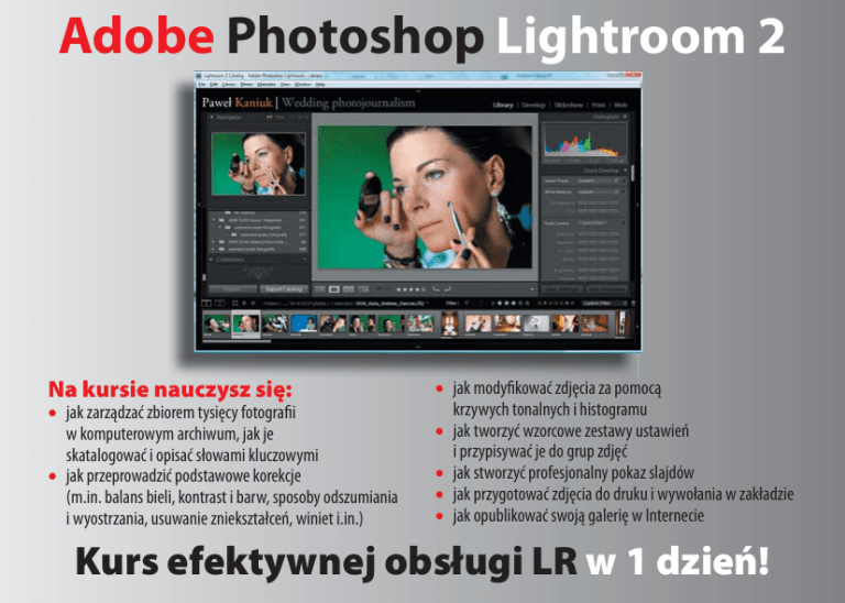 Adobe Photoshop Lightroom 2 Na kursie nauczysz się: • jak zarządzać zbiorem tysięcy fotografii w komputerowym archiwum, jak je skatalogować i opisać słowami kluczowymi • jak przeprowadzić podstawowe korekcje (m.in. balans bieli, kontrast i barw, sposoby odszumiania i wyostrzania, usuwanie zniekształceń, winiet i.in.) • jak modyfikować zdjęcia za pomocą krzywych tonalnych i histogramu • jak tworzyć wzorcowe zestawy ustawień i przypisywać je do grup zdjęć • jak stworzyć profesjonalny pokaz slajdów • jak przygotować zdjęcia do druku i wywołania w zakładzie • jak opublikować swoją galerię w Internecie Kurs efektywnej obsługi LR w 1 dzień! Cyfrowa ciemnia – od zrobienia zdjęcia do efektu końcowego Dlaczego Adobe Lightroom? Czy konieczny jest Photoshop do świetnego przygotowania fotografii do druku lub na potrzeby internetu? Okazuje się, że nie! W wielkim skrócie: program Lightroom to kompletne środowisko pracy dla fotografa, stworzone przez samych fotografów. Po jego należytym opanowaniu, pozwala ograniczyć czas, jaki spędzamy męcząc się z zarządzaniem i obróbką setek plików, i skupić się nad wykonywaniem coraz lepszych fotografii. Co zyskasz po kursie? Zapraszamy na 10. godzinny kurs przygotowany i prowadzony przez doświadczonego grafika i fotografa Pawła Kaniuka www.pawelkaniuk.pl. Szkolenie przeznaczone jest szczególnie dla osób, które chcą rozpocząć pracę z programem, a także tych, którzy ją właśnie rozpoczęli, ale poszukują solidnych podstaw i praktycznych wskazówek. Ukończenie szkolenia pozwoli w pełni efektywnie wykorzystać ogromne możliwości programu, maksymalnie skrócić czas obróbki zdjęć i ich przygotowania do publikacji. Pierwsza edycja szkoleń - 7 i 8 listopada 2009 r. Miejsce: Lublin. Koszt 460 zł. Wskazane posiadanie własnego laptopa. Zapewniamy wersję instalacyjną programu Adobe Lightroom 2.5 oraz kawę. Kurs organizuje Studio Fotograficzne „Art Foto” Robert Bogudziński Agencja Fotograficzna. 20-023 Lublin, ul. Chopina 28, tel. 081 532 16 62 Szczegółowe informacje i zapisy na stronie www.fotograf.lublin.pl oraz pod nr tel. 081 532 16 62 tel. kom. Robert Bogudziński - 601 271 474, Paweł Kaniuk - 502 362 522