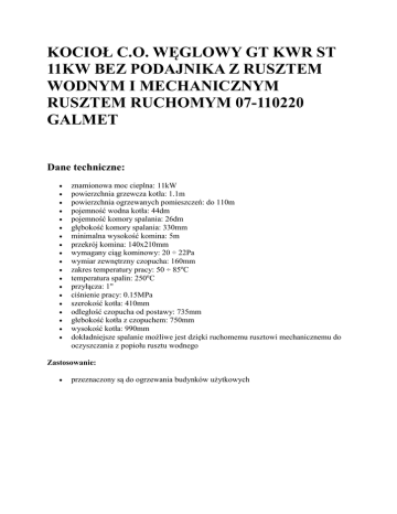 KOCIOŁ C.O. WĘGLOWY GT KWR ST 11KW BEZ PODAJNIKA Z RUSZTEM WODNYM I MECHANICZNYM RUSZTEM RUCHOMYM 07-110220 GALMET Dane techniczne: • • • • • • • • • • • • • • • • • • • znamionowa moc cieplna: 11kW powierzchnia grzewcza kotła: 1.1m powierzchnia ogrzewanych pomieszczeń: do 110m pojemność wodna kotła: 44dm pojemność komory spalania: 26dm głębokość komory spalania: 330mm minimalna wysokość komina: 5m przekrój komina: 140x210mm wymagany ciąg kominowy: 20 ÷ 22Pa wymiar zewnętrzny czopucha: 160mm zakres temperatury pracy: 50 ÷ 85oC temperatura spalin: 250oC przyłącza: 1" ciśnienie pracy: 0.15MPa szerokość kotła: 410mm odległość czopucha od postawy: 735mm głebokość kotła z czopuchem: 750mm wysokość kotła: 990mm dokładniejsze spalanie możliwe jest dzięki ruchomemu rusztowi mechanicznemu do oczyszczania z popiołu rusztu wodnego Zastosowanie: • przeznaczony są do ogrzewania budynków użytkowych