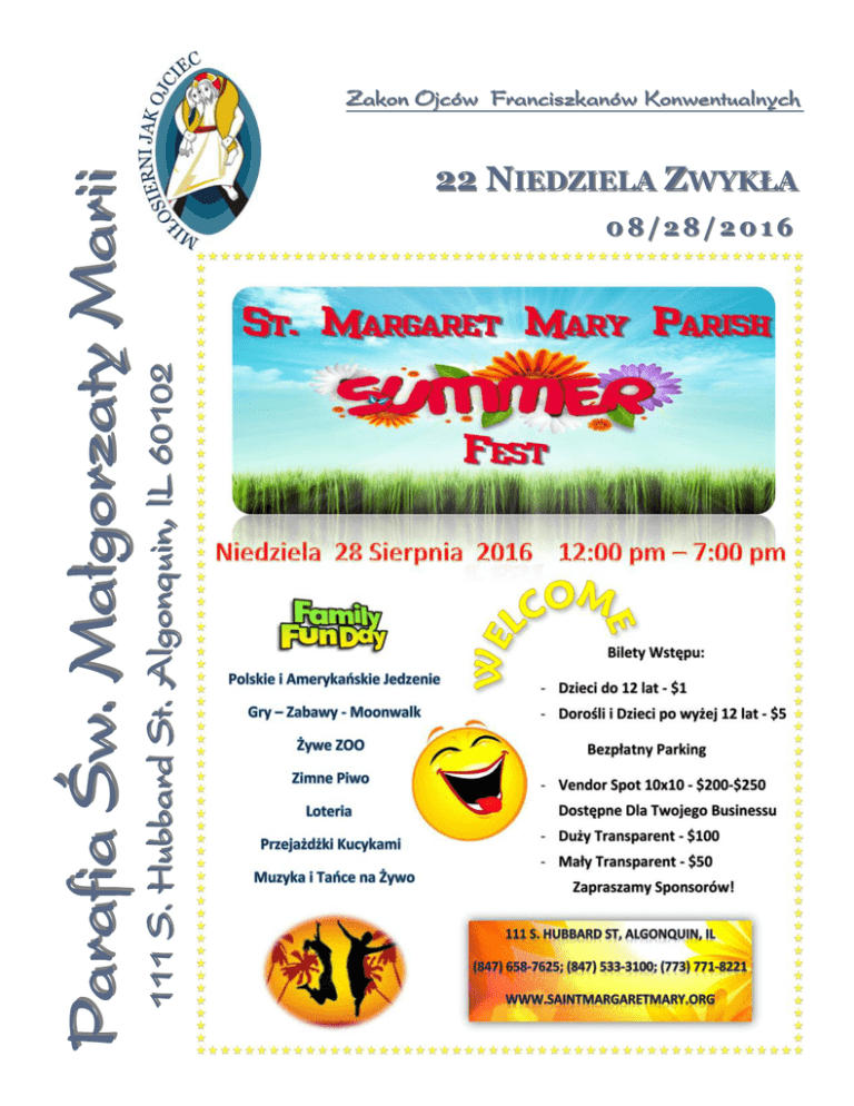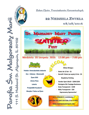 22 NIEDZIELA ZWYKŁA 08/28/2016 111 S. Hubbard St. Algonquin, lL 60102 Parafia Św. Małgorzaty Marii Zakon Ojców Franciszkanów Konwentualnych OD PROBOSZCZA „Każdy bowiem, kto się wywyższa będzie poniżony, a kto się poniża będzie wywyższony.” Drodzy Przyjaciele! Pewna historia opowiada o profesorze uniwersytetu, który lecąc samolotem siedział obok prostego farmera w starszym wieku. Profesor chciał pokazać swoją wyższość i przewagę nad prostym farmerem i zaproponował mu grę podczas lotu. Farmer grzecznie podziękował, ponieważ był zmęczony i chciał się przespać. Ale profesor upierał się przy swoim. Powiedział: „Jeśli ja zadam panu pytanie, na które pan nie odpowie , wtedy płaci mi pan $ 5. Jeśli ja nie odpowiem na pytanie, które pan mi zada, wtedy ja płacę panu $500. Zachęcony tą propozycją, farmer zgodził się na grę. Profesor zadał mu pytanie: „Jaka odległość dzieli nas od księżyca?” Farmer bez słowa wyciągnął pięciodolarowy bankiet z kieszeni i oddał go profesorowi. Następnie farmer zadał mu pytanie: „Co to takiego, co idzie do góry na trzech nogach, a schodzi w dół na czterech nogach?” Profesor zamilkł przez dłuższą chwilę podczas której farmer urządził sobie drzemkę. Sfrustrowany, że nie zna odpowiedzi, profesor nerwowym gestem wyciągnął $ 500 z kieszeni i budząc farmera podał mu pieniądze. Farmer schował pieniądze do kieszeni i znowu się zdrzemnął. Profesor był poirytowany, że farmer nie podał mu odpowiedzi, zbudził farmera i zapytał : „Co to więc jest, co wchodzi do góry na trzech nogach, a schodzi w dół na czterech?” Farmer sięgnął do kieszeni wyciągnął z niej 5 dolarów, podał profesorowi po czym znowu oddał się drzemce. Słowa Ewangelii wg św. Łukasza 14,1.7-14 Gdy Jezus przyszedł do domu pewnego przywódcy faryzeuszów, aby w szabat spożyć posiłek, oni Go śledzili. Potem opowiedział zaproszonym przypowieść, gdy zauważył, jak sobie pierwsze miejsca wybierali. Tak mówił do nich: «Jeśli cię ktoś zaprosi na ucztę, nie zajmuj pierwszego miejsca, by przypadkiem ktoś znamienitszy od ciebie nie był zaproszony przez niego. Wówczas przyjdzie ten, kto was obu zaprosił, i powie ci: „Ustąp temu miejsca”, a wtedy musiałbyś ze wstydem zająć ostatnie miejsce. Lecz gdy będziesz zaproszony, idź i usiądź na ostatnim miejscu. A gdy przyjdzie ten, który cię zaprosił, powie ci: „Przyjacielu, przesiądź się wyżej”. I spotka cię zaszczyt wobec wszystkich współbiesiadników. Każdy bowiem, kto się wywyższa, będzie poniżony, a kto się uniża, będzie wywyższony». Do tego zaś, który Go zaprosił, mówił także: «Gdy wydajesz obiad albo wieczerzę, nie zapraszaj swoich przyjaciół ani braci, ani krewnych, ani zamożnych sąsiadów, aby cię i oni nawzajem nie zaprosili, i miałbyś odpłatę. Lecz kiedy urządzasz przyjęcie, zaproś ubogich, ułomnych, chromych i niewidomych. A będziesz szczęśliwy, ponieważ nie mają czym tobie się odwdzięczyć; odpłatę bowiem otrzymasz przy zmartwychwstaniu sprawiedliwych». Myślę, że od czasu do czasu lubimy sytuacje, w których ludzie wywyższający się nad innych zostają sprowadzeni na ziemię, tak jak w powyższej historii. W dzisiejszej Ewangelii Jezus nie próbuje nas uczyć dobrych manier o zajmowaniu miejsc przy stole, ale wykorzystuje pyszną postawę faryzeuszy, aby nam powiedzieć, jakimi ludźmi mamy być, aby wejść do Królestwa Bożego. „Każdy bowiem, kto się wywyższa będzie poniżony, a kto się poniża będzie wywyższony.” Pyszny człowiek jest wypełniony samym sobą, własnym Ja i nie ma tam miejsca ani dla Boga, ani dla drugiego człowieka. Dzisiejsze pierwsze czytanie z Księgi Syracydesa zachęca nas również do pokory: „O ile wielki jesteś, o tyle się uniżaj, a znajdziesz łaskę u Pana. Na chorobę pyszałka nie ma lekarstwa, albowiem nasienie zła w nim zapuściło korzenie.” Na pewno pozbawianie się grzechu pychy, a zdobywanie cnoty pokory to ciężka praca duchowa. Ale właśnie do podjęcia tego wysiłku zaprasza nas dzisiejsze Boże Słowo. Codzienny rachunek sumienia i stanięcie przed Bogiem w prawdzie każdego wieczoru pomaga nam być wdzięcznymi za sukcesy i talenty, które posiadamy oraz być pokornymi, w obliczu naszych słabości i niedociągnięć. Pokój i Dobro Fr. Piotr Sarnicki, OFM, Conv. CZYTANIE Z MĄDROŚCI SYRACHA SYR 3, 17-18. 20. 28-29 Synu, z łagodnością prowadź swe sprawy, a każdy, kto jest prawy, będzie cię miłował. Im większy jesteś, tym bardziej się uniżaj, a znajdziesz łaskę u Pana. Wielka jest bowiem potęga Pana i przez pokornych bywa chwalony. Na chorobę pyszałka nie ma lekarstwa, albowiem nasienie zła zapuściło w nim korzenie. Serce rozumnego rozważa przypowieść, a ucho słuchacza – to pragnienie mędrca. CZYTANIE Z LISTU DO HEBRAJCZYKÓW HBR 12, 18-19. 22-24A Bracia: Nie przyszliście do namacalnego i płonącego ognia, do mgły, do ciemności i burzy ani też do grzmiących trąb i do takiego dźwięku słów, iż wszyscy, którzy go usłyszeli, prosili, aby do nich nie mówił. Wy natomiast przyszliście do góry Syjon, do miasta Boga żywego – Jeruzalem niebieskiego, do niezliczonej liczby aniołów, na uroczyste zgromadzenie, i do Kościoła pierworodnych, którzy są zapisani w niebiosach, do Boga, który sądzi wszystkich, do duchów ludzi sprawiedliwych, którzy już doszli do celu, do Pośrednika Nowego Testamentu – Jezusa. OGŁOSZENIA W poniedziałek o 7 wieczorem zapraszamy na Mszę św. i nabożeństwo eucharystyczne. Przypominamy że od września w naszym kościele w niedziele będzie dodatkowa Msza św. w języku angielskim o 4:30 wieczorem. Rozkład pozostałych mszy bez zmian. 2 września przypada pierwszy piątek miesiąca. W ten dzień od 6:30 wieczorem będzie okazja do spowiedzi św. Pierwszopiątkowa Msza św. o 7:30. W sobotę 3-go września zapraszamy n