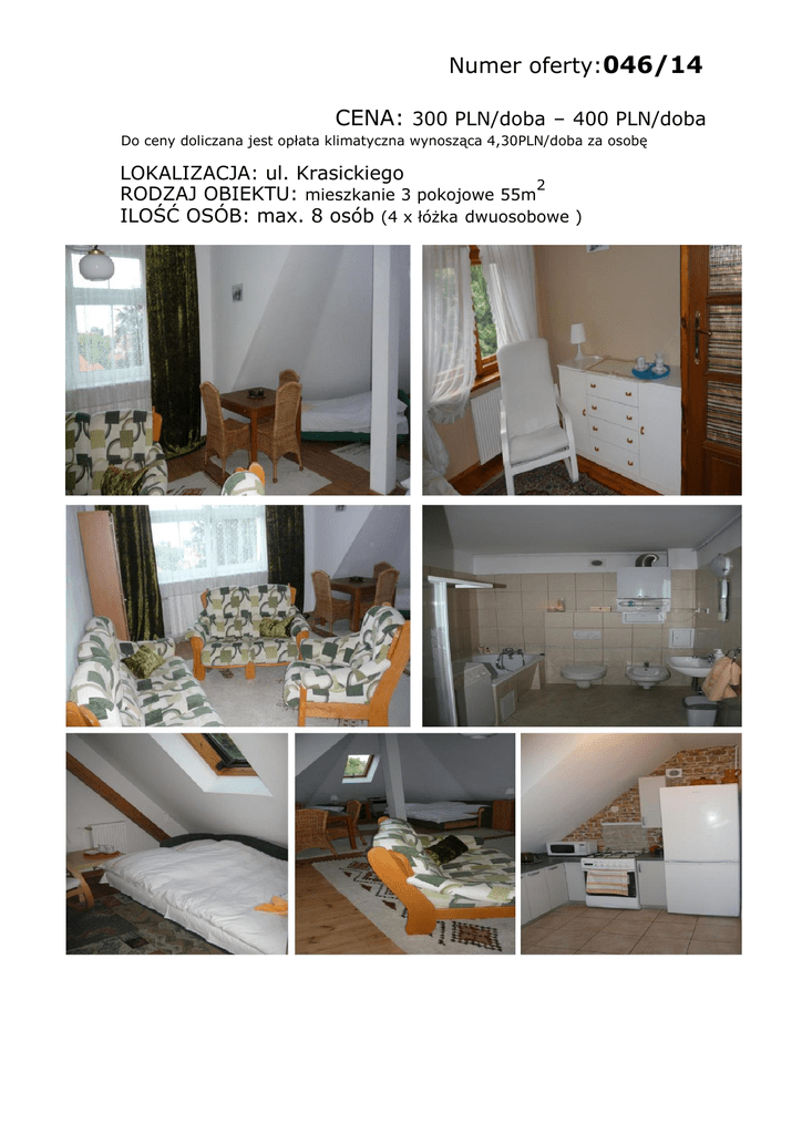 Numer oferty:046/14 CENA: 300 PLN/doba – 400 PLN/doba Do ceny doliczana jest opłata klimatyczna wynosząca 4,30PLN/doba za osobę LOKALIZACJA: ul. Krasickiego 2 RODZAJ OBIEKTU: mieszkanie 3 pokojowe 55m ILOŚĆ OSÓB: max. 8 osób (4 x łóżka dwuosobowe ) Numer oferty: 046/14 LOKALIZACJA: ul.Krasickiego Lp. PRZEDMIOT OCENY UWAGI 1. Nowe/stare budownictwo Stare budownictwo 2. Nowe/stare meble Stare i nowe meble 3. Parking na posesji/Garaż Miejsce postojowe przed posesją 4. Balkon / taras / ogródek Nie 5. Telewizor (Kablówka, TV Sat), Radio TV Kablowa, Radio 6. Dostęp do telefonu Nie 7. Dostęp do internetu Nie 8. Dostęp do kuchni: Lodówka Kuchenka Czajnik bezprzewodowy Wyposażenie (sztućce, zastawa, garnki) 9. Dostęp do łazienki: Wanna Kabina prysznicowa Oddzielnie WC Łazienka współużytkowana Kuchnia z pełnym wyposażeniem, lodówka, kuchenka gazowa, czajnik bezprzewodowy Łazienka z WC, wanna i prysznic, oraz bidet 10. Pościel, ręczniki Tak 11. Dostęp do szafy / półek Tak 12. Pobyt ze zwierzątkiem Nie 13. Pokój zamykany na klucz Wszystkie pokoje zamykane na klucz 14. Niepełnosprawni (winda, podjazd) Nie 15. Plac zabaw dla dzieci Tak 16. 17. Lokalizacja Centrum – Dworzec PKP Plaża, park Dzielnica Komunikacja miejska Osoby palące 18. Piwnica/schowek 19. Faktura VAT lub Rachunek 20. Inne Spokojna okolica w Górnym Sopocie, 5 minut do Dworca PKP oraz centrum. Do plaży około 15 miut pieszo. Nie Nie
