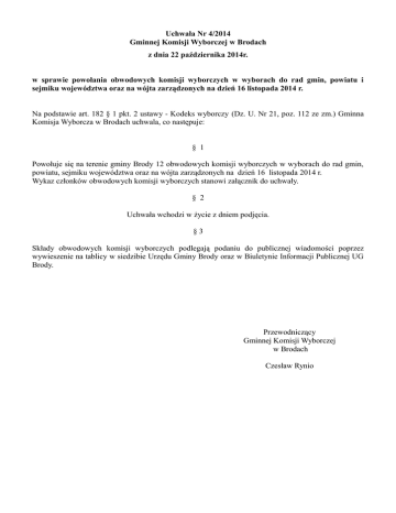Uchwała Nr 4/2014 Gminnej Komisji Wyborczej w Brodach z dnia 22 października 2014r. w sprawie powołania obwodowych komisji wyborczych w wyborach do rad gmin, powiatu i sejmiku województwa oraz na wójta zarządzonych na dzień 16 listopada 2014 r. Na podstawie art. 182 § 1 pkt. 2 ustawy - Kodeks wyborczy (Dz. U. Nr 21, poz. 112 ze zm.) Gminna Komisja Wyborcza w Brodach uchwala, co następuje: § 1 Powołuje się na terenie gminy Brody 12 obwodowych komisji wyborczych w wyborach do rad gmin, powiatu, sejmiku województwa oraz na wójta zarządzonych na dzień 16 listopada 2014 r. Wykaz członków obwodowych komisji wyborczych stanowi załącznik do uchwały. § 2 Uchwała wchodzi w życie z dniem podjęcia. §3 Składy obwodowych komisji wyborczych podlegają podaniu do publicznej wiadomości poprzez wywieszenie na tablicy w siedzibie Urzędu Gminy Brody oraz w Biuletynie Informacji Publicznej UG Brody. Przewodniczący Gminnej Komisji Wyborczej w Brodach Czesław Rynio Załącznik do uchwały Nr 4/2014 Gminnej Komisji Wyborczej w Brodach z dnia 22 października 2014r. Składy obwodowych komisji wyborczych: Obwodowa Komisja Wyborcza Nr 1 w Adamowie: Miejsce zamieszkania Organ zgłaszający Lp. Imiona Nazwisko 1 2 3 4 5 6 7 8 9 Kwiecień Szybalska Klepacz Kania Major Stachowicz-Śledź Krzeszowski Woszczak Glina Wioletta Anna Tadeusz Krzysztof Zofia Danuta Zofia Agnieszka Zenon Andrzej Renata Anna Monika Adamów Adamów Ruda Dziurów Adamów Dziurów Brody Adamów KWW Wspólnota Patriotyzm Solidarność KWW Marzeny Bernat KW Prawo i Sprawiedliwość KWW Razem Dla Mieszkańców – Samorząd 2014 KWW Rozwój Brody 2014 KW Porozumienie Obywatelskie KWW M. Łęckiego KWW Andrzeja Przygody WBP Obwodowa Komisja Wyborcza nr 2 w Brodach: Lp. Imiona Nazwisko 1 2 3 4 5 6 7 8 9 Daniel Konrad Ewa Krystyna Mateusz Konrad Luiza Dorota Joanna Katarzyna Alicja Józefa Joanna Magdalena Nina Tatiana Jezierski Bernaciak Gliwiński Kumek Wiśniewska Gawłowska Kosałka Cieślik Wójcik Miejsce zamieszkania Organ zgłaszający Rudnik Brody Ruda Brody Rudnik Krynki Brody Brody KWW Wspólnota Patriotyzm Solidarność KWW Jarosława Wójcika KW Prawo i Sprawiedliwość KW Polskie Stronnictwo Ludowe KWW Razem Dla Mieszkańców – Samorząd 2014 KWW Rozwój Brody 2014 KWW M. Łęckiego KWW Andrzeja Przygody WBP Obwodowa Komisja Wyborcza nr 3 w Brodach: Lp. Imiona Nazwisko 1 2 3 4 5 6 7 8 9 Szymon Jezierski Monika Elżbieta Klepacz Ludwik Wiśniewski Karolina Kalista Ewelina Rożek Katarzyna Nowak Małgorzata Stanisława Nowak Teresa Emilia Łodej Eliza Piwnik Miejsce zamieszkania Organ zgłaszający Rudnik Młynek Brody Brody Młynek Brody Kuczów Brody KWW Wspólnota Patriotyzm Solidarność KW Nowa Prawica Janusza Korwin-Mikke KWW Marzeny Bernat KW Prawo i Sprawiedliwość Koalicyjny KW SLD Lewica Razem KW Porozumienie Obywatelskie KWW M. Łęckiego KWW Andrzeja Przygody WBP Obwodowa Komisja Wyborcza nr 4 w Dziurowie: Lp. Imiona Nazwisko 1 2 3 4 5 6 7 8 9 Szary Szwajcer Świtoń Czeski Górecka Jamski Kunert Kaczan Bidziński Andrzej Justyna Aneta Elżbieta Małgorzata Krzysztof Iwona Łukasz Mariusz Anna Lucyna Mateusz Miejsce zamieszkania Organ zgłaszający Styków Krynki Dziurów Krynki Ruda Dziurów Dziurów Dziurów KW Platforma Obywatelska RP KW Nowa Prawica Janusza Korwin-Mikke KWW Marzeny Bernat KW Samoobrona KW Polskie Stronnictwo Ludowe KWW Rozwój Brody 2014 KWW M. Łęckiego KWW Andrzeja Przygody WBP Obwodowa Komisja Wyborcza nr 5 w Kuczowie: Lp. Imiona Nazwisko 1 2 3 4 5 6 7 8 9 Niekłań Grudniewski Gałka Filipowski Golinska Turek Pacek Głowacki Kutera Jadwiga Bożena Maciej Edyta Stanisław Dorota Teresa Monika Edyta Katarzyna Karol Gabriel Martyna Miejsce zamieszkania Organ zgłaszający Styków Lipie Krynki Styków Brody Jabłonna Kuczów Kuczów KW Platforma Obywatelska RP KW Prawo i Sprawiedliwość KW Samoobrona KW Polskie Stronnictwo Ludowe Koalicyjny KW SLD Lewica Razem KWW Razem Dla Mieszkańców – Samorząd 2014 KW Porozumienie Obywatelskie KWW Andrzeja Przygody WBP Obwodowa Komisja Wyborcza nr 6 w Lipiu: Lp. Imiona Nazwisko 1 2 3 4 5 6 7 8 9 Cząstka Głowacka Gałka Kozik Gielec Derlatka Ladyca Glina Cieślik Alicja Elżbieta Danuta Łukasz Mirosława Irena Monika Joanna Katarzyna Henryka Sylwester Dorota Miejsce zamieszkania Organ zgłaszający Brody Lipie Krynki Lipie Lipie Lipie Kuczów Lipie KW Platforma Obywatelska RP KW Prawo i Sprawiedliwość KW Samoobrona KW Polskie Stronnictwo Ludowe Koalicyjny KW SLD Lewica Razem KWW Razem Dla Mieszkańców – Samorząd 2014 KWW M. Łęckiego KWW Andrzeja Przygody WBP Obwodowa Komisja Wyborcza nr 7 w Lubieni: Miejsce zamieszkania Organ zgłaszający Lp. Imiona Nazwisko 1 2 3 4 5 6 7 8 9 Szast Lefek-Dryja Gawarecka Ogrodowska-Matyjasik Lech Wrona Klimkowska Chmielewska Tomanek-Brzoza Mariola Katarzyna Marta Agata Anna Maria Gabriela Kazimiera Beata Agnieszka Katarzyna Maria Honorata Nina Kuczów Krynki Krynki Krynki Styków Lipie Krynki Lubienia KW Platforma Obywatelska RP KWW Razem Brody KW Prawo i Sprawiedliwość KW Samoobrona KW Polskie Stronnictwo Ludowe Koalicyjny KW SLD Lewica Razem KWW Razem Dla Mieszkańców – Samorząd 2014 KW Porozumienie Obywatelskie WBP Obwodowa Komisja Wyborcza nr 8 w Młynku: Lp. Imiona Nazwisko 1 2 3 4 5 6 7 8 9 Szwajcer Całka Biurkowska Kurek Mierzyńska Nowak Kiepas Gralec Kucharczyk Samuel Dawid Krystyna Marianna Anna Angelika Kamila Sylwia Teresa Anna Aleksandra Iwona Anna Miejsce zamieszkania Organ zgłaszający Krynki Krynki Brody Adamów Młynek Lubienia Brody Lubienia KW Nowa Prawica Janusza Korwin-Mikke KW Prawo i Sprawiedliwość KW Samoobrona KW Polskie Stronnictwo Ludowe KWW Wojciecha Jańca Koalicyjny KW SLD Lewica Razem KWW Razem Dla Mieszkańców – Samorząd 2014 KW Porozumienie Obywatelskie WBP Obwodowa Komisja Wyborcza nr 9 w Rudzie: Lp. Imiona Nazwisko 1 2 3 4 5 6 7 8 9 Klepacz Rynio Dymińska Ubermanowicz Zawłocka Szwugier Barański Janikowska Zawłocki Edyta Ewa Tomasz Magda