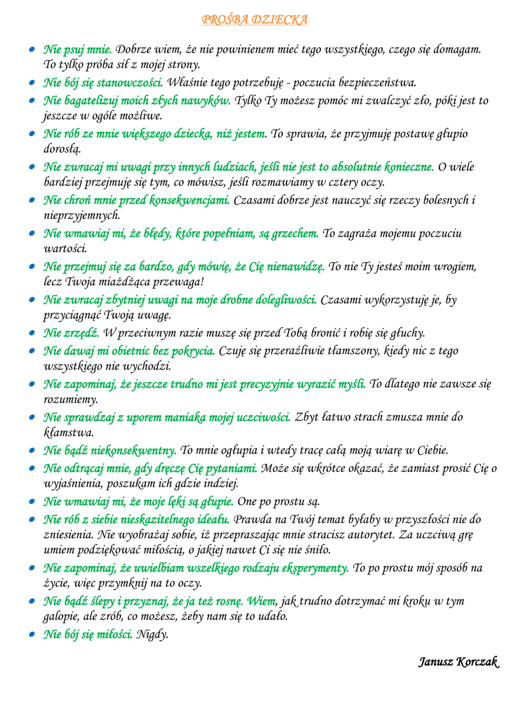 PROŚBA DZIECKA Nie psuj mnie. Dobrze wiem, że nie powinienem mieć tego wszystkiego, czego się domagam. To tylko próba sił z mojej strony. Nie bój się stanowczości. Właśnie tego potrzebuję - poczucia bezpieczeństwa. Nie bagatelizuj moich złych nawyków. Tylko Ty możesz pomóc mi zwalczyć zło, póki jest to jeszcze w ogóle możliwe. Nie rób ze mnie większego dziecka, niż jestem. To sprawia, że przyjmuję postawę głupio dorosłą. Nie zwracaj mi uwagi przy innych ludziach, jeśli nie jest to absolutnie konieczne. O wiele bardziej przejmuję się tym, co mówisz, jeśli rozmawiamy w cztery oczy. Nie chroń mnie przed konsekwencjami. Czasami dobrze jest nauczyć się rzeczy bolesnych i nieprzyjemnych. Nie wmawiaj mi, że błędy, które popełniam, są grzechem. To zagraża mojemu poczuciu wartości. Nie przejmuj się za bardzo, gdy mówię, że Cię nienawidzę. To nie Ty jesteś moim wrogiem, lecz Twoja miażdżąca przewaga! Nie zwracaj zbytniej uwagi na moje drobne dolegliwości. Czasami wykorzystuję je, by przyciągnąć Twoją uwagę. Nie zrzędź. W przeciwnym razie muszę się przed Tobą bronić i robię się głuchy. Nie dawaj mi obietnic bez pokrycia. Czuję się przeraźliwie tłamszony, kiedy nic z tego wszystkiego nie wychodzi. Nie zapominaj, że jeszcze trudno mi jest precyzyjnie wyrazić myśli. To dlatego nie zawsze się rozumiemy. Nie sprawdzaj z uporem maniaka mojej uczciwości. Zbyt łatwo strach zmusza mnie do kłamstwa. Nie bądź niekonsekwentny. To mnie ogłupia i wtedy tracę całą moją wiarę w Ciebie. Nie odtrącaj mnie, gdy dręczę Cię pytaniami. Może się wkrótce okazać, że zamiast prosić Cię o wyjaśnienia, poszukam ich gdzie indziej. Nie wmawiaj mi, że moje lęki są głupie. One po prostu są. Nie rób z siebie nieskazitelnego ideału. Prawda na Twój temat byłaby w przyszłości nie do zniesienia. Nie wyobrażaj sobie, iż przepraszając mnie stracisz autorytet. Za uczciwą grę umiem podziękować miłością, o jakiej nawet Ci się nie śniło. Nie zapominaj, że uwielbiam wszelkiego rodzaju eksperymenty. To po prostu mój sposób na życie, więc przymknij na to oczy. Nie bądź ślepy i przyznaj, że ja też rosnę. Wiem, jak trudno dotrzymać mi kroku w tym galopie, ale zrób, co możesz, żeby nam się to udało. Nie bój się miłości. Nigdy. Janusz Korczak