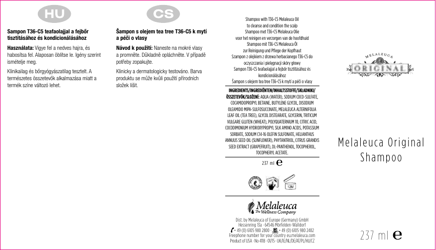 Sampon T36-C5 teafaolajjal a fejbőr tisztításához és kondicionálásához Šampon s olejem tea tree T36-C5 k mytí a péči o vlasy Használata: Vigye fel a nedves hajra, és habosítsa fel. Alaposan öblítse le. Igény szerint ismételje meg. Návod k použití: Naneste na mokré vlasy a promněte. Důkladně opláchněte. V případě potřeby zopakujte. Klinikailag és bőrgyógyászatilag tesztelt. A természetes összetevők alkalmazása miatt a termék színe változó lehet. Klinicky a dermatologicky testováno. Barva produktu se může kvůli použití přírodních složek lišit. Shampoo with T36-C5 Melaleuca Oil to cleanse and condition the scalp Shampoo met T36-C5 Melaleuca Olie voor het reinigen en verzorgen van de hoofdhuid Shampoo mit T36-C5 Melaleuca Öl zur Reinigung und Pflege der Kopfhaut Szampon z olejkiem z drzewa herbacianego T36-C5 do oczyszczania i pielęgnacji skóry głowy Sampon T36-C5 teafaolajjal a fejbőr tisztításához és kondicionálásához Šampon s olejem tea tree T36-C5 k mytí a péči o vlasy INGREDIENTS/INGREDIËNTEN/INHALTSSTOFFE/SKŁADNIKI/ ÖSSZETEVŐK/SLOŽENÍ: AQUA (WATER), SODIUM COCO-SULFATE, COCAMIDOPROPYL BETAINE, BUTYLENE GLYCOL, DISODIUM OLEAMIDO MIPA-SULFOSUCCINATE, MELALEUCA ALTERNIFOLIA LEAF OIL (TEA TREE), GLYCOL DISTEARATE, GLYCERIN, TRITICUM VULGARE GLUTEN (WHEAT), POLYQUATERNIUM 10, CITRIC ACID, COCODIMONIUM HYDROXYPROPYL SILK AMINO ACIDS, POTASSIUM SORBATE, SODIUM C14-16 OLEFIN SULFONATE, HELIANTHUS ANNUUS SEED OIL (SUNFLOWER), PHYTANTRIOL, CITRUS GRANDIS SEED EXTRACT (GRAPEFRUIT), DL-PANTHENOL, TOCOPHEROL, TOCOPHERYL ACETATE. 237 ml Dist. by Melaleuca of Europe (Germany) GmbH Hessenring 13a · 64546 Mörfelden-Walldorf + 49 (0) 6105 980 2800 · + 49 (0) 6105 980 2402 Freephone number for your country eu.melaleuca.com Product of USA · No 4118 · 01/15 · UK/IE/NL/DE/AT/PL/HU/CZ Melaleuca Original S hampoo 2 37 m l PL Shampoo with T36-C5 Melaleuca Oil to cleanse and condition the scalp Directions: Apply to wet hair and lather. Rinse thoroughly. Repeat if desired. Clinically and dermatologically tested. Product colour may vary due to use of natural ingredients. Shampoo met T36-C5 Melaleuca Olie voor het reinigen en verzorgen van de hoofdhuid Gebruiksaanwijzing: In vochtig haar masseren zodat er een dikke schuimlaag ontstaat. Grondig uitspoelen. Herhaal indien gewenst. Kinisch en dermatologisch getest. De kleur van het product kan variëren door de natuurlijke ingrediënten. Shampoo mit T36-C5 Melaleuca Öl zur Reinigung und Pflege der Kopfhaut Anwendung: Auf das nasse Haar auftragen und schaumig massieren. Das Haar gründlich ausspülen. Bei Bedarf wiederholen. Klinisch und dermatologisch getestet. Die Farbe des Produkts kann aufgrund der natürlichen Inhaltsstoffe variieren. Szampon z olejkiem z drzewa herbacianego T36-C5 do oczyszczania i pielęgnacji skóry głowy Sposób użycia: Nałożyć na wilgotne włosy i wmasować w celu uzyskania piany. Dokładnie spłukać. W razie potrzeby powtórzyć. Produkt testowany klinicznie i dermatologicznie. Kolor produktu może się różnić ze względu na zastosowanie naturalnych składników.