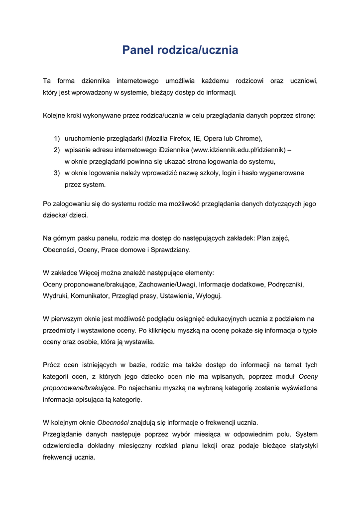 Panel rodzica/ucznia Ta forma dziennika internetowego umożliwia każdemu rodzicowi oraz uczniowi, który jest wprowadzony w systemie, bieżący dostęp do informacji. Kolejne kroki wykonywane przez rodzica/ucznia w celu przeglądania danych poprzez stronę: 1) uruchomienie przeglądarki (Mozilla Firefox, IE, Opera lub Chrome), 2) wpisanie adresu internetowego iDziennika (www.idziennik.edu.pl/idziennik) – w oknie przeglądarki powinna się ukazać strona logowania do systemu, 3) w oknie logowania należy wprowadzić nazwę szkoły, login i hasło wygenerowane przez system. Po zalogowaniu się do systemu rodzic ma możliwość przeglądania danych dotyczących jego dziecka/ dzieci. Na górnym pasku panelu, rodzic ma dostęp do następujących zakładek: Plan zajęć, Obecności, Oceny, Prace domowe i Sprawdziany. W zakładce Więcej można znaleźć następujące elementy: Oceny proponowane/brakujące, Zachowanie/Uwagi, Informacje dodatkowe, Podręczniki, Wydruki, Komunikator, Przegląd prasy, Ustawienia, Wyloguj. W pierwszym oknie jest możliwość podglądu osiągnięć edukacyjnych ucznia z podziałem na przedmioty i wystawione oceny. Po kliknięciu myszką na ocenę pokaże się informacja o typie oceny oraz osobie, która ją wystawiła. Prócz ocen istniejących w bazie, rodzic ma także dostęp do informacji na temat tych kategorii ocen, z których jego dziecko ocen nie ma wpisanych, poprzez moduł Oceny proponowane/brakujące. Po najechaniu myszką na wybraną kategorię zostanie wyświetlona informacja opisująca tą kategorię. W kolejnym oknie Obecności znajdują się informacje o frekwencji ucznia. Przeglądanie danych następuje poprzez wybór miesiąca w odpowiednim polu. System odzwierciedla dokładny miesięczny rozkład planu lekcji oraz podaje bieżące statystyki frekwencji ucznia. W zakładce Więcej – Zachowanie/Uwagi znajdują się informacje o ocenach z zachowania oraz uwagach. Część odnośnie uwag z zachowania zawiera informację o wystawionej ocenie semestralnej i końcowej oraz ewentualne sugestie co do ocen z zachowania, dostępne po kliknięciu w odpowiedni przycisk. Z kolei część okna odnośnie uwag zawiera informacje o rodzaju wystawionej uwagi, dacie wystawienia oraz informacji o imieniu i nazwisku nauczyciela, który wprowadził daną uwagę. Dodatkowo jest również wgląd w statystykę uwag po kliknięciu w odpowiedni przycisk. Każda nowa uwaga jest zaznaczona pogrubioną czcionką i nie widać jej treści – kliknięcie na uwagę przez rodzica wyświetli treść uwagi oraz zmieni czcionkę na zwykłą, co będzie oznaczało przeczytanie uwagi. Następnym modułem są Prace domowe, za pomocą którego rodzic/uczeń ma dostęp do prac domowych przypisanych do klasy. Dodatkowo po kliknięciu na wybraną pracę zostanie wyświetlony jej opis, z możliwością pobrania załączonego pliku. Kolejny moduł to Informacje dodatkowe, w którym znajdują się wszelki informacje na temat wycieczek, wydarzeń klasowych oraz wyników egzaminów OKE. Następny moduł to Plan zajęć/Terminy ferii, w którym rodzic/uczeń ma wgląd w aktualny plan zajęć dla klasy oraz wprowadzone do systemu terminy ferii na aktualny rok szkolny. Kolejny moduł to Sprawdziany, w którym rodzic/uczeń może sprawdzić, jakie są zaplanowane sprawdziany dla klasy na wskazany miesiąc nauki. Podręczniki to moduł, gdzie znajduje się lista podręczników przypisanych do klasy ucznia. Moduł Przegląd prasy daje rodzicom/uczniom dostęp do aktualnego przeglądu prasy. Z kolei ostatnie okno Ustawienia zawiera informacje dotyczące profilu użytkownika, w którym rodzic/uczeń może sam zmienić, nadane mu wcześniej przez system hasło dostępu do systemu.
