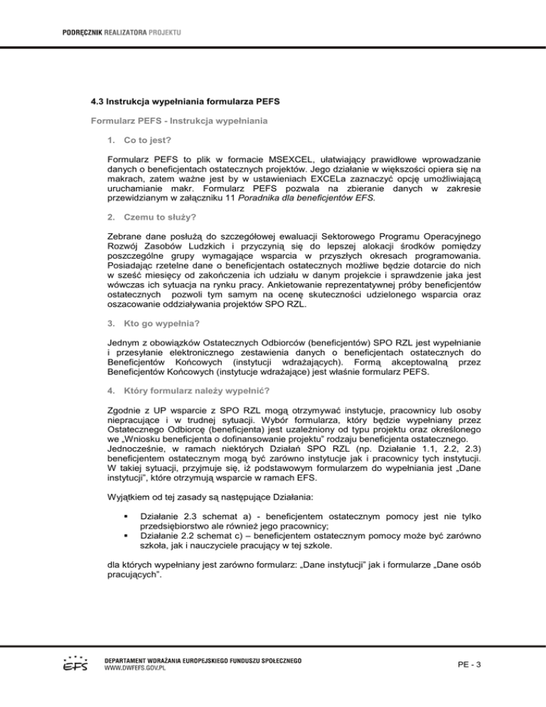 4.3 Instrukcja wypełniania formularza PEFS Formularz PEFS - Instrukcja wypełniania 1. Co to jest? Formularz PEFS to plik w formacie MSEXCEL, ułatwiający prawidłowe wprowadzanie danych o beneficjentach ostatecznych projektów. Jego działanie w większości opiera się na makrach, zatem waŜne jest by w ustawieniach EXCELa zaznaczyć opcję umoŜliwiającą uruchamianie makr. Formularz PEFS pozwala na zbieranie danych w zakresie przewidzianym w załączniku 11 Poradnika dla beneficjentów EFS. 2. Czemu to słuŜy? Zebrane dane posłuŜą do szczegółowej ewaluacji Sektorowego Programu Operacyjnego Rozwój Zasobów Ludzkich i przyczynią się do lepszej alokacji środków pomiędzy poszczególne grupy wymagające wsparcia w przyszłych okresach programowania. Posiadając rzetelne dane o beneficjentach ostatecznych moŜliwe będzie dotarcie do nich w sześć miesięcy od zakończenia ich udziału w danym projekcie i sprawdzenie jaka jest wówczas ich sytuacja na rynku pracy. Ankietowanie reprezentatywnej próby beneficjentów ostatecznych pozwoli tym samym na ocenę skuteczności udzielonego wsparcia oraz oszacowanie oddziaływania projektów SPO RZL. 3. Kto go wypełnia? Jednym z obowiązków Ostatecznych Odbiorców (beneficjentów) SPO RZL jest wypełnianie i przesyłanie elektronicznego zestawienia danych o beneficjentach ostatecznych do Beneficjentów Końcowych (instytucji wdraŜających). Formą akceptowalną przez Beneficjentów Końcowych (instytucje wdraŜające) jest właśnie formularz PEFS. 4. Który formularz naleŜy wypełnić? Zgodnie z UP wsparcie z SPO RZL mogą otrzymywać instytucje, pracownicy lub osoby niepracujące i w trudnej sytuacji. Wybór formularza, który będzie wypełniany przez Ostatecznego Odbiorcę (beneficjenta) jest uzaleŜniony od typu projektu oraz określonego we „Wniosku beneficjenta o dofinansowanie projektu” rodzaju beneficjenta ostatecznego. Jednocześnie, w ramach niektórych Działań SPO RZL (np. Działanie 1.1, 2.2, 2.3) beneficjentem ostatecznym mogą być zarówno instytucje jak i pracownicy tych instytucji. W takiej sytuacji, przyjmuje się, iŜ podstawowym formularzem do wypełniania jest „Dane instytucji”, które otrzymują wsparcie w ramach EFS. Wyjątkiem od tej zasady są następujące Działania: Działanie 2.3 schemat a) - beneficjentem ostatecznym pomocy jest nie tylko przedsiębiorstwo ale równieŜ jego pracownicy; Działanie 2.2 schemat c) – beneficjentem ostatecznym pomocy moŜe być zarówno szkoła, jak i nauczyciele pracujący w tej szkole. dla których wypełniany jest zarówno formularz: „Dane instytucji” jak i formularze „Dane osób pracujących”. PE - 3 5. Kiedy formularz jest wypełniany? Część danych zbierana jest w momencie rozpoczęcia udziału beneficjenta ostatecznego w projekcie (np. dane teleadresowe), pozostałe dane muszą być uzupełnione po zakończeniu udziału beneficjenta ostatecznego w projekcie. Trzeba mieć świadomość, iŜ większość zbieranych danych statystycznych bazuje na deklaracjach beneficjenta ostatecznego. 6. Kiedy formularz jest przekazywany? Ostateczny Odbiorca (beneficjent) składa formularz (elektroniczną wersję) wraz ze sprawozdaniami kwartalnymi i sprawozdaniem końcowym z realizacji projektu. Wersja papierowa nie jest wymagana. Formularz, który składany jest przez Ostatecznego Odbiorcę (beneficjenta) wraz ze sprawozdaniem kwartalnym zawierać powinien dane tylko o tych beneficjentach ostatecznych, którzy zakończyli udział w projekcie w danym kwartale, natomiast formularz składany wraz ze sprawozdaniem końcowym powinien zawierać dane o tych beneficjentach ostatecznych, którzy zakończyli udział w projekcie w okresie od ostatniego sprawozdania kwartalnego do sprawozdania końcowego z realizacji projektu. W przypadku projektów których beneficjentami ostatecznymi są nie tylko instytucje, ale takŜe pracownicy [Działanie 2.2 schemat c) oraz Działanie 2.3 schemat c)] formularz: „Dane instytucji” powinien być przekazywany przez Ostatecznego Odbiorcę (Beneficjenta) po zakończeniu udziału danej instytucji w projekcie; „Dane osób pracujących” powinny być przekazywane wraz ze sprawozdaniami kwartalnymi, analogicznie do pozostały Działań SPO RZL (przekazywane są informacje o pracownikach, którzy zakończyli udział w projekcie w danym kwartale). UWAGI: W przypadku gdy konkretny beneficjent ostateczny uczestniczy w kilku formach wsparcia w ramach danego projektu (np. cyklu szkoleń) i jest to wiadome w momencie przyjęcia do projektu lub przed końcem danej formy wsparcia (np. pod koniec szkolenia beneficjent ostateczny zostaje poinformowany, iŜ będzie uczestniczył w kolejnym szkoleniu w ramach trwającego projektu), Ostateczny Odbiorca (beneficjent) wypełnia tylko jeden formularz EXCEL i przekazuje go do Beneficjenta Końcowego (instytucji wdraŜającej) po zakończeniu ostatniej formy wsparcia (np. ostatniego szkolenia) udzielonego beneficjentowi ostatecznemu. W przypadku gdy konkretny beneficjent ostateczny objęty wcześniej wsparciem (jego dane juŜ zostały przesłane wraz z jednym z wcześniejszych sprawozdań), pojawi się ponownie w projekcie naleŜy wypełnić nowy (za bieŜący kwartał) formularz EXCEL. W formularzu naleŜy uwzględnić wszystkie formy wsparcia, z których korzystał beneficjent ostateczny [wcześniejsze te, które juŜ wcześniej zostały zgłoszone do PEFS oraz nowe wraz z pozostałymi danymi]. Tak przesłane dane zaktualizują (podmienią) poprzednio przesłane do Beneficjenta Końcowego (instytucji wdraŜającej) dane. 7. Po co są listy rozwijane i co zrobić w przypadku, gdy nie ma liście jakiejś pozycji/opcji? Listy rozwijane standaryzują sposób wprowadzania danych, tak by moŜna je później przetwarzać i wyciągać wioski. PE - 4 Część punktów (większość list rozwijanych) stworzona jest na podstawie słowników, istnieje zatem moŜliwość ich modyfikacji i uzupełniania. Jeśli 