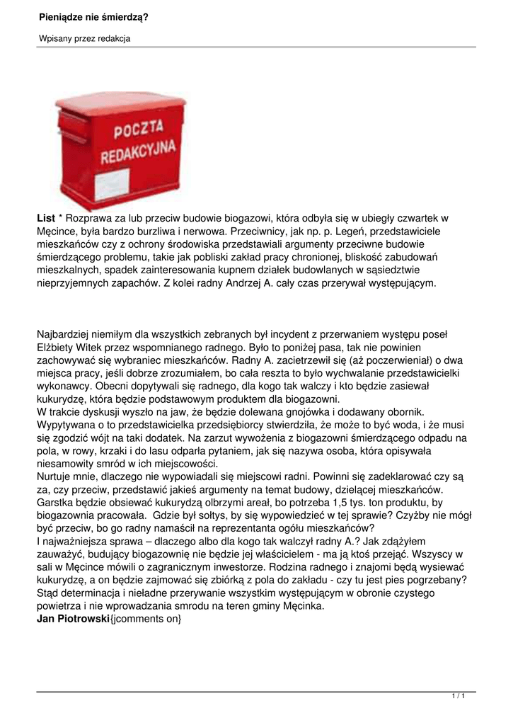 List * Rozprawa za lub przeciw budowie biogazowi, która odbyła się w ubiegły czwartek w