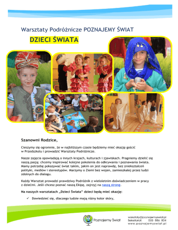 Warsztaty Podróżnicze POZNAJEMY ŚWIAT DZIECI ŚWIATA Szanowni Rodzice, Cieszymy się ogromnie, że w najbliższym czasie będziemy mieć okazję gościć w Przedszkolu i prowadzić Warsztaty Podróżnicze. Nasze zajęcia opowiadają o innych krajach, kulturach i zjawiskach. Pragniemy dzielić się naszą pasją: chcemy inspirować kolejne pokolenia do odkrywania i poznawania świata. Mamy potrzebę pokazywać świat takim, jakim on jest naprawdę, bez zniekształceń polityki, mediów i stereotypów. Marzymy o Ziemi bez wojen, zamieszkałej przez ludzi zdolnych do dialogu. Każdy Warsztat prowadzi prawdziwy Podróżnik z wieloletnim doświadczeniem w pracy z dziećmi. Jeśli chcesz poznać naszą Ekipę, zajrzyj na naszą stronę. Na naszych warsztatach „Dzieci Świata” dzieci będą mieć okazję: Dowiedzieć się, dlaczego ludzie mają różny kolor skóry, Poznać zwyczaje, zabawy i zabawki rówieśników z odległych zakątków globu (jak zapasy Sumo z Japonii, zabawa w workach kawowych z Kolumbii, czy kręcenie kolorowymi bączkami Aborygenów z Australii), Zrobić skakankę, jaką bawią się malgaskie dzieci i poskakać przez nią, Przymierzyć stroje z różnych krajów, np. z Hiszpanii, Chin i Indii, Zaśpiewać piosenkę „Hello to All the Children of the Word” i nauczyć się witać w różnych językach. Aby inspirować i ułatwiać pracę w obszarze edukacji międzykulturowej stworzyliśmy „Kufer Pomysłów” dla Rodziców i Wychowawców. W Kufrze są kolorowanki, muzyka, przepisy kulinarne, „zrób to sam” i przykłady zabaw z różnych krańców świata. Zachęcamy do wspólnej zabawy! Organizujemy również Podróżnicze Urodziny w Warszawie, Krakowie oraz Mielcu. Zadzwoń i zamów przyjęcie dla Twojego Dziecka: Marta: +48 533 886 804, [email protected] Przygotowaliśmy dla Ciebie specjalny rabat o wartości 50 zł. Masz pytanie? Napisz [email protected]. Zapraszamy - polub nas na Facebooku, by na bieżąco mieć informacje o nowych warsztatach i promocjach. Z podróżniczym pozdrowieniem, Magda i Marcin Musiałowie i cały zespół POZNAJEMY ŚWIAT www.poznajemyswiat.pl