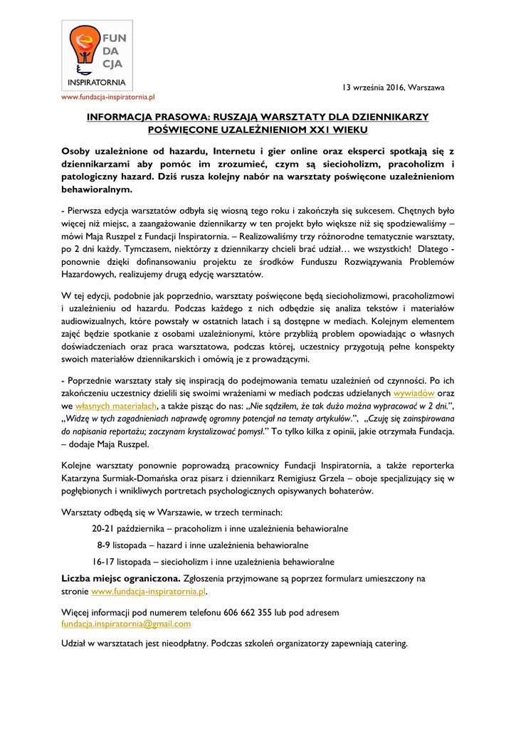 13 września 2016, Warszawa www.fundacja-inspiratornia.pl INFORMACJA PRASOWA: RUSZAJĄ WARSZTATY DLA DZIENNIKARZY POŚWIĘCONE UZALEŻNIENIOM XX1 WIEKU Osoby uzależnione od hazardu, Internetu i gier online oraz eksperci spotkają się z dziennikarzami aby pomóc im zrozumieć, czym są siecioholizm, pracoholizm i patologiczny hazard. Dziś rusza kolejny nabór na warsztaty poświęcone uzależnieniom behawioralnym. - Pierwsza edycja warsztatów odbyła się wiosną tego roku i zakończyła się sukcesem. Chętnych było więcej niż miejsc, a zaangażowanie dziennikarzy w ten projekt było większe niż się spodziewaliśmy – mówi Maja Ruszpel z Fundacji Inspiratornia. – Realizowaliśmy trzy różnorodne tematycznie warsztaty, po 2 dni każdy. Tymczasem, niektórzy z dziennikarzy chcieli brać udział… we wszystkich! Dlatego ponownie dzięki dofinansowaniu projektu ze środków Funduszu Rozwiązywania Problemów Hazardowych, realizujemy drugą edycję warsztatów. W tej edycji, podobnie jak poprzednio, warsztaty poświęcone będą siecioholizmowi, pracoholizmowi i uzależnieniu od hazardu. Podczas każdego z nich odbędzie się analiza tekstów i materiałów audiowizualnych, które powstały w ostatnich latach i są dostępne w mediach. Kolejnym elementem zajęć będzie spotkanie z osobami uzależnionymi, które przybliżą problem opowiadając o własnych doświadczeniach oraz praca warsztatowa, podczas której, uczestnicy przygotują pełne konspekty swoich materiałów dziennikarskich i omówią je z prowadzącymi. - Poprzednie warsztaty stały się inspiracją do podejmowania tematu uzależnień od czynności. Po ich zakończeniu uczestnicy dzielili się swoimi wrażeniami w mediach podczas udzielanych wywiadów oraz we własnych materiałach, a także pisząc do nas: „Nie sądziłem, że tak dużo można wypracować w 2 dni.”, „Widzę w tych zagadnieniach naprawdę ogromny potencjał na tematy artykułów.”, „Czuję się zainspirowana do napisania reportażu; zaczynam krystalizować pomysł.” To tylko kilka z opinii, jakie otrzymała Fundacja. – dodaje Maja Ruszpel. Kolejne warsztaty ponownie poprowadzą pracownicy Fundacji Inspiratornia, a także reporterka Katarzyna Surmiak-Domańska oraz pisarz i dziennikarz Remigiusz Grzela – oboje specjalizujący się w pogłębionych i wnikliwych portretach psychologicznych opisywanych bohaterów. Warsztaty odbędą się w Warszawie, w trzech terminach: 20-21 października – pracoholizm i inne uzależnienia behawioralne 8-9 listopada – hazard i inne uzależnienia behawioralne 16-17 listopada – siecioholizm i inne uzależnienia behawioralne Liczba miejsc ograniczona. Zgłoszenia przyjmowane są poprzez formularz umieszczony na stronie www.fundacja-inspiratornia.pl. Więcej informacji pod numerem telefonu 606 662 355 lub pod adresem [email protected] Udział w warsztatach jest nieodpłatny. Podczas szkoleń organizatorzy zapewniają catering. PROWADZĄCY WARSZTAT Maja Ruszpel – trenerka i Dominika Krzywotulska-Grydlik – kotrenerka z Fundacji Inspiratornia. Katarzyna Surmiak-Domańska – reporterka „Gazety Wyborczej", tutorka w Polskiej Szkole Reportażu przy Instytucie Reportażu, z wykształcenia romanistka. Autorka książek non-fiction, m.in. Mokradełko (książka znalazła się w finale nagrody literackiej NIKE 2013) oraz Ku Klux Klan. Tu mieszka miłość. Obecnie pracuje nad biografią Krzysztofa Kieślowskiego. Remigiusz Grzela - dziennikarz, dramaturg, wykładowca. Absolwent Wydziału Dziennikarstwa i Nauk Politycznych UW. Autor zbiorów wywiadów, m.in. Rozum spokorniał, Wolne, wywiadów-rzek z Barbarą Krafftówną czy z prof. Joanną Penson, książek reporterskich Bagaże Franza K. czyli podróż, której nigdy nie było, Wybór Ireny oraz powieści Bądź moim Bogiem i Złodzieje koni. Nominowany m.in. do nagród Grand Press, im. Barbary N. Łopieńskiej, Newsweeka im. Teresy Torańskiej. Związany z „Gazetą Wyborczą” i „Zwierciadłem”. Współautor dokumentu TVN Polska Pawła Jasienicy. Aktualnie pracuje nad książką Podwójne życie reporterki. Oriana Fallaci - Teresa Torańska. Projekt współfinansowany ze środków Funduszu Rozwiązywania Problemów Hazardowych będących w dyspozycji Ministra Zdrowia Fundacja Inspiratornia powstała w 2010 roku i specjalizuje się w realizacji kampanii społecznych oraz działaniach informacyjnych i edukacyjnych realizowanych w przestrzeni publicznej. Pierwszym takim działaniem było namalowanie graffiti poświęconego uzależnionym - "Leczyć zamiast karać". Zgodzili się na nim wystąpić m.in. Marek Balicki, Wiktor Osiatyński i Tomek Lipiński. Następnym – cykl ponad 30 audycji w Polskim Radio RDC za dyrekcji Ewy Wanat. Jedną z najgłośniejszych akcji Inspiratorni była „Miasto Wciąga” – kampania społeczna połączona z działaniami edukacyjnymi poświęconymi prawu narkotykowemu. Ambienty zrealizowane dla tej akcji to imitacje narkotyków oraz termoaktywne ulotki, które rozmieszczono w klubach nocnych i pubach.