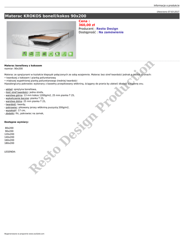 Informacje o produkcie Utworzono 07-03-2017 Materac KROKOS bonell/kokos 90x200 Cena : 360,00 zł Producent : Resto Design Dostępność : Na zamówienie Pr od uc ti o n Materac bonellowy z kokosem rozmiar: 90x200 Materac ze sprężynami w kształcie klepsydr połączonych ze sobą wzajemnie. Materac bez stref twardości jednak o dwóch stronach: • twardszej z kokosem i pianką poliuretanową • miększej wypełnionej pianką poliuretanowąo średniej twardości Hipoalergiczny pokrowiec wykonany z bawełny przepikowany włókniną, ściągany do prania by ułatwić dbałość o higienę snu. ig n - wkład: sprężyna bonellowa, - ilość stref twardości: jedna strefa, - warstwa górna: 13 mm kokos 1200g/m2, 25 mm pianka T 25, - wykończenie boczne: pianka T 25, - warstwa dolna: 25 mm pianka T 25, - twardość: twardy, - pokrowiec: pikowany jersey włókniną puszystą 200g/m2, - wysokość: 17 cm, - dodatki: filc, pokrowiec na zamek, Dostępne wymiary: o D es 80x200 90x200 120x200 140x200 160x200 180x200 R es t LEGENDA: Wygenerowano w programie www.oscGold.com n Pr od uc ti o Czas realizacji zamówienia: ok. 6 tyg. Opcje dostawy:: ZAPYTAJ O KOSZT WYSYŁKI: [email protected] Dostępne opcje Materac KROKOS bonell/kokos 90x200 R es t o D es ig n » Rozmiar: 90x200.