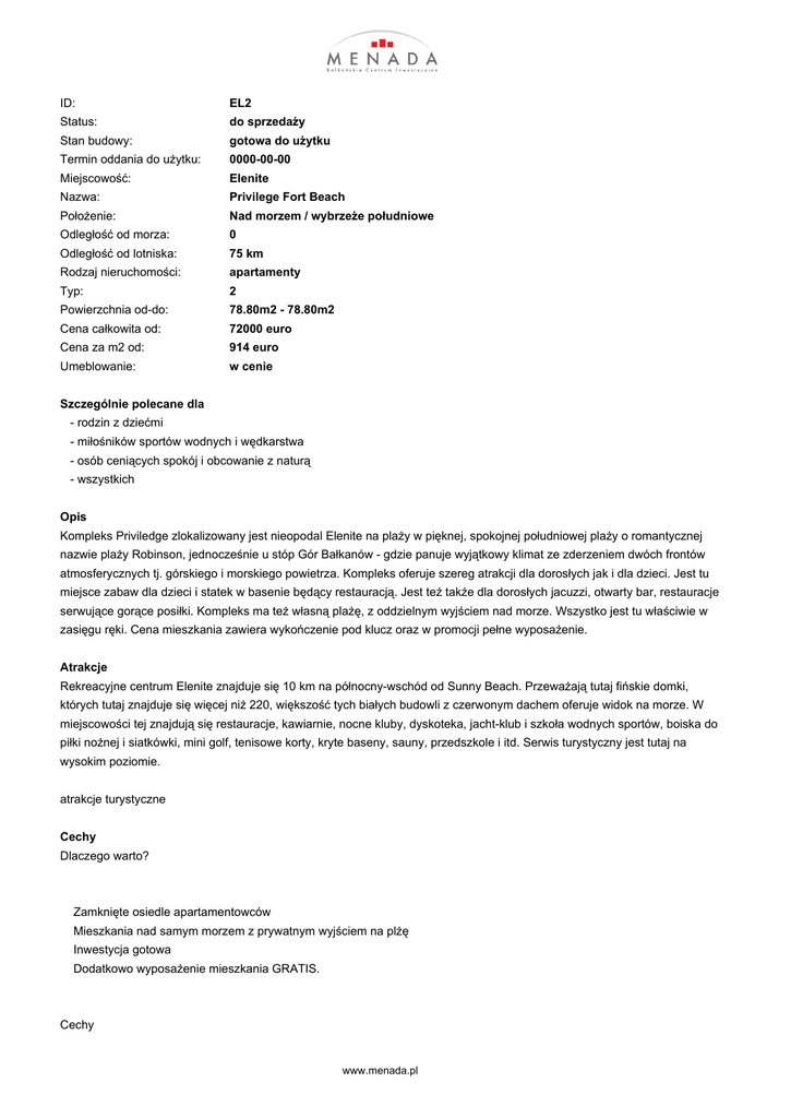 ID: EL2 Status: do sprzedaży Stan budowy: gotowa do użytku Termin oddania do użytku: 0000-00-00 Miejscowość: Elenite Nazwa: Privilege Fort Beach Położenie: Nad morzem / wybrzeże południowe Odległość od morza: 0 Odległość od lotniska: 75 km Rodzaj nieruchomości: apartamenty Typ: 2 Powierzchnia od-do: 78.80m2 - 78.80m2 Cena całkowita od: 72000 euro Cena za m2 od: 914 euro Umeblowanie: w cenie Szczególnie polecane dla - rodzin z dziećmi - miłośników sportów wodnych i wędkarstwa - osób ceniących spokój i obcowanie z naturą - wszystkich Opis Kompleks Priviledge zlokalizowany jest nieopodal Elenite na plaży w pięknej, spokojnej południowej plaży o romantycznej nazwie plaży Robinson, jednocześnie u stóp Gór Bałkanów - gdzie panuje wyjątkowy klimat ze zderzeniem dwóch frontów atmosferycznych tj. górskiego i morskiego powietrza. Kompleks oferuje szereg atrakcji dla dorosłych jak i dla dzieci. Jest tu miejsce zabaw dla dzieci i statek w basenie będący restauracją. Jest też także dla dorosłych jacuzzi, otwarty bar, restauracje serwujące gorące posiłki. Kompleks ma też własną plażę, z oddzielnym wyjściem nad morze. Wszystko jest tu właściwie w zasięgu ręki. Cena mieszkania zawiera wykończenie pod klucz oraz w promocji pełne wyposażenie. Atrakcje Rekreacyjne centrum Elenite znajduje się 10 km na północny-wschód od Sunny Beach. Przeważają tutaj fińskie domki, których tutaj znajduje się więcej niż 220, większość tych białych budowli z czerwonym dachem oferuje widok na morze. W miejscowości tej znajdują się restauracje, kawiarnie, nocne kluby, dyskoteka, jacht-klub i szkoła wodnych sportów, boiska do piłki nożnej i siatkówki, mini golf, tenisowe korty, kryte baseny, sauny, przedszkole i itd. Serwis turystyczny jest tutaj na wysokim poziomie. atrakcje turystyczne Cechy Dlaczego warto? Zamknięte osiedle apartamentowców Mieszkania nad samym morzem z prywatnym wyjściem na plżę Inwestycja gotowa Dodatkowo wyposażenie mieszkania GRATIS. Cechy www.menada.pl Basen z wodnymi atrakcjami, dla dorosłych Jacuzzi Basen dla dzieci z wodną zjeżdżalnią Płynąca rzeka (basen) wzdłuż kompleksu z otwartym barem, oraz barem w wodzie Fitness Sauna Salon piękności Centrum medyczne Supermarket Przedszkole w określonych godzinach Kafejka Restauracja w ogrodzie Prywatna plaża przy kompleksie Parking strzeżony Irish pub Plac zabaw dla dzieci Usługi Nieruchomość jest utrzymywana przez zarządcę w czystości i porządku. Oczywiście deweloper zapewnia zarządzanie obiektem, ochronę obiektu, a także płatności za media w imieniu właściciela. Nasza firma również dba o utrzymanie apartamentu w ciągu roku - Dla naszych Klientów zapewniamy utrzymanie nieruchomości, ochronę 24 h przez cały rok, oświetlenie, bezpieczeństwo elektryczne i wodne, naprawy, sprzątanie i czyszczenie części wspólnych, zieleni, czyszczenie apartamentu czy też płatności rachunków. Uzyskiwanie dodatkowych dochodów z ewentualnego wynajmu apartamentu - Zapewniamy bowiem również organizację wynajmu apartamentu. obsługa posprzedażowa Zasady płatności Plan zapłaty 1000 euro - depozyt - możliwość płatności tydzień po rezerwacji apartamentu W terminie 9 miesięcy należy dokonać wpłaty: 10% - I rata - przy umowie przedwstępnej 10% - II rata - 3 miesiące po podpisaniu umowy przedwstępnej 10% - III rata - 3 miesiące po wpłacie II raty 10% - IV rata - 3 miesiące po podpisaniu III raty pozostałe 60% wartości nieruchomości można opłacić: 1. Do 31.03.2010 roku (bez odsetek) lub też 2. Spłacić wartość nieruchomości poprzez kredyt deweloperski (kredyt od dewelopera) na poniższych warunkach: www.menada.pl w 3 lata - 6,3% w 5 lat - 9,8% w 7 lat - 15,7% w 10 lat - 18,1% Z apartamentu można korzystać już po wpłacie 40%. Akt notarialny podpisywany jest po całkowitej spłacie. Koszty: Cena podana w cenniku jest ostateczna. Należy pamiętać, iż oprócz ceny za nieruchomość dochodzą koszty związane z opłatą notarialną i (jest to około od 3,5% do 4,0% wartości zakupu - w zależności od opcji, którą wybierze Inwestor). Dodatkowo osoby zakupujące apartament w tym kompleksie płacą opłatę za zarządzanie w wysokości 10 euro za m2 za rok z Vat 20% (dane na rok 2009), która obejmuje: zarządzenie terytorium kompleksu; zarządzanie częściami wspólnymi budynku; utrzymaniem basenów; utrzymaniem roślinności; całoroczna ochrona; korzystanie z basenów; elektryczność za części wspólne; Na życzenie klienta za dodatkową opłatą istnieje możliwość: sprzątanie apartamentu przez cały rok; naprawy w apartamencie; opłata bieżących rachunków (podatki, elektryczność, woda etc.) wynajem samochodu; wykończenie apartamentu; inne. www.menada.pl