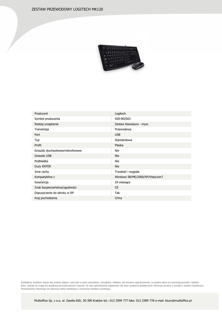 ZESTAW PRZEWODOWY LOGITECH MK120 Producent Logitech Symbol producenta 920-002563 Rodzaj urządzenia Zestaw klawiatura - mysz Transmisja Przewodowa Port USB Typ Standardowa Profil Płaska Gniazdo słuchawkowe/mikrofonowe Nie Gniazdo USB Nie Podkładka Nie Duży ENTER Nie Inne cechy Trwałość i wygoda Kompatybilna z Windows 98/ME/2000/XP/Vista/win7 Gwarancja 24 miesiące Znak bezpieczeństwa/zgodności CE Dopuszczenie do obrotu w RP Tak Kraj pochodzenia Chiny Dokładamy wszelkich starań aby podane zdjęcie i opis były w pełni prawidłowe i kompletne. Niestety, nie możemy zagwarantować, że podane dane nie zawierają pomyłek i błędów, które jednak nie mogą być podstawą do ewentualnych roszczeń. W razie jakichkolwiek wątpliwości lub chęci uzyskania dodatkowych informacji prosimy o kontakt z działem handlowym. Prezentowane informacje nie stanowią oferty handlowej w rozumieniu Kodeksu Cywilnego. Multioffice Sp. z o.o. ul. Zawiła 65D, 30-390 Kraków tel.: 012 2999 777 faks: 012 2999 778 e-mail: [email protected]