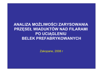 ANALIZA MOŻLIWOŚCI ZARYSOWANIA PRZĘSEŁ WIADUKTÓW NAD FILARAMI PO UCIĄGLENIU BELEK PREFABRYKOWANYCH Zakopane, 2008 r Plan wystąpienia Geneza tematu i skala problemu Podstawowe dane techniczne analizowanych obiektów Stan techniczny Zakres przeprowadzonych analiz Wyniki analizy Uwagi i wnioski końcowe Geneza tematu (1) W latach 70-tych XX wieku wykonano wiele Obiektów z belek prefabrykowanych. Był to tylko element systemu prefabrykacji – nie dopracowano innych elementów, w tym dylatacji. Obiekty z prefabrykowanych belek sprężonych były projektowane na klasę I obciążenia według normy PN-66/B-02015; nośność 30 ton. Belki główne przenoszą obecnie obciążenie klasy C według normy PN-85/S-10030. Geneza tematu (2) Ze względu na zły stan techniczny część z tych obiektów wymaga remontu; przyczyną tego stanu są często nieszczelne dylatacje. Po remoncie obiekt (dźwigary główne) ma mieć nośność odpowiadającą co najmniej klasie B, a płyta pomostu klasie A według PN-85/S-10030 Geneza tematu (3) Jednym ze stosowanych prefabrykatów były belki typu „Płońsk”. W przypadku obiektów wieloprzęsłowych często był stosowany układ przęseł swobodnie podpartych. Belki były opierane na oczepach; „trapezowych” lub tak zwanych „ukrytych”. Wybudowano dziesiątki takich obiektów. Po trzydziestu latach eksploatacji znaczna ich część wymaga remontu ze względu na zły stan techniczny; głównie oczepy i końce belek. Geneza tematu (4) Przyczyną złego stanu były nieszczelne dylatacje. Ze względu na trudny dostęp do miejsc naprawy jej skuteczność i wysoka jakość są trudne do uzyskania. Oddzielny problem to potrzeba zwiększenia nośności przynajmniej do klasy B według PN-91/S-10030. Cele te można osiągnąć przez uciąglenie konstrukcji. W przypadku belek opartych na oczepach „trapezowych” najłatwiej jest zamienić układ przęseł swobodnie podpartych na układ ciągły (belki ciągłe). W przypadku oczepów „ukrytych” najłatwiej jest zmienić układ przęseł (belek) swobodnie podpartych na układ ramowy Podstawowe dane techniczne analizowanych obiektów (1) Analizie poddano obiekty mostowe wykonane z belek prefabrykowanych typu „Płońsk” o rozpiętości przęseł: 15,00, 18,00 i 21,00 m. Przyjęto szerokość obiektu odpowiadającą jezdni o szerokości 7,00 m oraz obustronnym chodnikom dla pieszych o szerokości 1,25 m (typowe obiekty zamiejskie budowane w latach siedemdziesiątych XX wieku). Rozpatrywano obiekty mostowe o dwóch, trzech, czterech i pięciu przęsłach (większa liczba przęseł nie wnosi do analizy nowych elementów). Założono, że analizowane obiekty były wykonane zgodnie z dokumentacją typową. Podstawowe dane techniczne analizowanych obiektów (2) Założono, że uciąglenie zostało wykonane po rozebraniu nawierzchni oraz izolacji. Oznacza to, że belki po uciągleniu są obciążone nawierzchnią i izolacją oraz dodatkową warstwą żelbetową i jej skurczem, a także obciążeniem użytkowym. Ciężar własny belek działa w układzie przęseł swobodnie podpartych. Analizowano możliwość powstania rys prostopadłych od momentów zginających, które mogą powstać w nowej warstwie żelbetowej. Podstawowe dane techniczne analizowanych obiektów (3) Analizę przeprowadzono przy obciążeniu użytkowym klasy A, B i C według normy PN-85/S-10030 [2]. Jako porównawcze przyjęto obciążenie klasy I według PN-66/B-02015 [1], obowiązującej w okresie projektowania i budowy analizowanych obiektów. Założono przy tym, że przy obciążeniu klasy I nośność najbardziej wytężonych belek w przekroju poprzecznym jest w pełni (w 100%) wykorzystana. Ponieważ analizowano stan graniczny użytkowalności, przyjmowano wartości obciążeń charakterystycznych. Podstawowe dane techniczne analizowanych obiektów (4) Zarysowanie sprawdzono według normy PN-91/S-10042 [3]. Jako zmienne przyjęto średnicę i rozstaw prętów zbrojeniowych (przyjęto pręty żebrowane ze stali A-II według PN-91/S-10042 – taka była stosowana w okresie budowy obiektów). Ograniczeniem możliwości wzmocnienia była nośność na zginanie przekrojów przęsłowych oraz nośność strefy ściskanej przekrojów podporowych (przyfilarowych). Podstawowe dane techniczne analizowanych obiektów (5) Rysy powstałe w płycie żelbetowej pomostu są osłonięte przed wymianą masy przez izolację. Z punktu widzenia korozji prętów zbrojeniowych ich szerokość nie jest tak ważna jak rys odsłoniętych, gdy decyduje ona o szybkości karbonatyzacji betonu w otoczeniu prętów zbrojeniowych i tym samym zmniejsza jego właściwości ochronne. Podstawowe dane techniczne analizowanych obiektów (6) Jako dopuszczalną szerokość rysy przyjęto 0,2 mm ze względu na zagrożenie powstania uszkodzeń izolacji przy rysach szerszych. Wzięto przy tym pod uwagę, że w analizowanych przekrojach występuje duża zmienność odkształcenia w stosunku do odkształcenia średniego, gdyż udział obciążeń stałych w obciążeniu całkowitym jest znacznie mniejszy niż gdyby wartość momentów podporowych była zależna także od ciężaru własnego belek. Podstawowe dane techniczne analizowanych obiektów (7) Rozpatrzono dwa sposoby uciąglenia; uciąglenie monolityczne tylko przęseł (powstaje układ belkowy ciągły) oraz monolityczne połączenie przęseł i oczepów filarów (powstaje układ ramowy). Założono przy tym, że sztywność na zginanie przęseł odniesiona do ich rozpiętości jest 2,5 razy większa niż sztywność na zginanie podpór odniesiona do ich wysokości. Potrzebny przekrój zbrojenia wyznaczono z warunku nośności przekrojów podporowych. Stan techniczny Duże zróżnicowanie w różnych częściach obiektu oraz nawet na długości poszczególnych elementów Liczne przecieki i zacieki na końcach przęseł oraz korozja i ubytki betonu w oczepach, a także korozja zbrojenia; przyczyna typowa – nieszczel