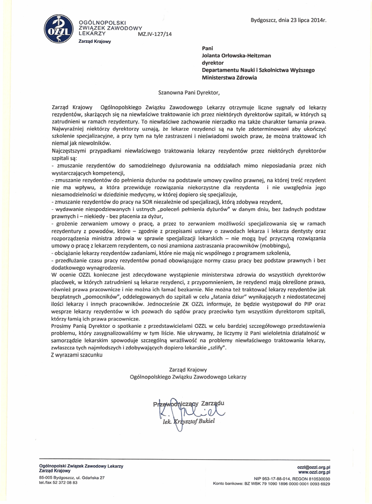 Bydgoszcz, dnia 23 lipca 2014r. OGÓlNOPOLSKI ZWIĄZEK ZAWODOWY LEKARZY MZ.IV-127j14 Zarząd Krajowy Pani Jolanta Orłowska-Heitzman dyrektor Departamentu Ministerstwa Nauki i Szkolnictwa Wyiszego Zdrowia Szanowna Pani Dyrektor, Zarząd Krajowy Ogólnopolskiego Związku Zawodowego lekarzy otrzymuje liczne sygnały od lekarzy rezydentów, skarżących się na niewłaściwe traktowanie ich przez niektórych dyrektorów szpitali, w których są zatrudnieni w ramach rezydentury. To niewłaściwe zachowanie nierzadko ma także charakter łamania prawa. Najwyraźniej niektórzy dyrektorzy uznają, że lekarze rezydenci są na tyle zdeterminowani aby ukończyć szkolenie specjalizacyjne, a przy tym na tyle zastraszeni i nieświadomi swoich praw, że można traktować ich niemal jak niewolników. Najczęstszymi szpitali są: - zmuszanie przypadkami rezydentów niewłaściwego traktowania do samodzielnego dyżurowania lekarzy rezydentów na oddziałach przez mimo niektórych nieposiadania wystarczających kompetencji, - zmuszanie rezydentów do pełnienia dyżurów na podstawie umowy cywilno prawnej, nie ma wpływu, a która przewiduje rozwiązania niekorzystne dla rezydenta niesamodzielności w dziedzinie medycyny, w której dopiero się specjalizuje, dyrektorów przez nich na której treść rezydent i nie uwzględnia jego - zmuszanie rezydentów do pracy na SOR niezależnie od specjalizacji, którą zdobywa rezydent, - wydawanie niespodziewanych i ustnych "poleceń pełnienia dyżurów" w danym dniu, bez żadnych podstaw prawnych i - niekiedy - bez płacenia za dyżur, - grożenie zerwaniem umowy o pracę, a przez to zerwaniem możliwości specjalizowania się w ramach rezydentury z powodów, które - zgodnie z przepisami ustawy o zawodach lekarza i lekarza dentysty oraz rozporządzenia ministra zdrowia w sprawie specjalizacji lekarskich - nie mogą być przyczyną rozwiązania umowy o pracę z lekarzem rezydentem, co nosi znamiona zastraszania pracowników (mobbingu), - obciążanie lekarzy rezydentów zadaniami, które nie mają nic wspólnego z programem szkolenia, - przedłużanie czasu pracy rezydentów ponad obowiązujące normy czasu pracy bez podstaw prawnych i bez dodatkowego wynagrodzenia. W ocenie OZZL konieczne jest zdecydowane wystąpienie ministerstwa zdrowia do wszystkich dyrektorów placówek, w których zatrudnieni są lekarze rezydenci, z przypomnieniem, że rezydenci mają określone prawa, również prawa pracownicze i nie można ich łamać bezkarnie. Nie można też traktować lekarzy rezydentów jak bezpłatnych "pomocników", oddelegowanych do szpitali w celu "łatania dziur" wynikających z niedostatecznej ilości lekarzy i innych pracowników. Jednocześnie ZK OZZl informuje, że będzie występował do PIP oraz wesprze lekarzy rezydentów w ich pozwach do sądów pracy przeciwko tym wszystkim dyrektorom szpitali, którzy łamią ich prawa pracownicze. Prosimy Panią Dyrektor o spotkanie z przedstawicielami OZZL w celu bardziej szczegółowego przedstawienia problemu, który zasygnalizowaliśmy w tym liście. Nie ukrywamy, że liczymy iż Pani wieloletnia działalność w samorządzie lekarskim spowoduje szczególną wrażliwość na problemy niewłaściwego traktowania lekarzy, zwłaszcza tych najmłodszych i zdobywających dopiero lekarskie "szlify". Z wyrazami szacunku Ogólnopolskiego Zarząd Krajowy Związku Zawodowego Lekarzy ptml~~ \j'sztO! j7eic. Ogólnopolski Związek Zawodowy Lekarzy Zarząd Krajowy 85-005 Bydgoszcz, ul. Gdańska 27 tel./fax 52 372 08 83 Bukiel [email protected] www.ozzl.org.pl NIP 953-17-88-014, REGON 810530030 Konto bankowe: BZ WBK 79 1090 1896 00000001 0093 6929