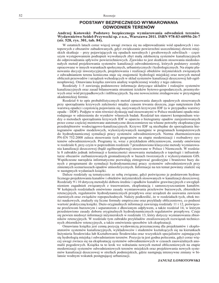 52 Recenzje PODSTAWY BEZPIECZNEGO WYMIAROWANIA ODWODNIEŃ TERENÓW Andrzej Kotowski: Podstawy bezpiecznego wymiarowania odwodnień terenów. Wydawnictwo Seidel-Przywecki sp. z o.o., Warszawa 2011. ISBN 978-83-60956-26-7 (str. 528, rys. 301, tab. 84). W ostatnich latach coraz więcej uwagi zwraca się na odprowadzanie wód opadowych i roztopowych z obszarów zabudowanych, gdyż zwiększanie powierzchni uszczelnionej zlewni miejskich skutkuje ‒ przy pojawiających się opadach nawalnych i gwałtownych odwilżach ‒ częstszym występowaniem podtopień wywołanych zbyt małą zdolnością systemów kanalizacyjnych do odprowadzania spływów powierzchniowych. Zjawisko to jest skutkiem stosowania niedoskonałych metod projektowania systemów kanalizacji odwodnieniowej, których podstawy zostały opracowane w innych warunkach społecznych, urbanistycznych i hydrologicznych. Na etapie planowania decyzji inwestycyjnych, projektowania i realizacji obiektów inżynierskich związanych z odwadnianiem terenu konieczna staje się znajomość hydrologii miejskiej oraz nowych metod obliczeń przewodów i urządzeń wchodzących w skład systemów kanalizacji deszczowej lub ogólnospławnej. Omawiana książka zawiera analizę współczesnej wiedzy z tego zakresu. Rozdziały 1‒5 zawierają podstawowe informacje dotyczące układów i rodzajów systemów kanalizacyjnych oraz zasad bilansowania strumieni ścieków bytowo-gospodarczych, przemysłowych oraz wód przypadkowych i infiltracyjnych. Są one nowocześnie zredagowane w przystępnej akademickiej formie. Rozdział 6 to opis probabilistycznych metod opracowania danych opadowych stosowanych przy sporządzaniu krzywych zależności między czasem trwania deszczu, jego natężeniem (lub warstwą opadu) i częstością pojawiania się, nazywanych krzywymi IDF (a w przypadku warstwy opadu ‒ DDF). Podjęto w nim również dyskusję nad stosowanymi w Polsce modelami opadu miarodajnego w odniesieniu do wyników własnych badań. Rozdział ten stanowi kompendium wiedzy o metodach sporządzania krzywych IDF w oparciu o hietogramy opadów zarejestrowanych przez coraz częściej montowane automatyczne deszczomierze na własne potrzeby eksploatacyjne przedsiębiorstw wodociągowo-kanalizacyjnych. Krzywe IDF są niezbędne do sporządzania hietogramów opadów modelowych, wykorzystywanych następnie w programach komputerowych do hydrodynamicznej symulacji pracy systemów odwodnieniowych. Norma zharmonizowana PN-EN 752:2008 zaleca stosowanie tych programów na etapie modernizacji i rozbudowy systemów odwodnieniowych. Programy te, wraz z przykładem obliczeniowym, zostały omówione w rozdziale 8, przy czym w poprzednim rozdziale 7 przedstawiono klasyczne metody wymiarowania kanalizacji deszczowej (bądź ogólnospławnej) stosowane w Polsce i Niemczech. W rozdziale 8 zabrakło jednak informacji o konieczności stosowania metadanych o topologii i infrastrukturze obszarów zurbanizowanych gromadzonych w bazach tworzonych z wykorzystaniem GIS. Współczesne narzędzia informatyczne pozwalają zintegrować geodezyjne i branżowe bazy danych z programami do symulacji hydrodynamicznej pracy systemów odwodnieniowych przy zmiennych scenariuszach opadów atmosferycznych. Informacje na ten temat powinny znaleźć się w następnych wydaniach książki. Dalsze rozdziały są tematycznie ze sobą związane, gdyż poświęcono je podstawom hydraulicznego projektowania kanałów i obiektów inżynierskich stosowanych w kanalizacji deszczowej. Rozdziały 9 i 10 dotyczą metodyki doboru średnic i spadków kanałów grawitacyjnych z uwzględnieniem zagadnień związanych z trasowaniem, eksploatacją i samooczyszczaniem kanałów. W kolejnych rozdziałach omówiono zasady wymiarowania przelewów burzowych, zbiorników retencyjnych, regulatorów hydrodynamicznych przepływu oraz urządzeń do usuwania zawiesin ziarnistych oraz związków ropopochodnych. Należy podkreślić, że w rozdziałach tych, obok treści naukowych, znalazły się liczne formuły empiryczne oraz przykłady obliczeniowe, co podnosi wartość praktyczną książki. Dużo oryginalnych informacji zawierają rozdziały 11 i 12, poświęcone przelewom burzowym i separatorom z dławionym odpływem, a także rozdział 14, w którym przedstawiono zasady doboru oryginalnych hydrodynamicznych regulatorów przepływu. Czuje się pewien niedosyt informacji inżynierskich w rozdziale 13, który dotyczy wymiarowania zbiorników retencyjnych. W rozdziale tym zabrakło przykładów zrealizowanych rozwiązań technicznych zbiorników retencyjnych, a także omówienia sposobów ich eksploatacji. Omawiana książka jest cenną pozycją wydawniczą przeznaczoną dla projektantów i eksploatatorów systemów kanalizacyjnych, wykładowców i studentów kształcących się na kierunkach Inżynieria Środowiska lub Kształtowanie Środowiska oraz wszystkich specjalistów zajmujących się hydrologią miejską i odwadnianiem terenów. Pozycja ta jest godna polecenia, gdyż coraz więcej uwagi zwraca się na eksploatację systemów odwodnieniowych w czasach zauważalnych anomalii pogodowych. Książka ta to krok we wdrażaniu nowych metod obliczeniowych na etapie modernizacji systemów odwodnieniowych terenów miejskich oraz projektowania nowych systemów kanalizacji deszczowej w strefach podmiejskich, gdzie następują intensywne zmiany w bilansie wodnym wskutek postępującej urbanizacji. JANUSZ ŁOMOTOWSKI
