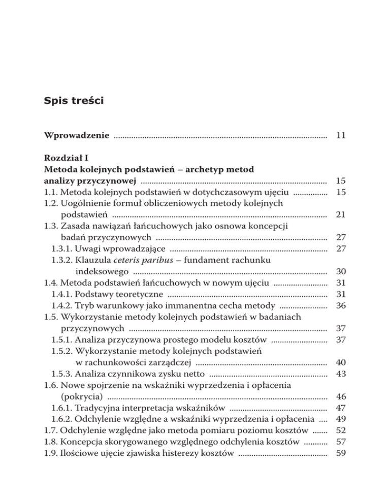 Spis treści Wprowadzenie ................................................................................................. 11 Rozdział I Metoda kolejnych podstawień – archetyp metod analizy przyczynowej ..................................................................................... 1.1. Metoda kolejnych podstawień w dotychczasowym ujęciu ................ 1.2. Uogólnienie formuł obliczeniowych metody kolejnych podstawień .................................................................................................. 1.3. Zasada nawiązań łańcuchowych jako osnowa koncepcji badań przyczynowych .............................................................................. 1.3.1. Uwagi wprowadzające ........................................................................ 1.3.2. Klauzula ceteris paribus – fundament rachunku indeksowego ........................................................................................ 1.4. Metoda podstawień łańcuchowych w nowym ujęciu ......................... 1.4.1. Podstawy teoretyczne ......................................................................... 1.4.2. Tryb warunkowy jako immanentna cecha metody ...................... 1.5. Wykorzystanie metody kolejnych podstawień w badaniach przyczynowych .......................................................................................... 1.5.1. Analiza przyczynowa prostego modelu kosztów .......................... 1.5.2. Wykorzystanie metody kolejnych podstawień w rachunkowości zarządczej ............................................................ 1.5.3. Analiza czynnikowa zysku netto ...................................................... 1.6. Nowe spojrzenie na wskaźniki wyprzedzenia i opłacenia (pokrycia) .................................................................................................... 1.6.1. Tradycyjna interpretacja wskaźników ............................................. 1.6.2. Odchylenie względne a wskaźniki wyprzedzenia i opłacenia .... 1.7. Odchylenie względne jako metoda pomiaru poziomu kosztów ....... 1.8. Koncepcja skorygowanego względnego odchylenia kosztów ........... 1.9. Ilościowe ujęcie zjawiska histerezy kosztów ......................................... 15 15 21 27 27 30 31 31 36 37 37 40 43 46 47 49 52 57 59 4 Spis treści Rozdział II Podstawowe propozycje metodyczne dotyczące badań przyczynowych .................................................................................... 65 2.1. Charakterystyka metody różnic cząstkowych oraz metody wskaźnikowej ............................................................................................. 65 2.2. Metoda różnic cząstkowych – ujęcie tradycyjne ................................ 67 2.3. Interpretacja odchyleń cząstkowych w dotychczasowym rozumieniu .................................................................................................. 69 2.4. Problemy interpretacyjne metody różnic cząstkowych ..................... 71 2.5. Metoda trzech odchyleń ........................................................................... 75 2.5.1. Krytyczna ocena interpretacji graficznej metody trzech odchyleń ............................................................................................... 77 2.5.2. Formuła interpretacyjna a formuła obliczeniowa ......................... 81 2.5.3. Próba wyjaśnienia istoty odchyleń cząstkowych ........................... 84 2.6. Metoda funkcyjna ...................................................................................... 87 2.7. Metoda krzyżowych podstawień ............................................................ 91 2.8. Metoda „trzech wag” ................................................................................. 95 2.8.1. Podstawy teoretyczne ......................................................................... 95 2.8.2. Znajdowanie odchyleń cząstkowych za pomocą metody „trzech wag” ......................................................................................... 98 2.9. Metoda całkowa ......................................................................................... 99 2.10. Ekwiwalentność wybranych metod badań przyczynowych ............ 101 2.11. Propozycje modyfikacji formuł obliczeniowych wybranych metod ........................................................................................................ 106 2.11.1. Próba uproszczenia procedury metody krzyżowych podstawień .......................................................................................... 106 2.11.2. Propozycja modyfikacji metody kolejnych podstawień – tzw. podwójna metoda kolejnych podstawień ............................. 108 2.11.3. Próby modyfikacji metody funkcyjnej .......................................... 109 2.12. Metoda dzielenia na połowy ................................................................. 116 2.12.1. Podstawy teoretyczne ...................................................................... 116 2.12.2. Praktyczne zastosowanie metody dzielenia na połowy ............. 123 2.12.3. Kroki obliczeniowe metody dzielenia na połowy w ujęciu macierzowym .................................................................................... 128 2.13. Zmodyfikowana metoda różnic cząstkowych ................................... 130 Spis treści Rozdział III Metoda logarytmiczna i jej pochodne ...................................................... 3.1. Uwagi wstępne ........................................................................................... 3.2. Metoda proporcjonalnego podziału odchyleń (metoda Kilara) ....... 3.3. Znowelizowana metoda współczynnikowa Bardelego ...................... 3.4. Prosty opis metody logarytmicznej ....................................................... 3.5. Metoda logarytmiczna – podejście tradycyjne ................................... 3.6. Aksjomatyzacja metody logarytmicznej ...........