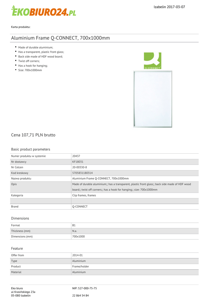 Izabelin 2017-03-07 Karta produktu: Aluminium Frame Q-CONNECT, 700x1000mm Made of durable aluminium; Has a transparent, plastic front glass; Back side made of HDF wood board; Twist off corners; Has a hook for hanging; Size: 700x1000mm Cena 107,71 PLN brutto Basic product parameters Numer produktu w systemie 20437 Nr dostawcy KF18031 Nr Celcen 20-00330-8 Kod kreskowy 5705831180314 Nazwa produktu Aluminium Frame Q-CONNECT, 700x1000mm Opis Made of durable aluminium;; has a transparent, plastic front glass;; back side made of HDF wood board;; twist off corners;; has a hook for hanging;; size: 700x1000mm Kategoria Clip frames, frames Brand Q-CONNECT Dimensions Format B1 Thickness (mm) N.a. Dimensions (mm) 700x1000 Feature Offer from 2014-01 Type Aluminium Product Frame/holder Material Aluminium Eko biuro ul Krasińskiego 23a 05-080 Izabelin NIP: 527-000-75-75 22 864 54 84 Izabelin 2017-03-07 Karta katalogowa produktu cd. Aluminium Frame Q-CONNECT, 700x1000mm Procurement vocabulary CPV 39298100-8 Ramki do fotografii Certifications New product Standard Hit Standard Colour Colour Silver Pozostałe zdjęcia produktu Serdecznie zapraszamy do współpracy Eko biuro zespół. Eko biuro ul Krasińskiego 23a 05-080 Izabelin NIP: 527-000-75-75 22 864 54 84