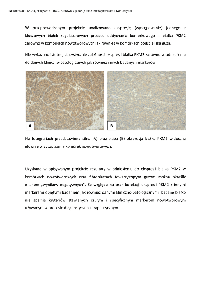 Nr wniosku: 188334, nr raportu: 11673. Kierownik (z rap.): lek. Christopher Kamil Kobierzycki W przeprowadzonym projekcie analizowano ekspresję (występowanie) jednego z kluczowych białek regulatorowych procesu oddychania komórkowego – białka PKM2 zarówno w komórkach nowotworowych jak również w komórkach podścieliska guza. Nie wykazano istotnej statystycznie zależności ekspresji białka PKM2 zarówno w odniesieniu do danych kliniczno-patologicznych jak również innych badanych markerów. A B Na fotografiach przedstawiona silna (A) oraz słaba (B) ekspresja białka PKM2 widoczna głównie w cytoplazmie komórek nowotworowych. Uzyskane w opisywanym projekcie rezultaty w odniesieniu do ekspresji białka PKM2 w komórkach nowotworowych oraz fibroblastach towarzyszącym guzom można określić mianem „wyników negatywnych”. Ze względu na brak korelacji ekspresji PKM2 z innymi markerami objętymi badaniem jak również danymi kliniczno-patologicznymi, badane białko nie spełnia kryteriów stawianych czułym i specyficznym markerom nowotworowym używanym w procesie diagnostyczno-terapeutycznym.