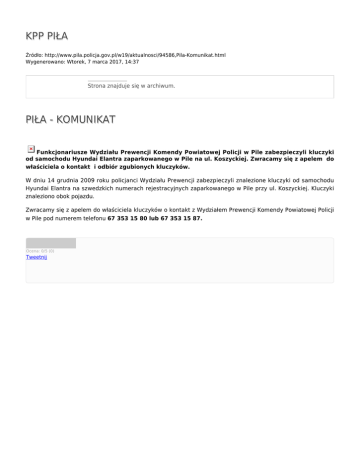 KPP PIŁA Źródło: http://www.pila.policja.gov.pl/w19/aktualnosci/94586,Pila-Komunikat.html Wygenerowano: Wtorek, 7 marca 2017, 14:37 Strona znajduje się w archiwum. PIŁA - KOMUNIKAT Funkcjonariusze Wydziału Prewencji Komendy Powiatowej Policji w Pile zabezpieczyli kluczyki od samochodu Hyundai Elantra zaparkowanego w Pile na ul. Koszyckiej. Zwracamy się z apelem do właściciela o kontakt i odbiór zgubionych kluczyków. W dniu 14 grudnia 2009 roku policjanci Wydziału Prewencji zabezpieczyli znalezione kluczyki od samochodu Hyundai Elantra na szwedzkich numerach rejestracyjnych zaparkowanego w Pile przy ul. Koszyckiej. Kluczyki znaleziono obok pojazdu. Zwracamy się z apelem do właściciela kluczyków o kontakt z Wydziałem Prewencji Komendy Powiatowej Policji w Pile pod numerem telefonu 67 353 15 80 lub 67 353 15 87. Ocena: 0/5 (0) Tweetnij