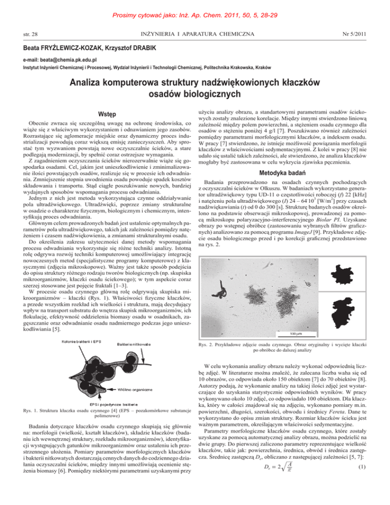 Prosimy cytować jako: Inż. Ap. Chem. 2011, 50, 5, 28-29 INŻYNIERIA I APARATURA CHEMICZNA str. 28 Nr 5/2011 Beata FRYŹLEWICZ-KOZAK, Krzysztof DRABIK e-mail: [email protected] Instytut Inżynierii Chemicznej i Procesowej, Wydział Inżynierii i Technologii Chemicznej, Politechnika Krakowska, Kraków Analiza komputerowa struktury nadźwiękowionych kłaczków osadów biologicznych Wstęp Obecnie zwraca się szczególną uwagę na ochronę środowiska, co wiąże się z właściwym wykorzystaniem i odnawianiem jego zasobów. Rozrastające się aglomeracje miejskie oraz dynamiczny proces industrializacji powodują coraz większą emisję zanieczyszczeń. Aby sprostać tym wyzwaniom powstają nowe oczyszczalnie ścieków, a stare podlegają modernizacji, by spełnić coraz ostrzejsze wymagania. Z zagadnieniem oczyszczania ścieków nierozerwalnie wiąże się gospodarka osadami. Cel, jakim jest unieszkodliwienie i zminimalizowanie ilości powstających osadów, realizuje się w procesie ich odwadniania. Zmniejszenie stopnia uwodnienia osadu powoduje spadek kosztów składowania i transportu. Stąd ciągłe poszukiwanie nowych, bardziej wydajnych sposobów wspomagania procesu odwadniania. Jednym z nich jest metoda wykorzystująca czynne oddziaływanie pola ultradźwiękowego. Ultradźwięki, poprzez zmiany strukturalne w osadzie o charakterze fizycznym, biologicznym i chemicznym, intensyfikują proces odwadniania. Głównym celem prowadzonych badań jest ustalenie optymalnych parametrów pola ultradźwiękowego, takich jak zależności pomiędzy natężeniem i czasem nadźwiękowienia, a zmianami strukturalnymi osadu. Do określenia zakresu użyteczności danej metody wspomagania procesu odwadniania wykorzystuje się różne techniki analizy. Istotną rolę odgrywa rozwój techniki komputerowej umożliwiający integrację nowoczesnych metod (specjalistyczne programy komputerowe) z klasycznymi (zdjęcia mikroskopowe). Ważny jest także sposób podejścia do opisu struktury różnego rodzaju tworów biologicznych (np. skupiska mikroorganizmów, kłaczki osadu ściekowego); w tym aspekcie coraz szerzej stosowane jest pojęcie fraktali [1–3]. W procesie osadu czynnego główną rolę odgrywają skupiska mikroorganizmów – kłaczki (Rys. 1). Właściwości fizyczne kłaczków, a przede wszystkim rozkład ich wielkości i struktura, mają decydujący wpływ na transport substratu do wnętrza skupisk mikroorganizmów, ich flokulację, efektywność oddzielenia biomasy osadu w osadnikach, zagęszczanie oraz odwadnianie osadu nadmiernego podczas jego unieszkodliwiania [5]. użyciu analizy obrazu, a standartowymi parametrami osadów ściekowych zostały znalezione korelacje. Między innymi stwierdzono liniową zależność między polem powierzchni, a stężeniem osadu czynnego dla osadów o stężeniu poniżej 4 g/l [7]. Poszukiwano również zależności pomiędzy parametrami morfologicznymi kłaczków, a indeksem osadu. W pracy [7] stwierdzono, że istnieje możliwość powiązania morfologii kłaczków z właściwościami sedymentacyjnymi. Z kolei w pracy [8] nie udało się ustalić takich zależności, ale stwierdzono, że analiza kłaczków mogłaby być zastosowana w celu wykrycia zjawiska pęcznienia. Metodyka badań Badania przeprowadzono na osadach czynnych pochodzących z oczyszczalni ścieków w Olkuszu. W badaniach wykorzystano generator ultradźwiękowy typu UD-11 o częstotliwości roboczej (f) 22 [kHz] . 3 2 i natężeniu pola ultradźwiękowego (I) 24 – 64 10 [W/m ] przy czasach nadźwiękawiania (t) od 0 do 300 [s]. Strukturę badanych osadów określono na podstawie obserwacji mikroskopowej, prowadzonej za pomocą mikroskopu polaryzacyjno-interferencyjnego Biolar PI. Uzyskane obrazy po wstępnej obróbce (zastosowaniu wybranych filtrów graficznych) analizowano za pomocą programu ImageJ [9]. Przykładowe zdjęcie osadu biologicznego przed i po korekcji graficznej przedstawiono na rys. 2. Rys. 2. Przykładowe zdjęcie osadu czynnego. Obraz oryginalny i wycięte kłaczki po obróbce do dalszej analizy Rys. 1. Struktura kłaczka osadu czynnego [4] (EPS – pozakomórkowe substancje polimerowe) Badania dotyczące kłaczków osadu czynnego skupiają się głównie na: morfologii (wielkość, kształt kłaczków), składzie kłaczków (badaniu ich wewnętrznej struktury, rozkładu mikroorganizmów), identyfikacji występujących gatunków mikroorganizmów oraz ustaleniu ich przestrzennego ułożenia. Pomiary parametrów morfologicznych kłaczków i bakterii nitkowatych dostarczają cennych danych do codziennego działania oczyszczalni ścieków, między innymi umożliwiają ocenienie stężenia biomasy [6]. Pomiędzy niektórymi parametrami uzyskanymi przy W celu wykonania analizy obrazu należy wykonać odpowiednią liczbę zdjęć. W literaturze można znaleźć, że zalecana liczba waha się od 10 obrazów, co odpowiada około 150 obiektom [7] do 70 obiektów [8]. Autorzy podają, że wykonanie analizy na takiej ilości zdjęć jest wystarczające do uzyskania statystycznie odpowiednich wyników. W pracy wykonywano około 10 zdjęć, co odpowiadało 100 obiektom. Dla kłaczka, który w całości znajdował się na zdjęciu, wykonano pomiary m.in. powierzchni, długości, szerokości, obwodu i średnicy Fereta. Dane te wykorzystano do opisu zmian struktury. Rozmiar kłaczków ścieku jest ważnym parametrem, określającym właściwości sedymentacyjne. Parametry morfologiczne kłaczków osadu czynnego, które zostały uzyskane za pomocą automatycznej analizy obrazu, można podzielić na dwie grupy. Do pierwszej zaliczono parametry reprezentujące wielkość kłaczków, takie jak: powierzchnia, średnica, obwód i średnica zastępcza. Średnicę zastępczą De, obliczano z następującej zależności [5, 7]: (1) De = 2 A r Prosimy cytować jako: Inż. Ap. Chem. 2011, 50, 5, 28-29 INŻYNIERIA I APARATURA CHEMICZNA Nr 5/2011 Do drugiej grupy parametrów morfologicznych zalicza