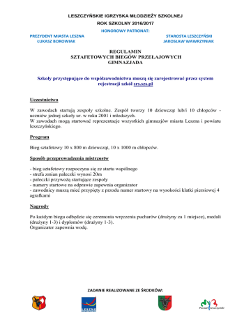 LESZCZYŃSKIE IGRZYSKA MŁODZIEŻY SZKOLNEJ ROK SZKOLNY 2016/2017 HONOROWY PATRONAT: PREZYDENT MIASTA LESZNA ŁUKASZ BOROWIAK STAROSTA LESZCZYŃSKI JAROSŁAW WAWRZYNIAK REGULAMIN SZTAFETOWYCH BIEGÓW PRZEŁAJOWYCH GIMNAZJADA Szkoły przystępujące do współzawodnictwa muszą się zarejestrować przez system rejestracji szkół srs.szs.pl Uczestnictwo W zawodach startują zespoły szkolne. Zespół tworzy 10 dziewcząt lub/i 10 chłopców uczniów jednej szkoły ur. w roku 2001 i młodszych. W zawodach mogą startować reprezentacje wszystkich gimnazjów miasta Leszna i powiatu leszczyńskiego. Program Bieg sztafetowy 10 x 800 m dziewcząt, 10 x 1000 m chłopców. Sposób przeprowadzenia mistrzostw - bieg sztafetowy rozpoczyna się ze startu wspólnego - strefa zmian pałeczki wynosi 20m - pałeczki przywożą startujące zespoły - numery startowe na odprawie zapewnia organizator - zawodnicy muszą mieć przypięty z przodu numer startowy na wysokości klatki piersiowej 4 agrafkami Nagrody Po każdym biegu odbędzie się ceremonia wręczenia pucharów (drużyny za 1 miejsce), medali (drużyny 1-3) i dyplomów (drużyny 1-3). Organizator zapewnia wodę. ZADANIE REALIZOWANE ZE ŚRODKÓW:
